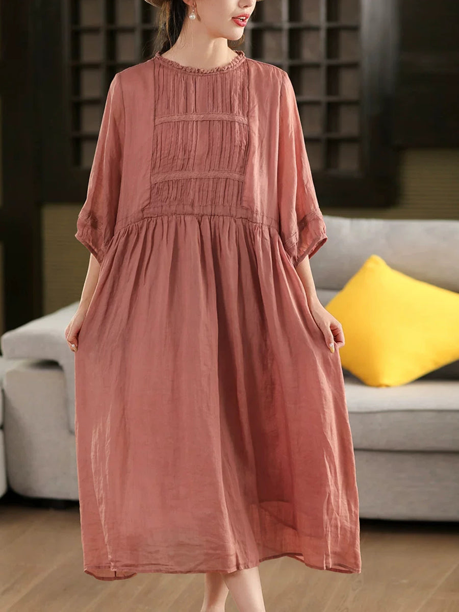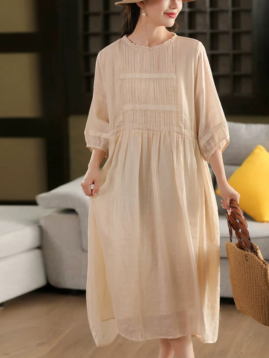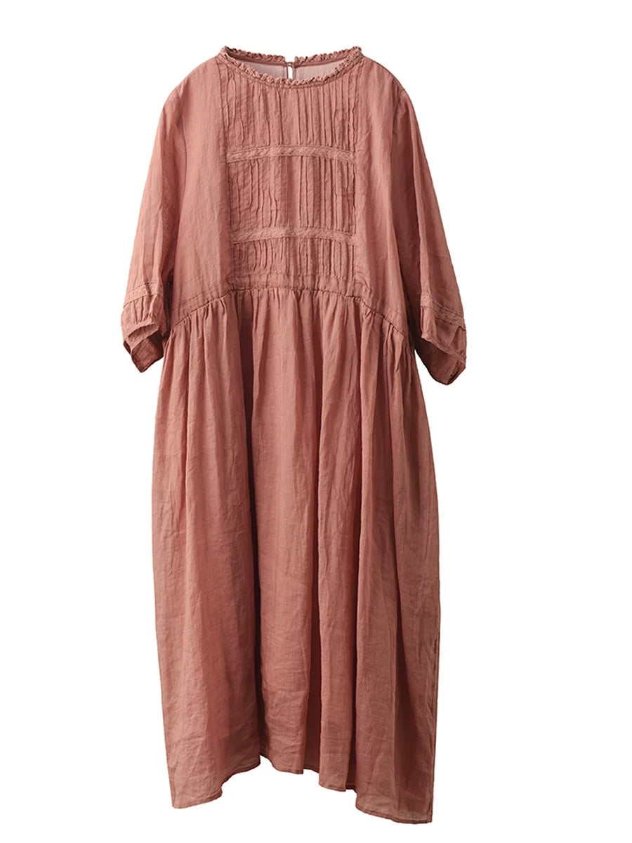 Women Summer Artsy 100%Ramie O-Neck Dress