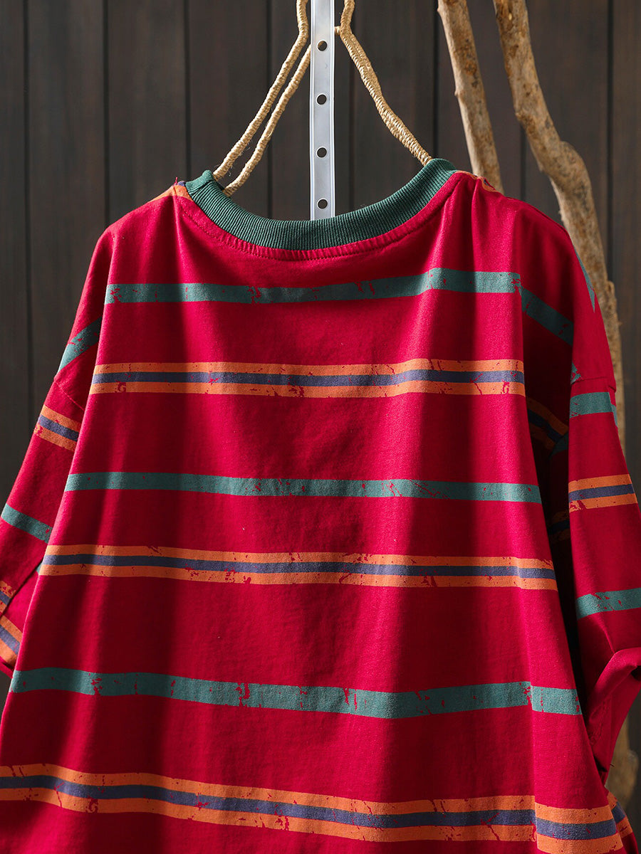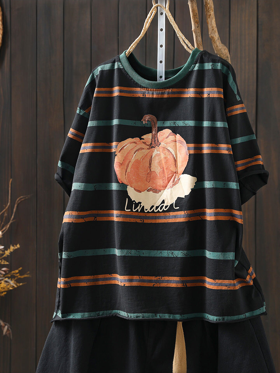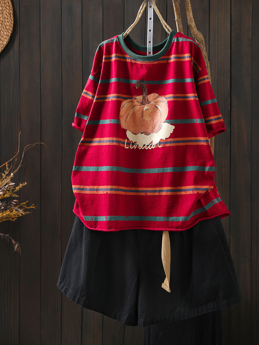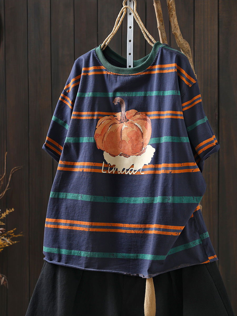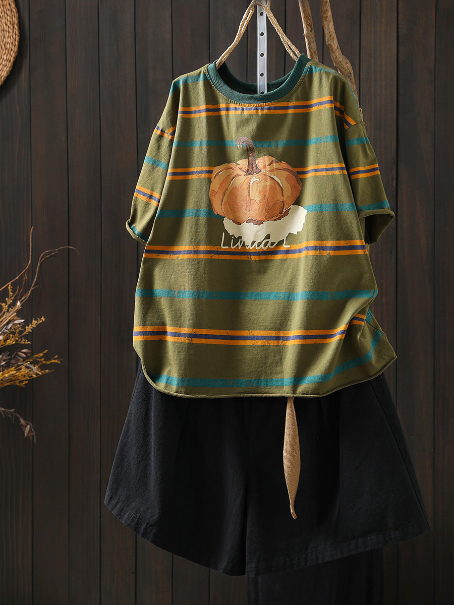 Women Summer Artsy Cotton Pumpkin Stripe O-Neck Shirt