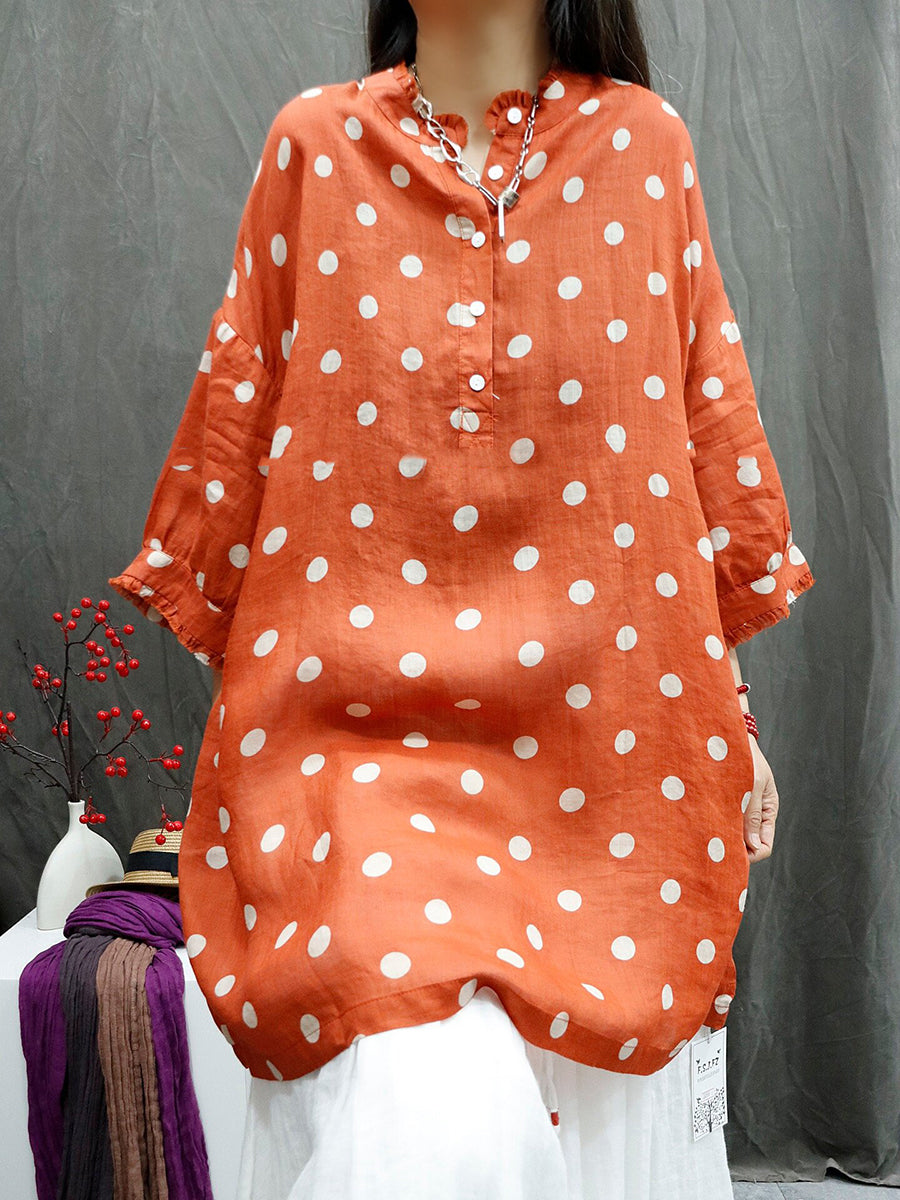Women Summer Artsy Dot O-Neck 100%Ramie Shirt