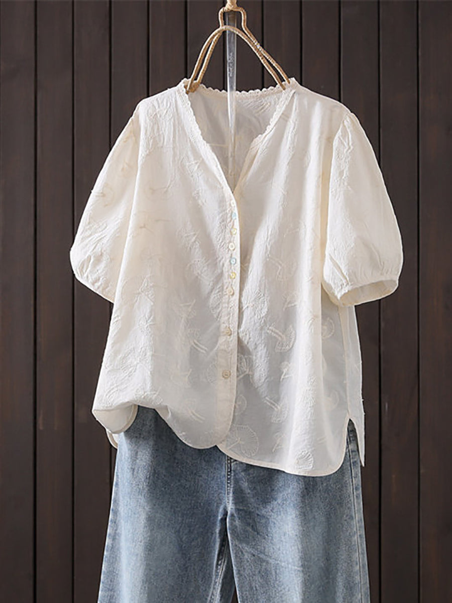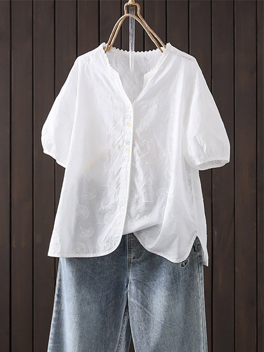 Women Summer Artsy Embroidery V-Neck 100%Cotton Shirt