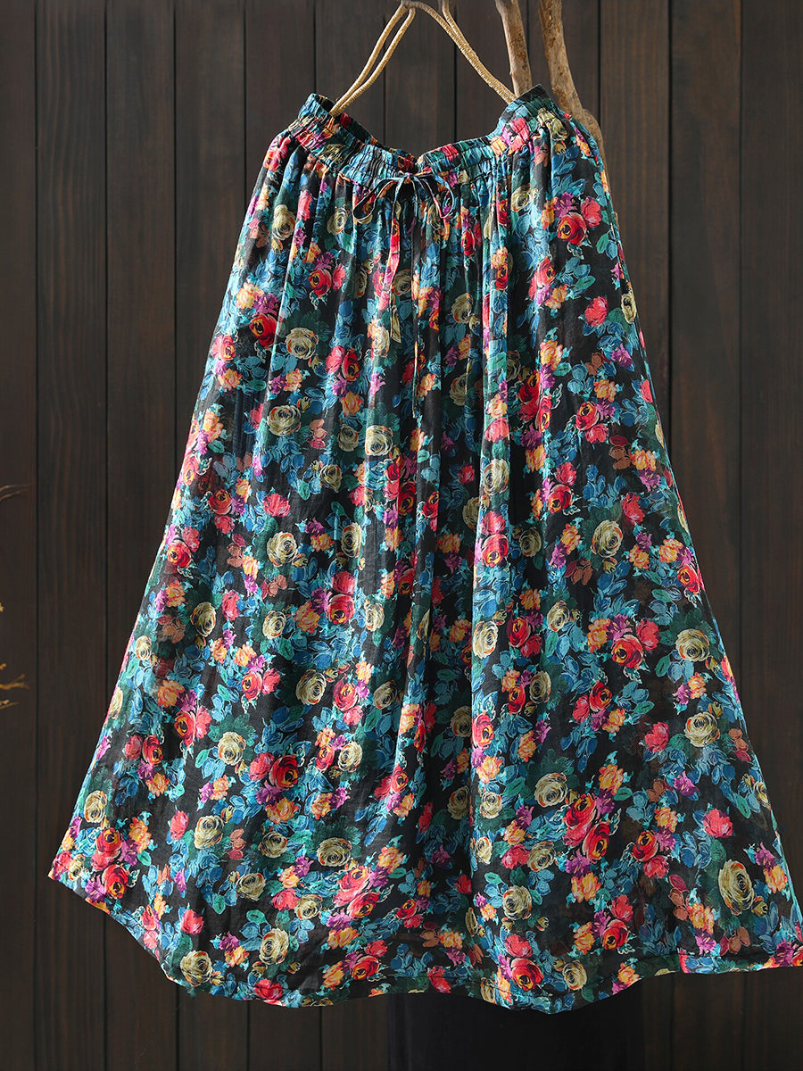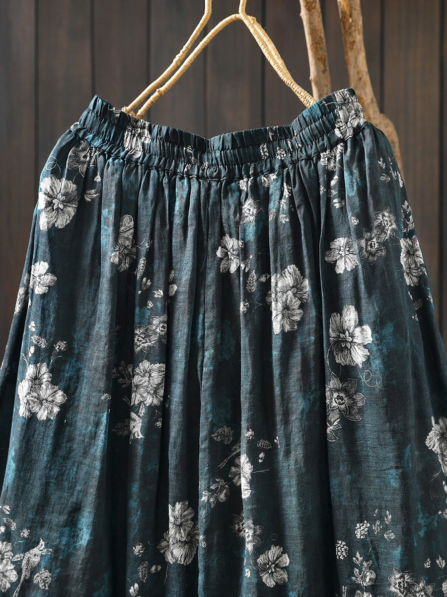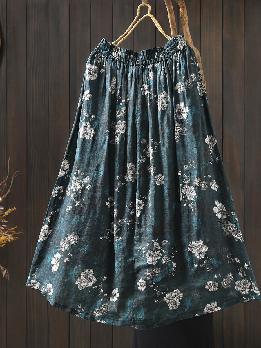Women Summer Artsy Flower 100%Ramie A-Shape Skirt