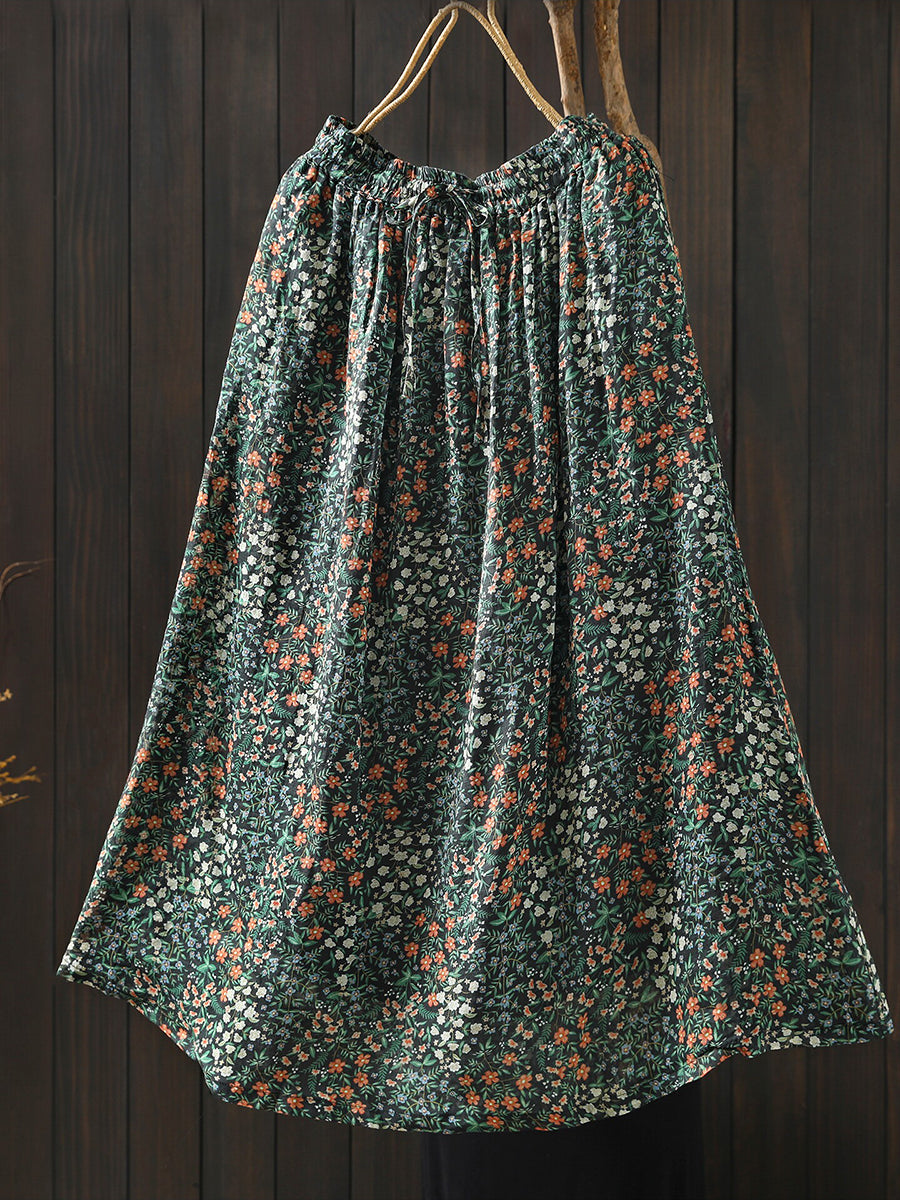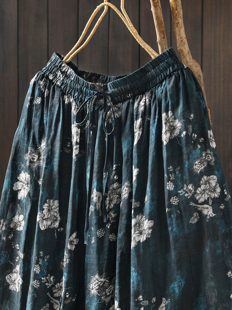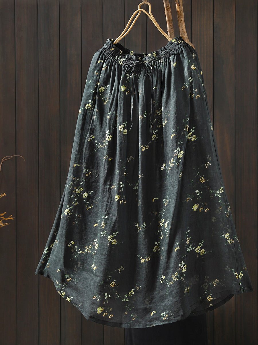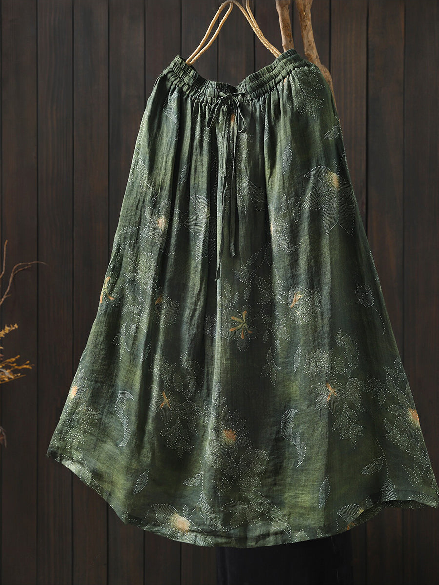 Women Summer Artsy Flower 100%Ramie A-Shape Skirt