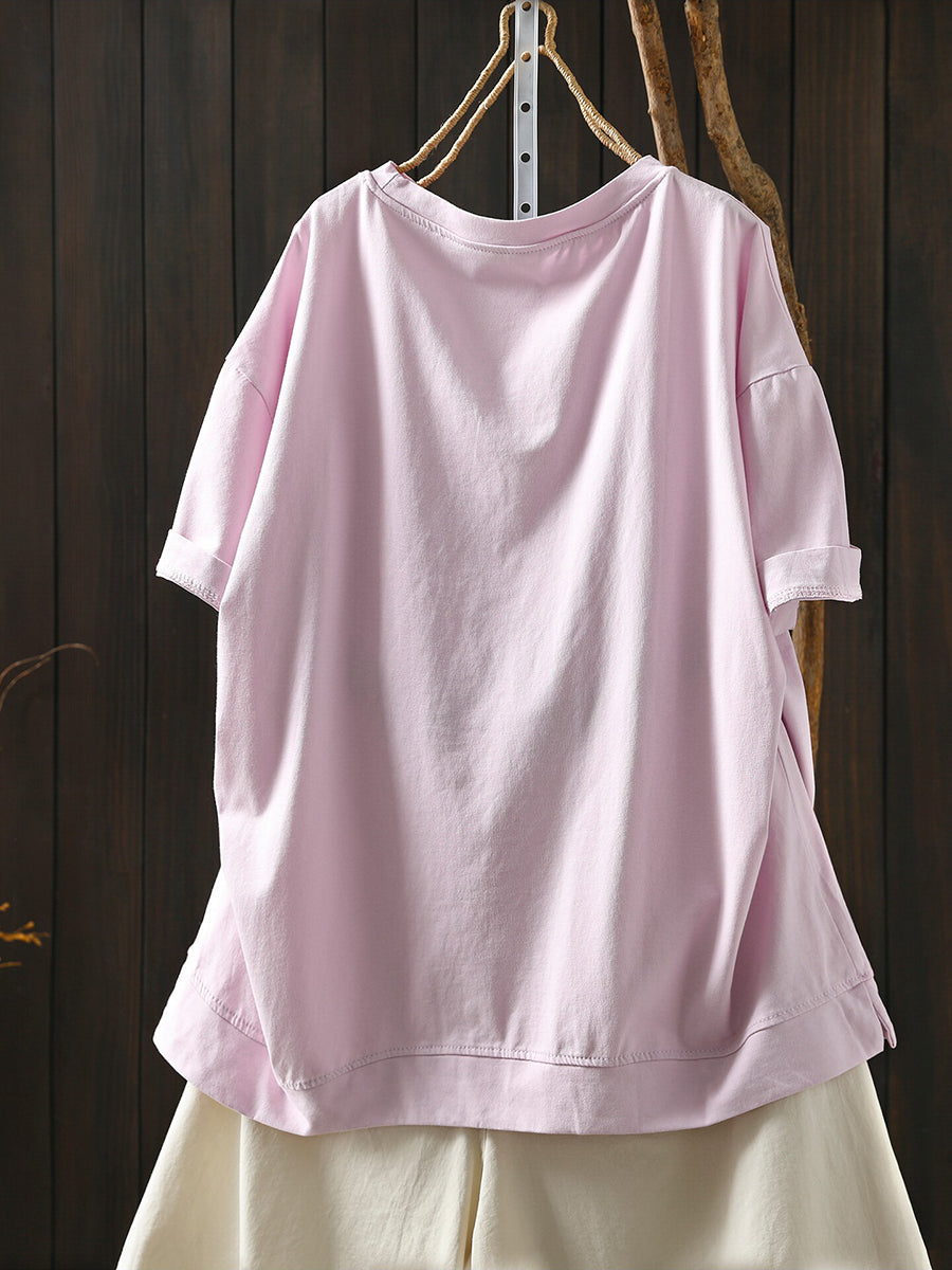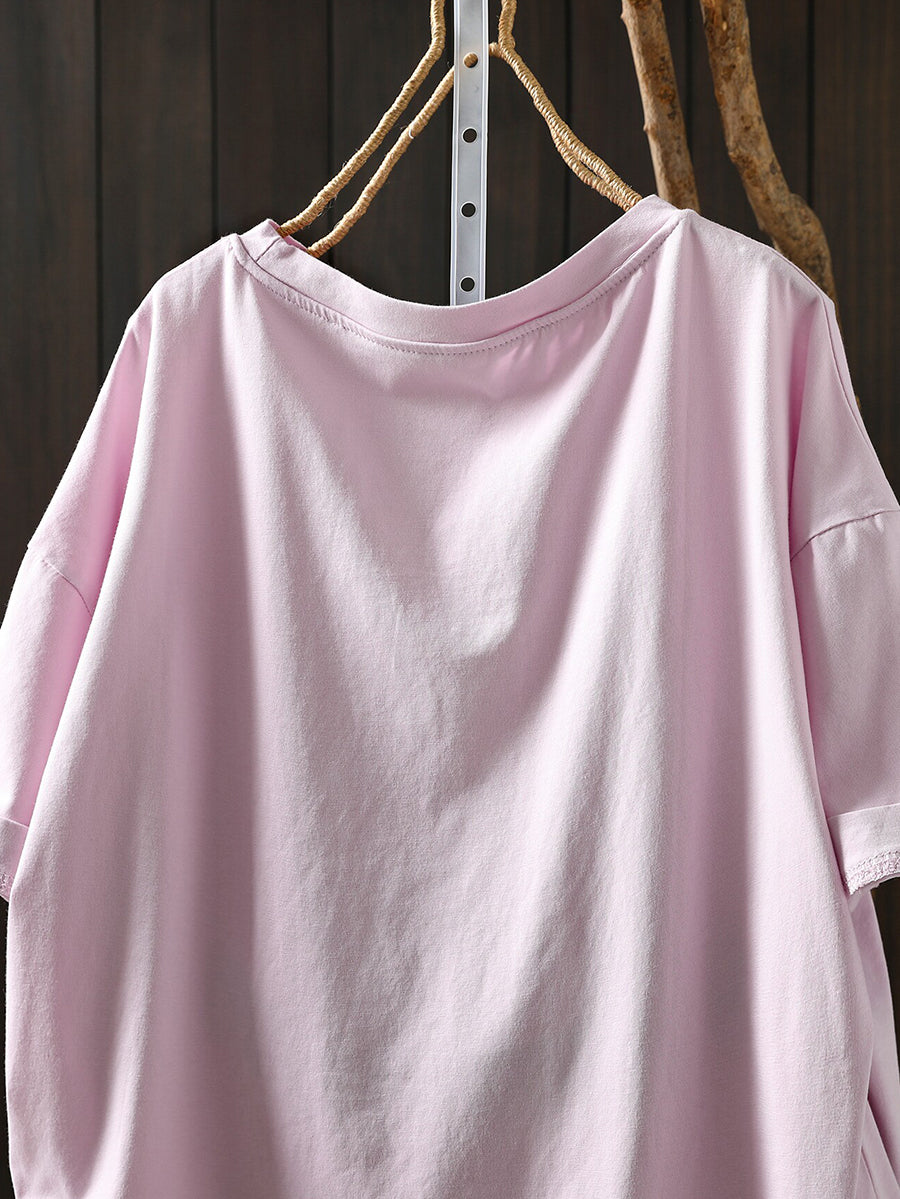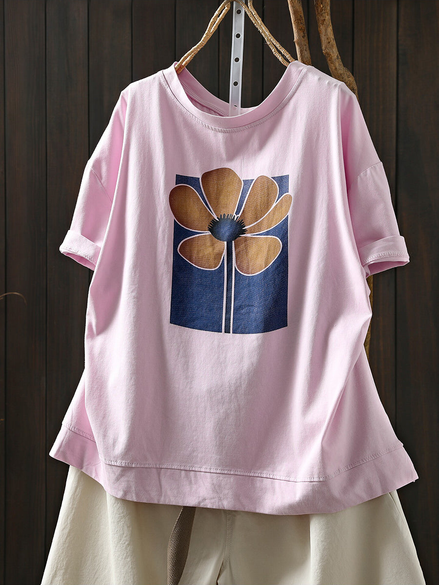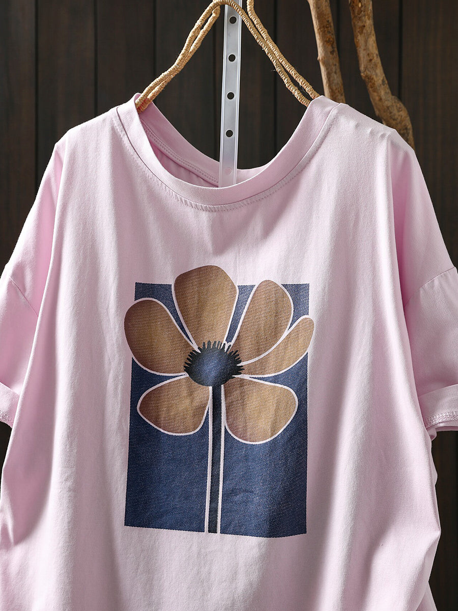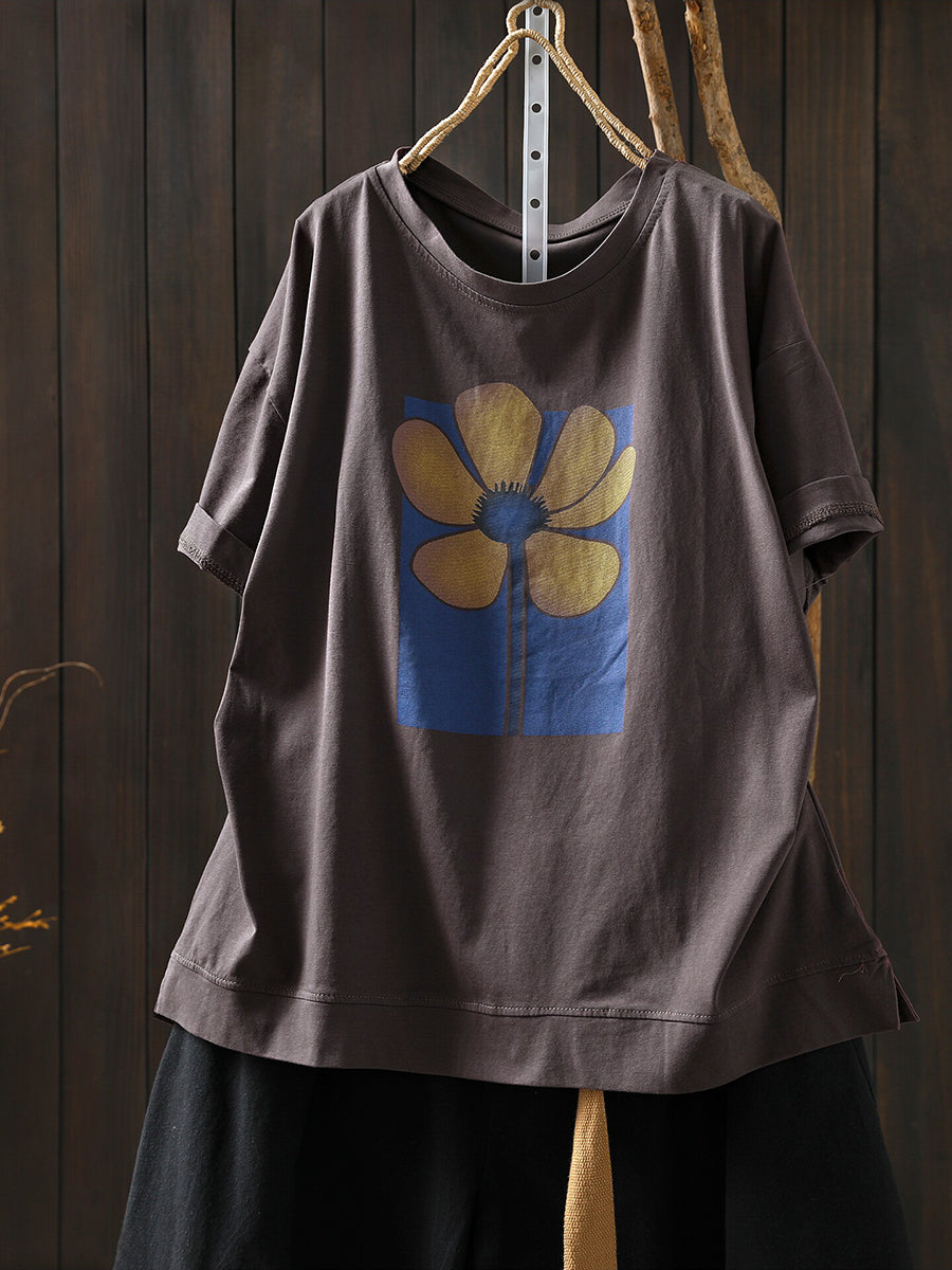 Women Summer Artsy Flower O-Neck Cotton T-Shirt