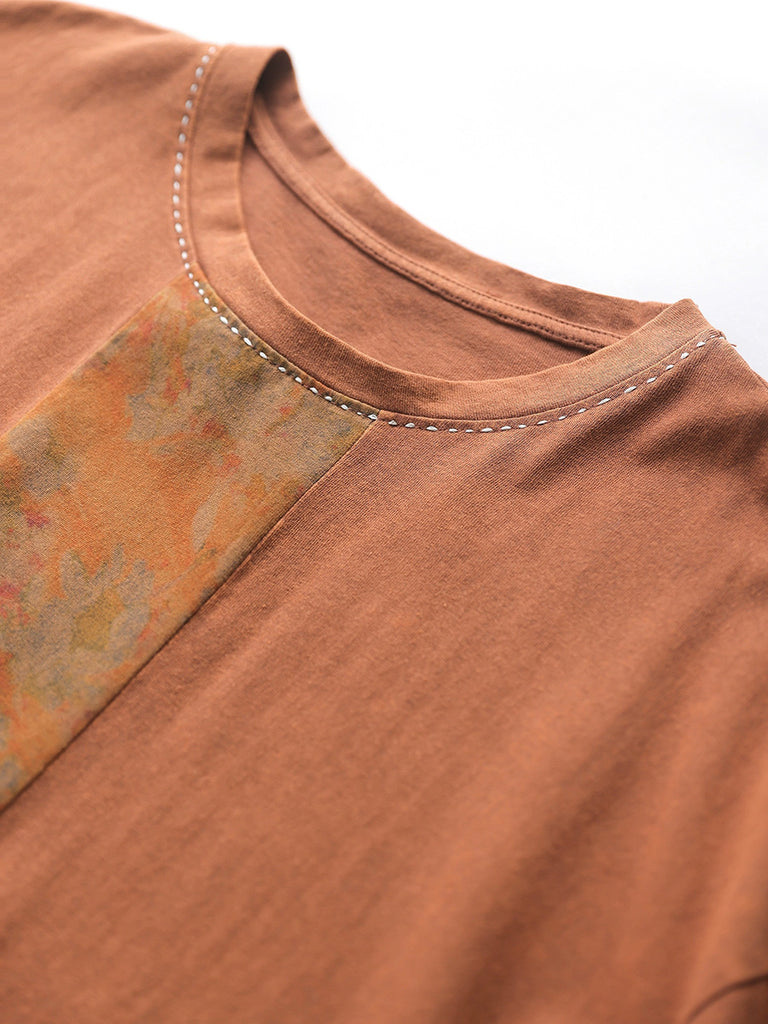 Women Summer Artsy Flower Spliced 100%Cotton O-Neck Shirt