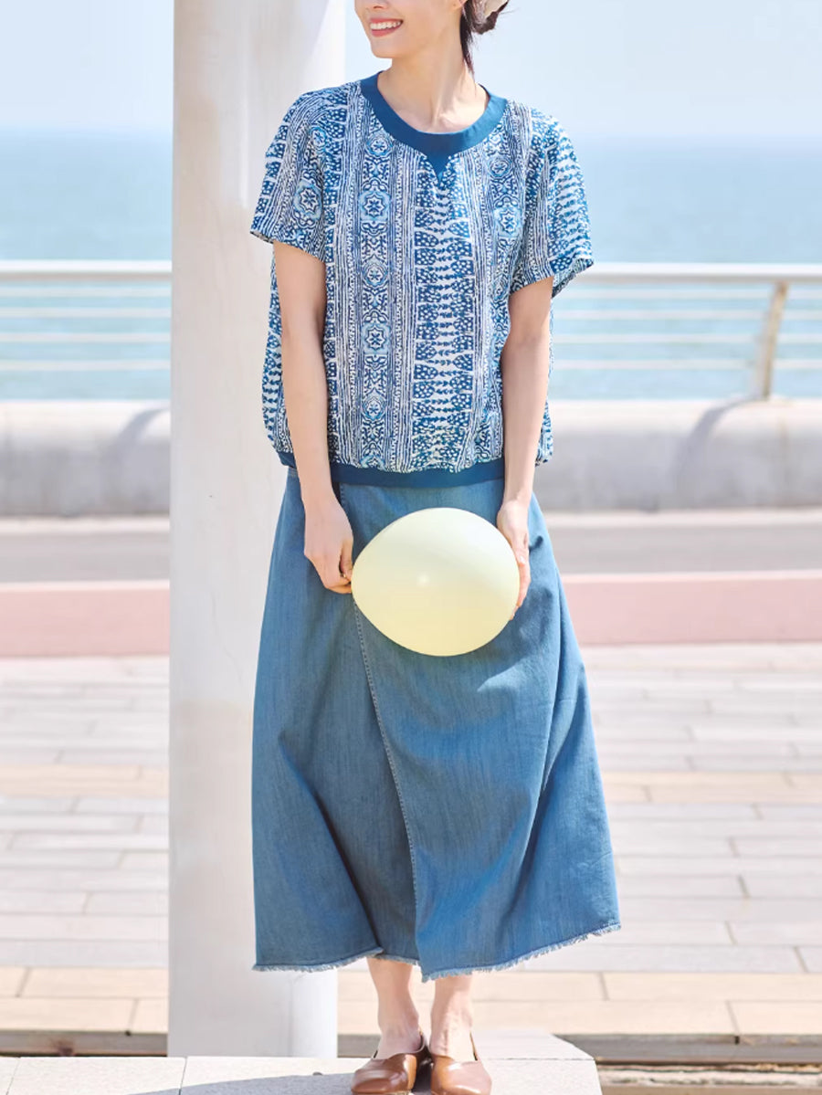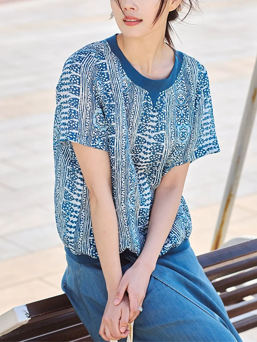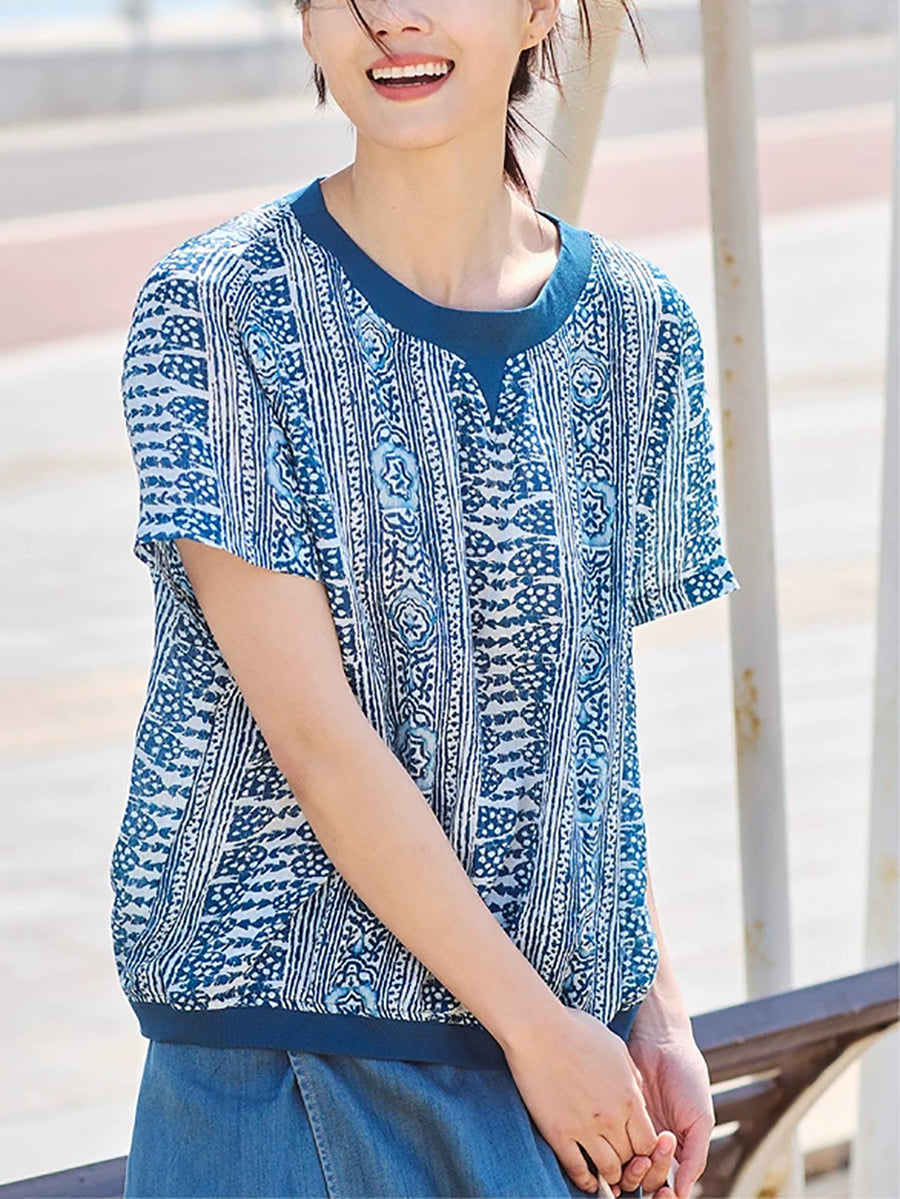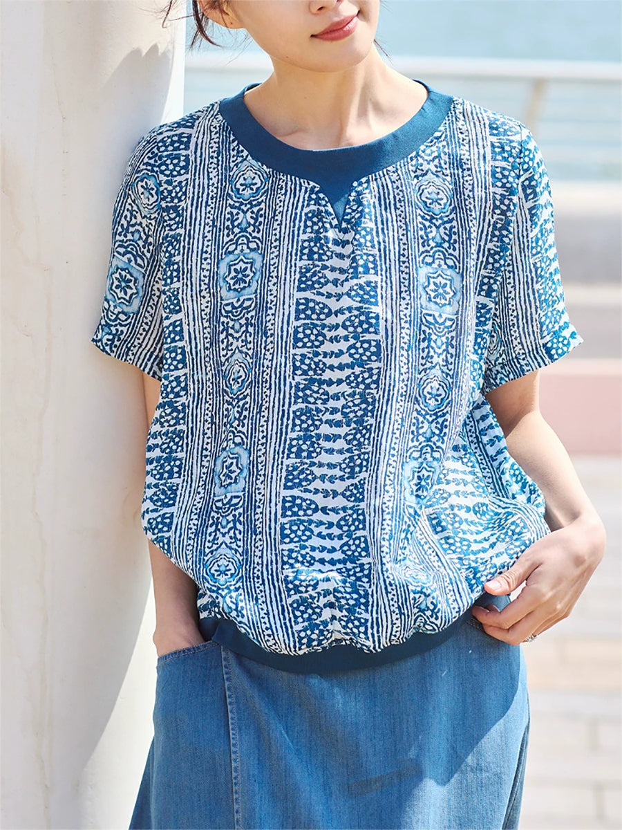 Women Summer Artsy Print 100%Ramie O-Neck Blouse