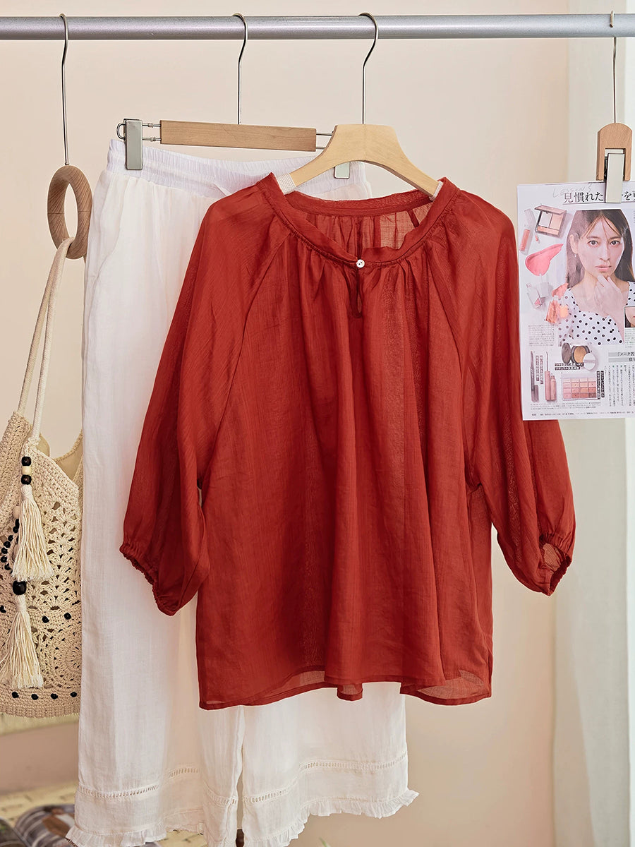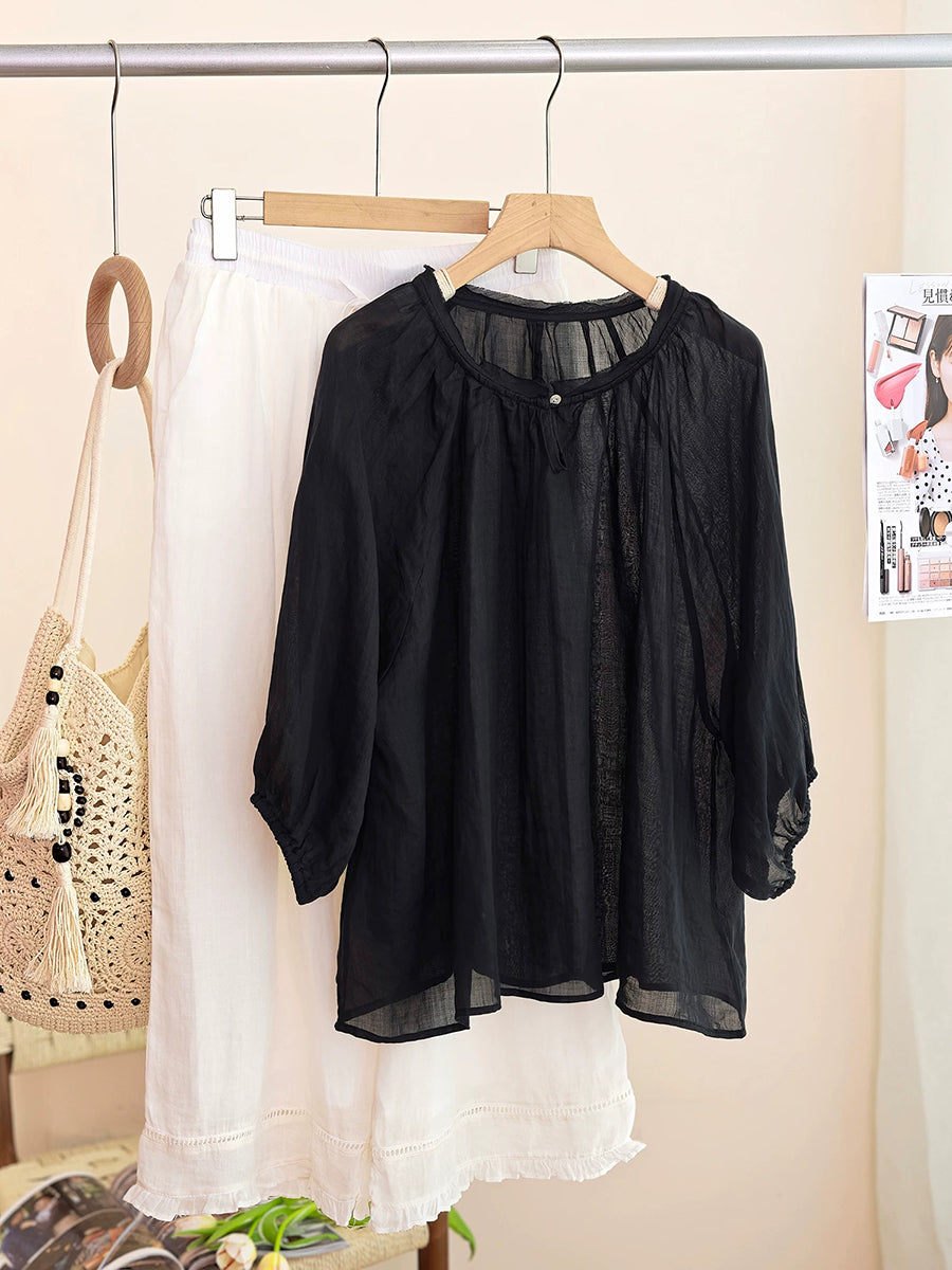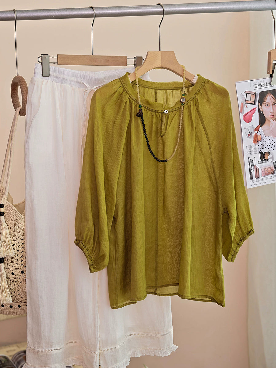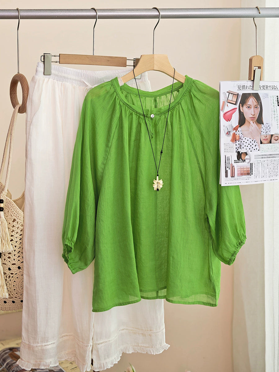 Women Summer Artsy Pure Color 100%Ramie O-Neck Blouse