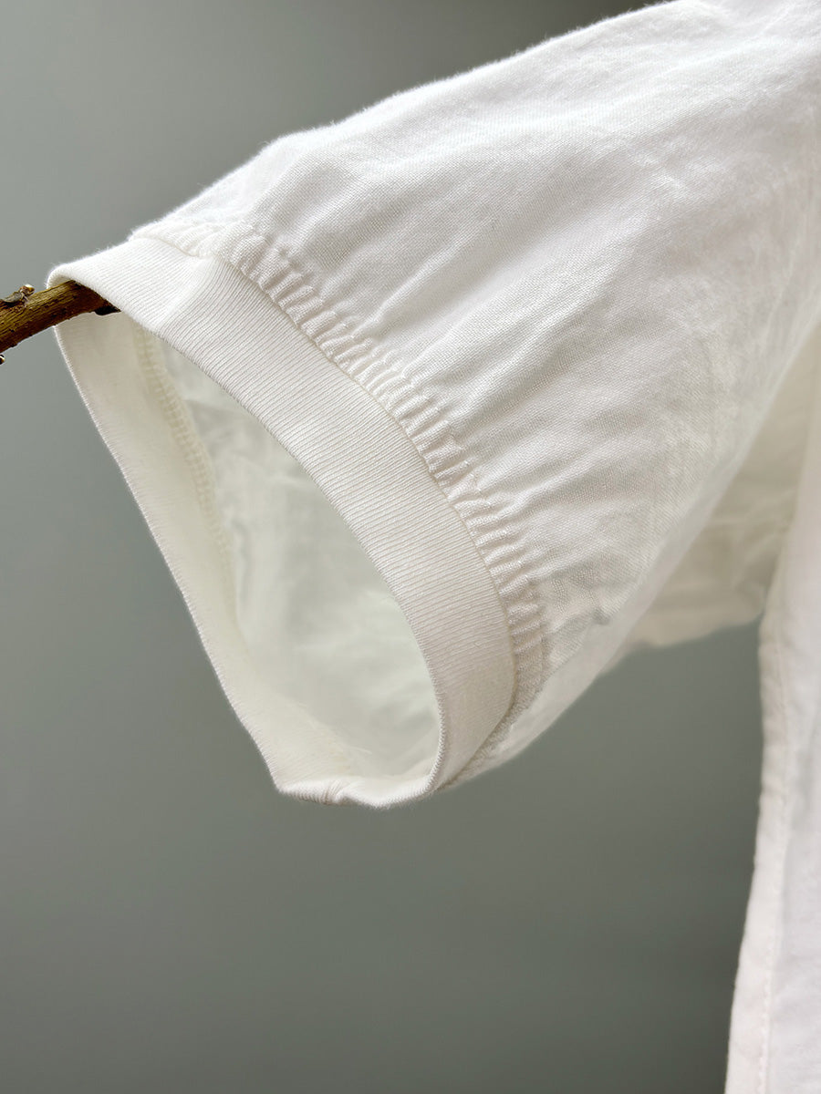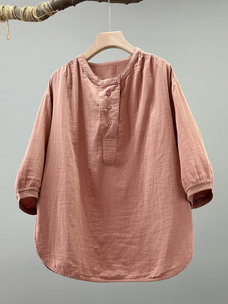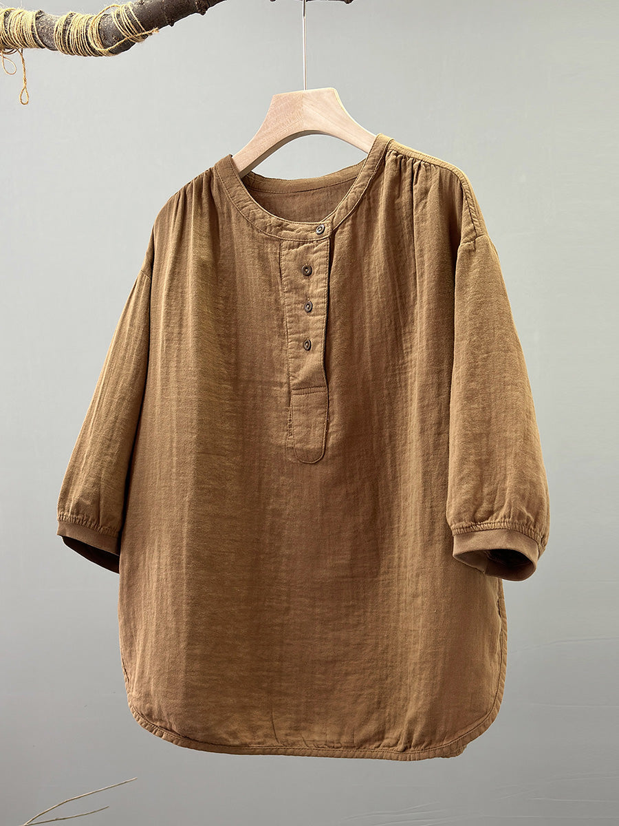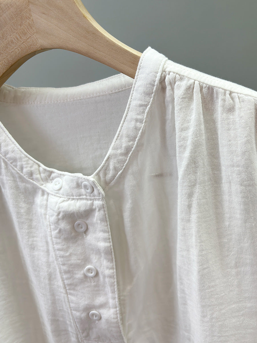 Women Summer Artsy Pure Color O-Neck 100%Cotton Blouse