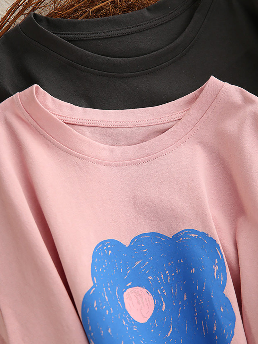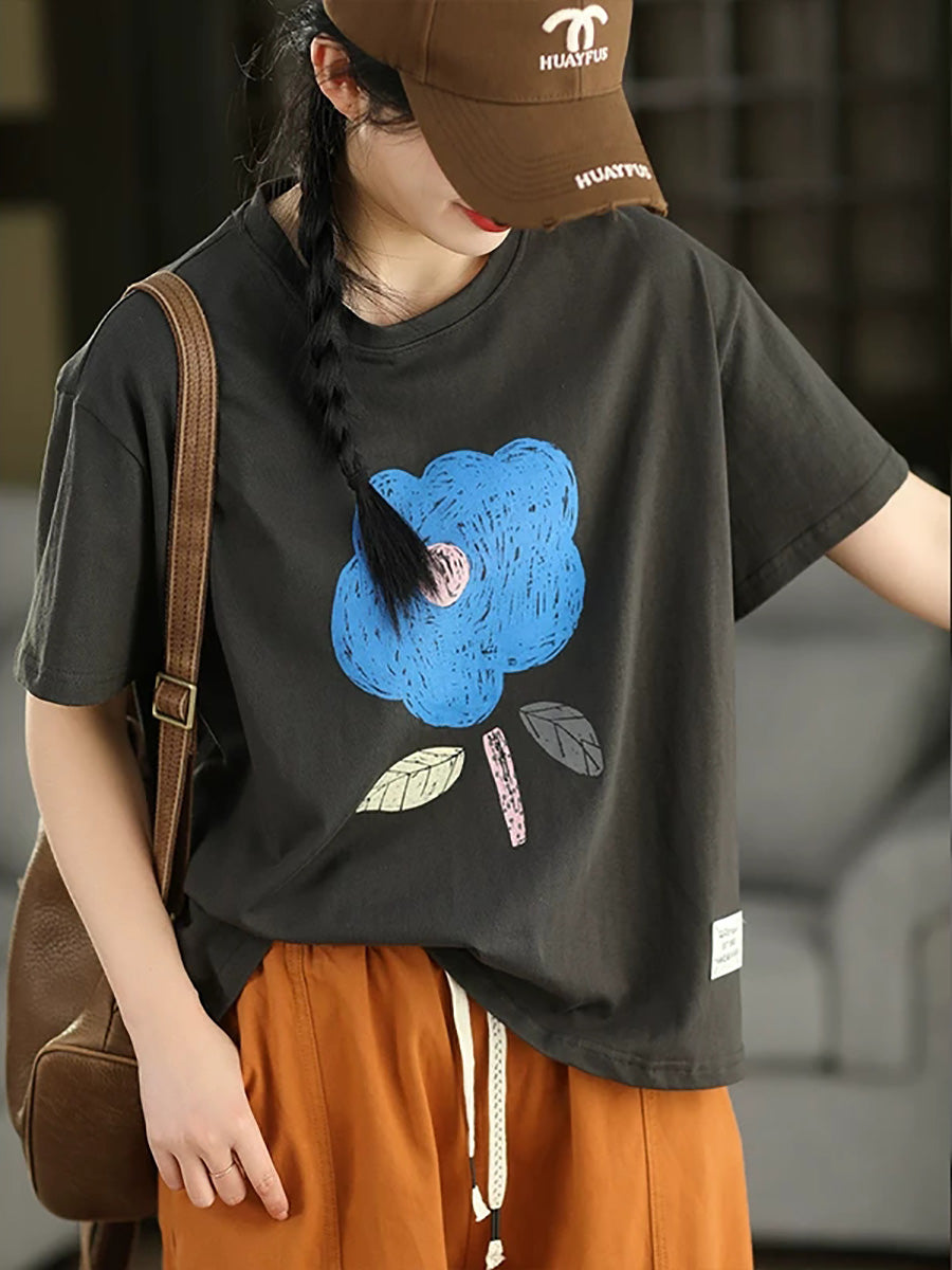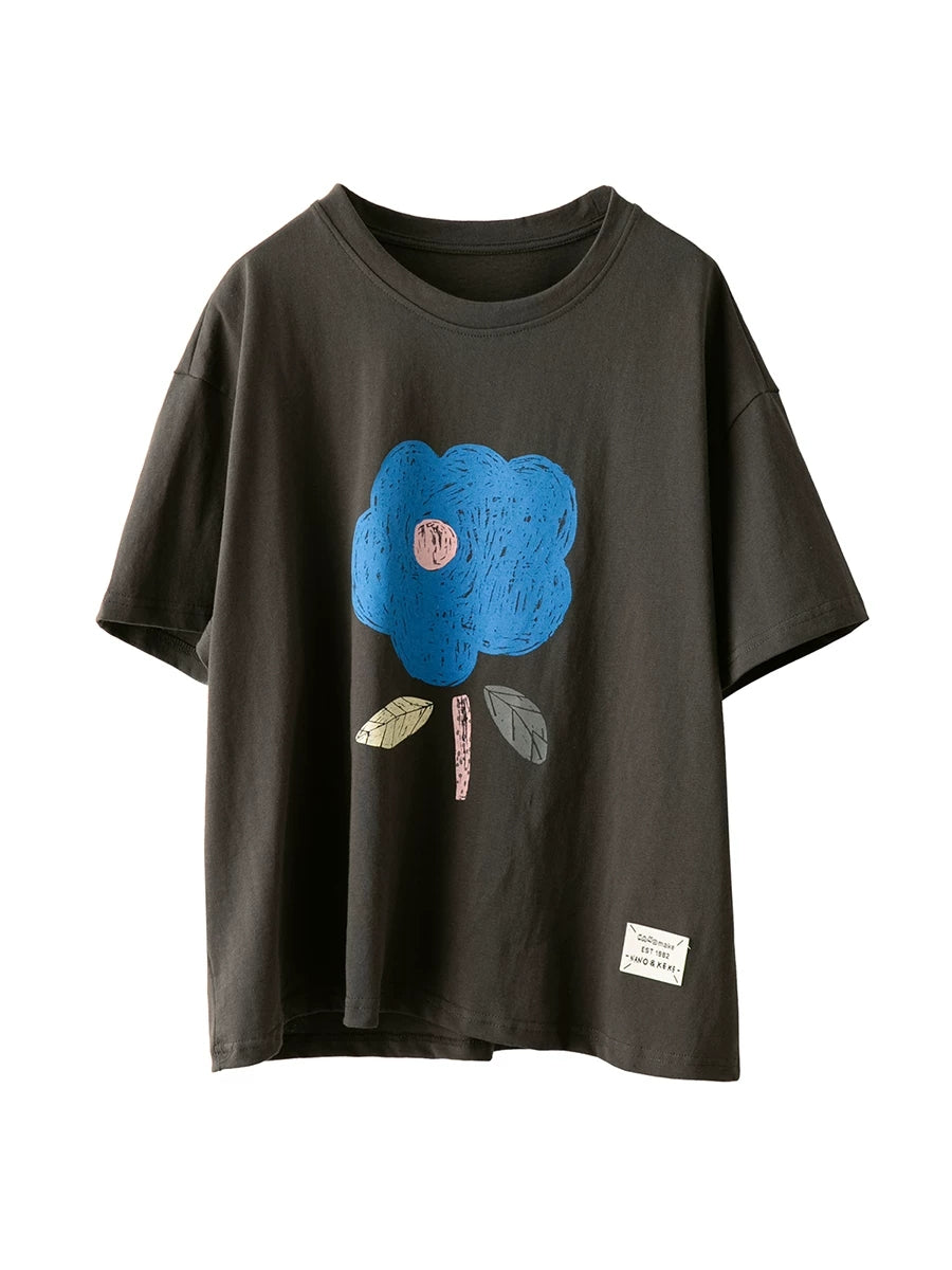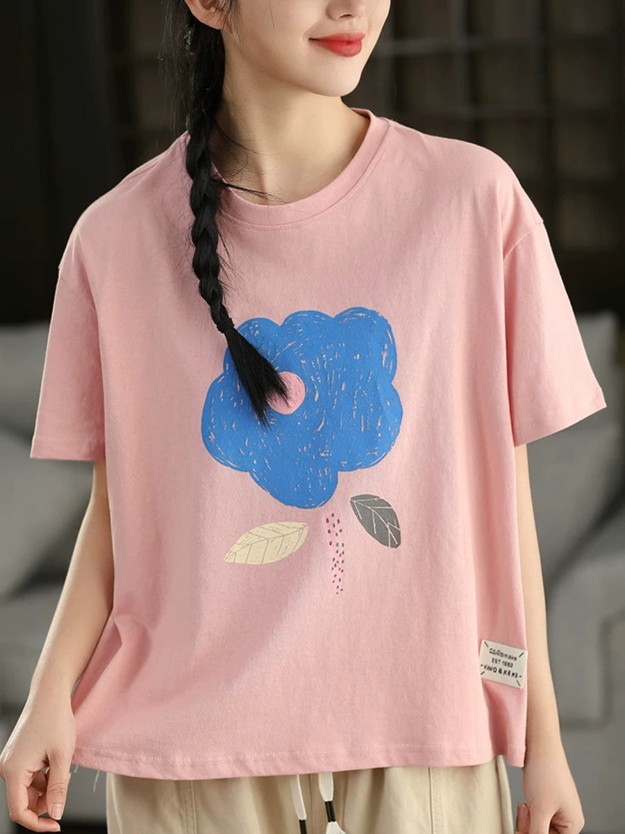 Women Summer Casual Flower O-Neck 100%Cotton T-Shirt