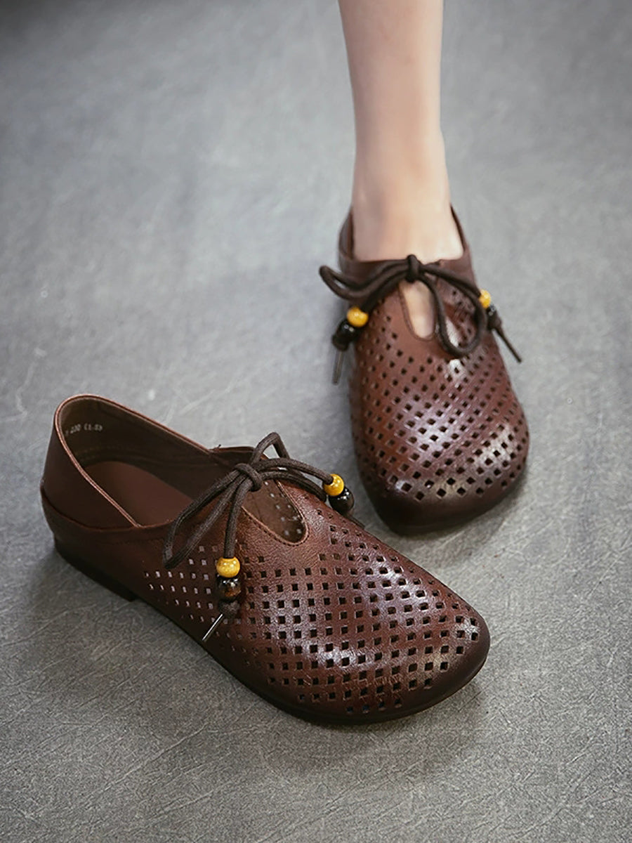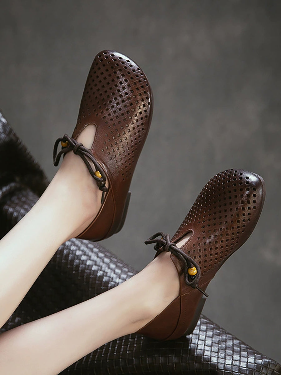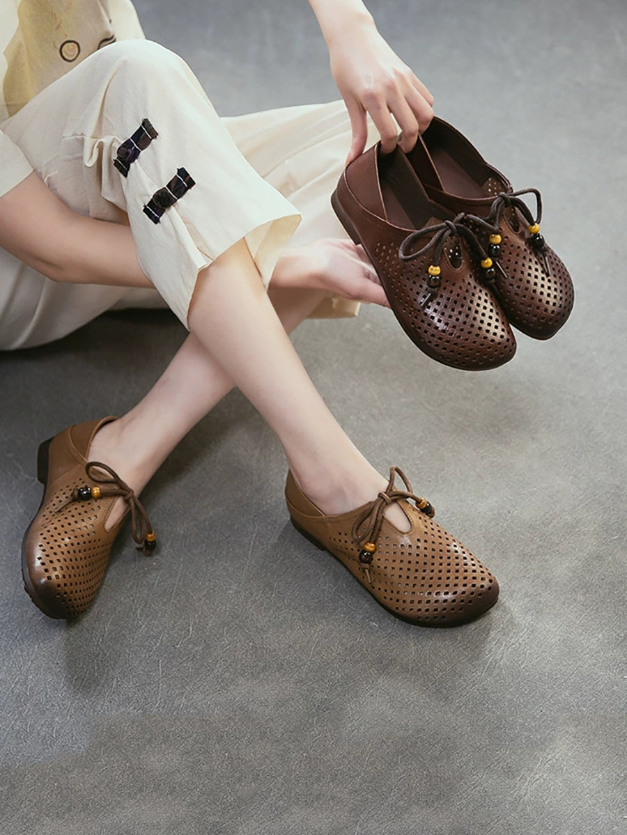 Women Summer Genuine Leahter Hollow Out Flat Shoes