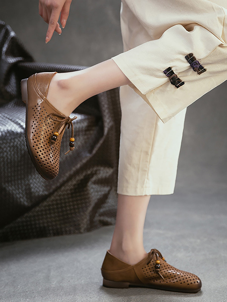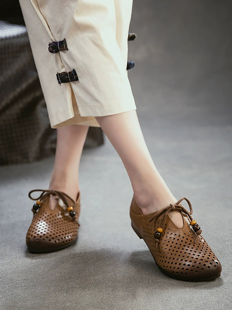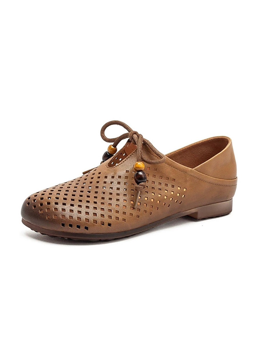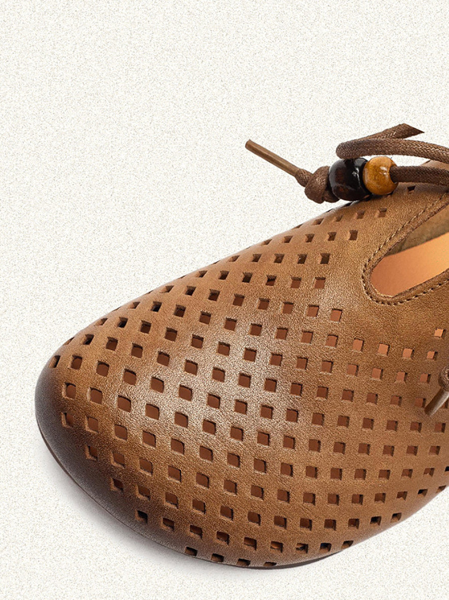 Women Summer Genuine Leahter Hollow Out Flat Shoes