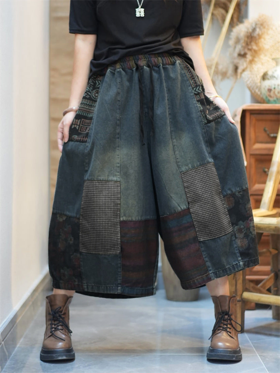 Crafted from a durable cotton material with a stylish patchwork design, these wide-leg pants are perfect for women who value comfort and fashion. The elastic waistband adds practicality to the vintage style of these pants, making them a versatile addition to any wardrobe.