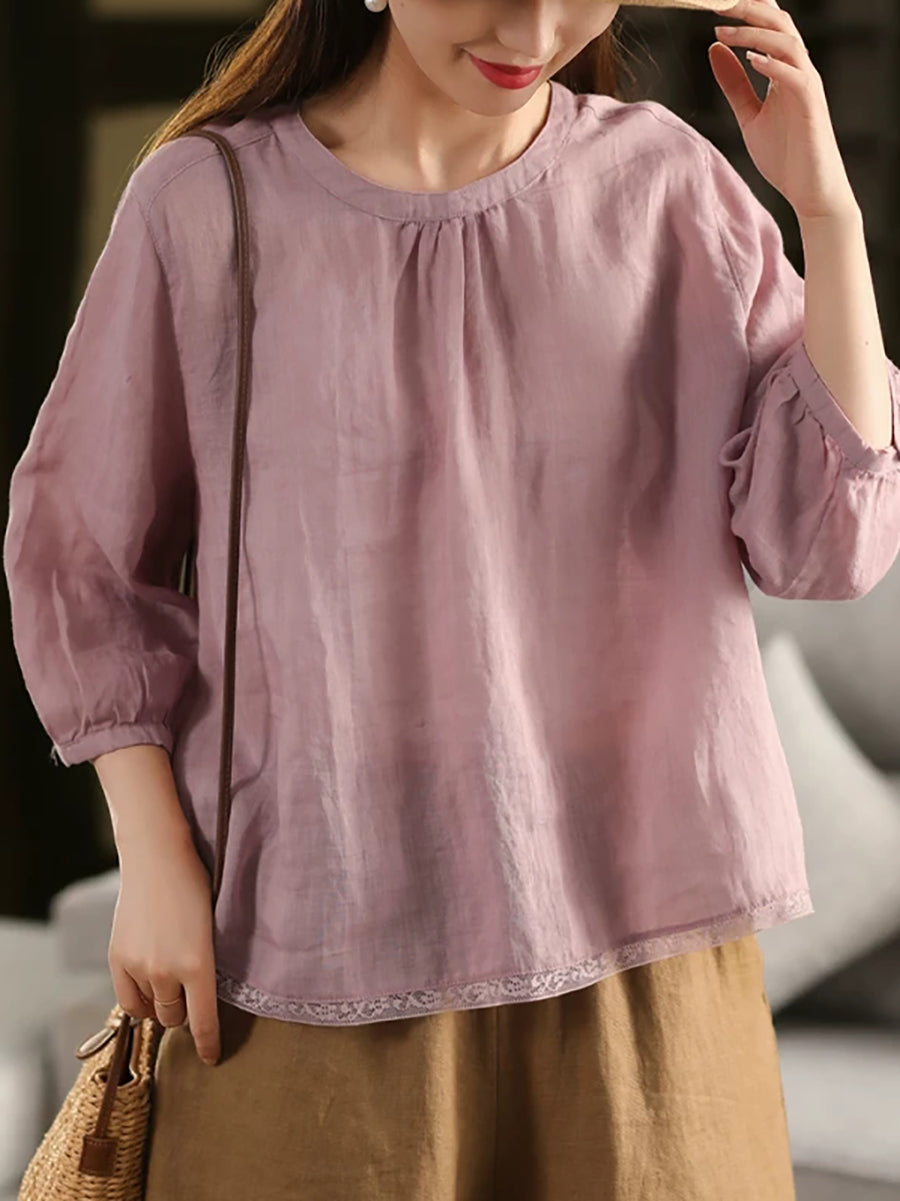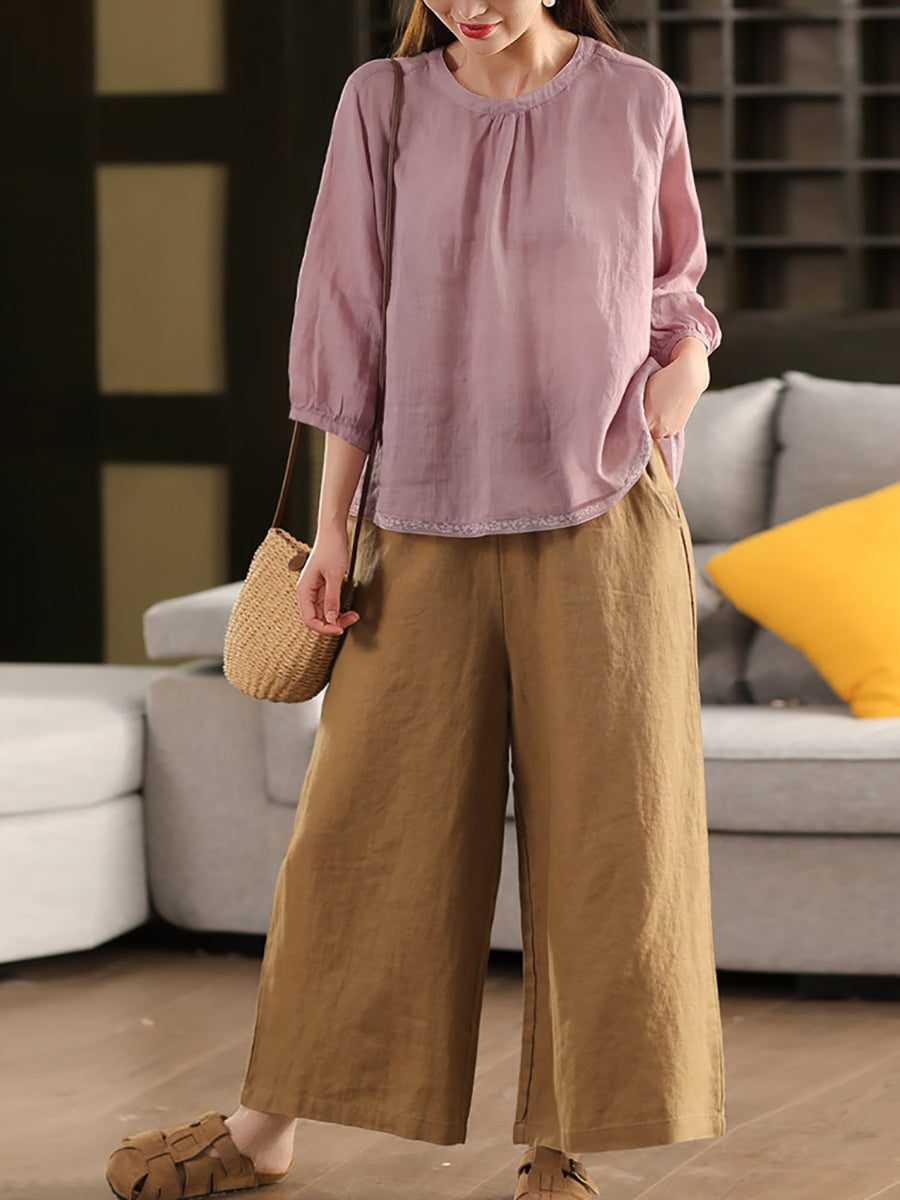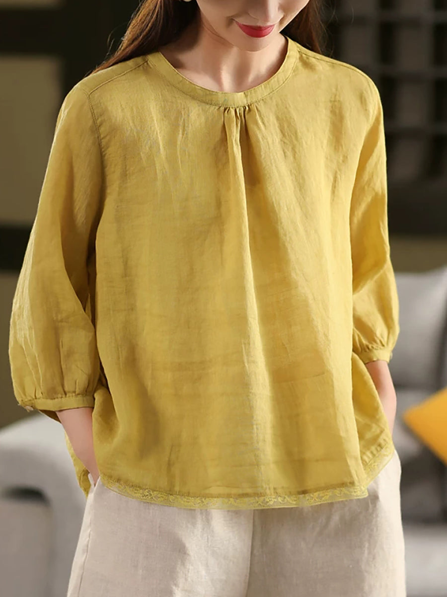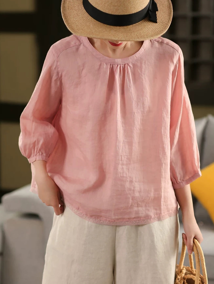 Women Summer Pure Color O-Neck 100%Ramie Blouse