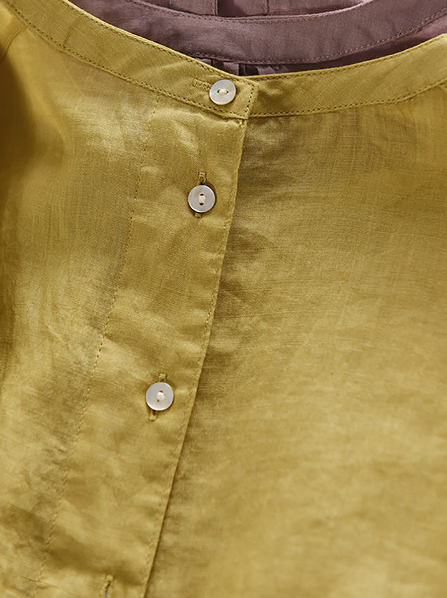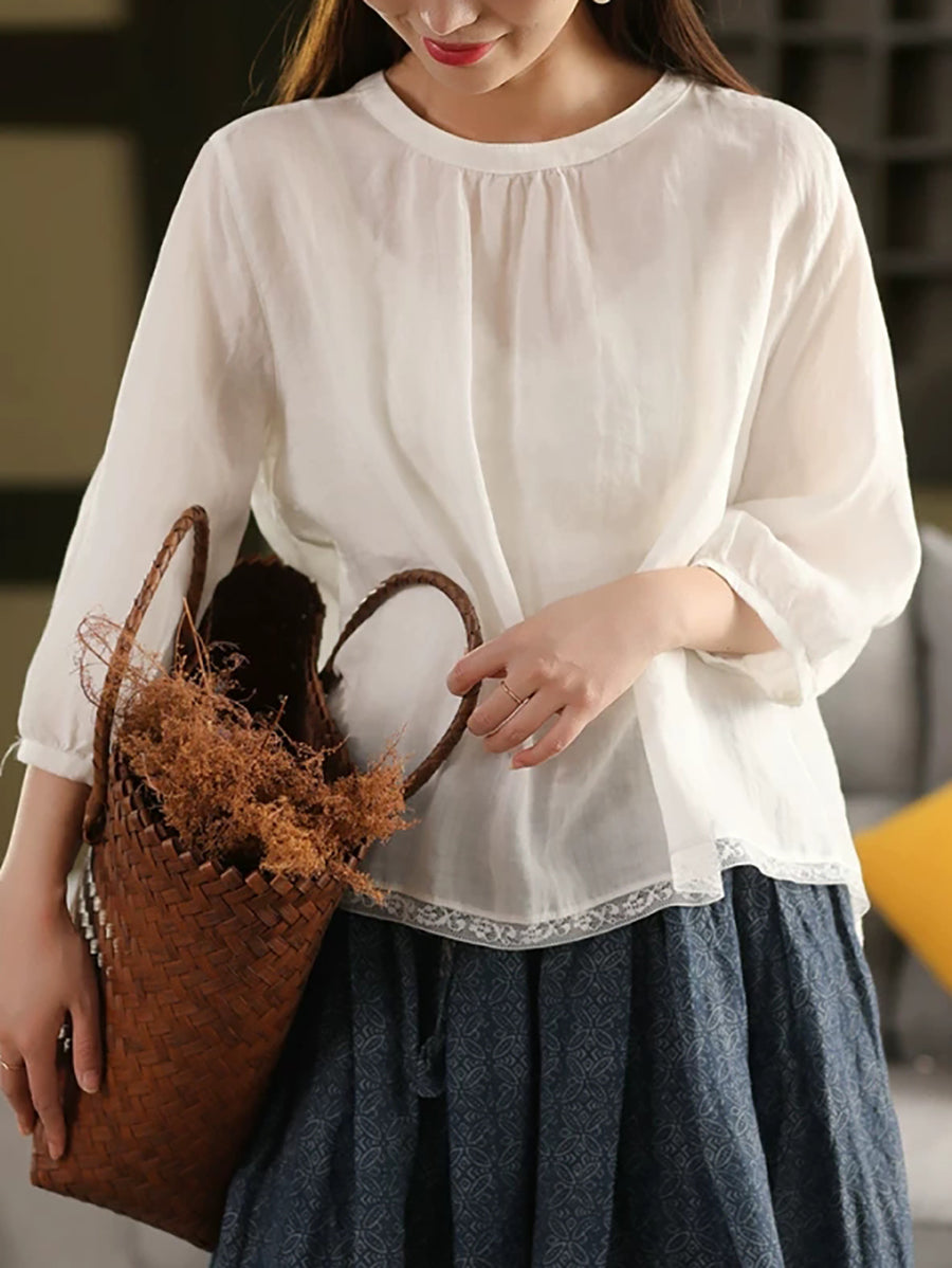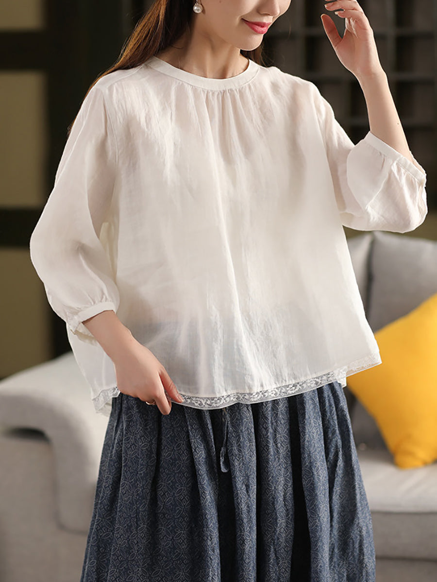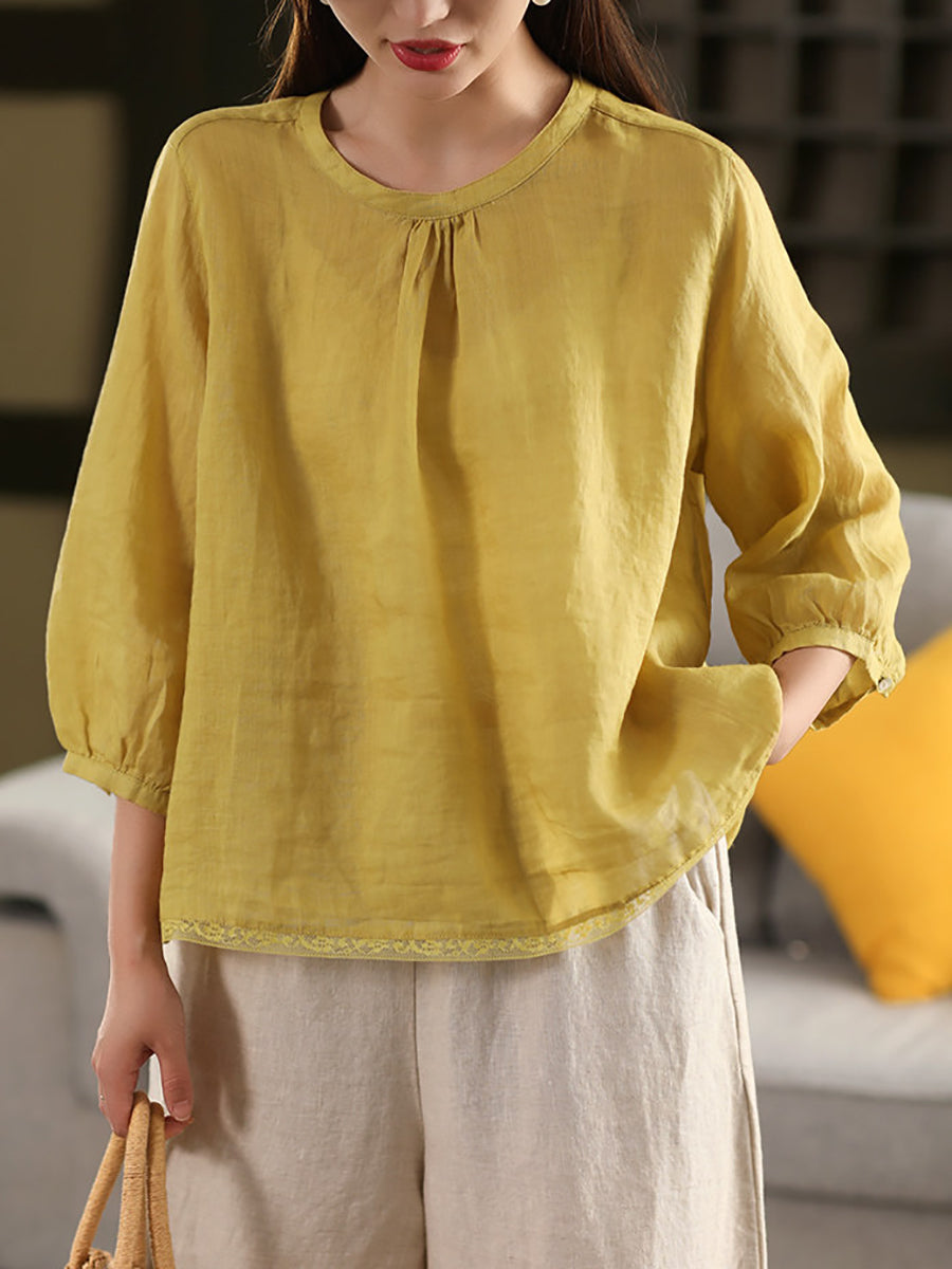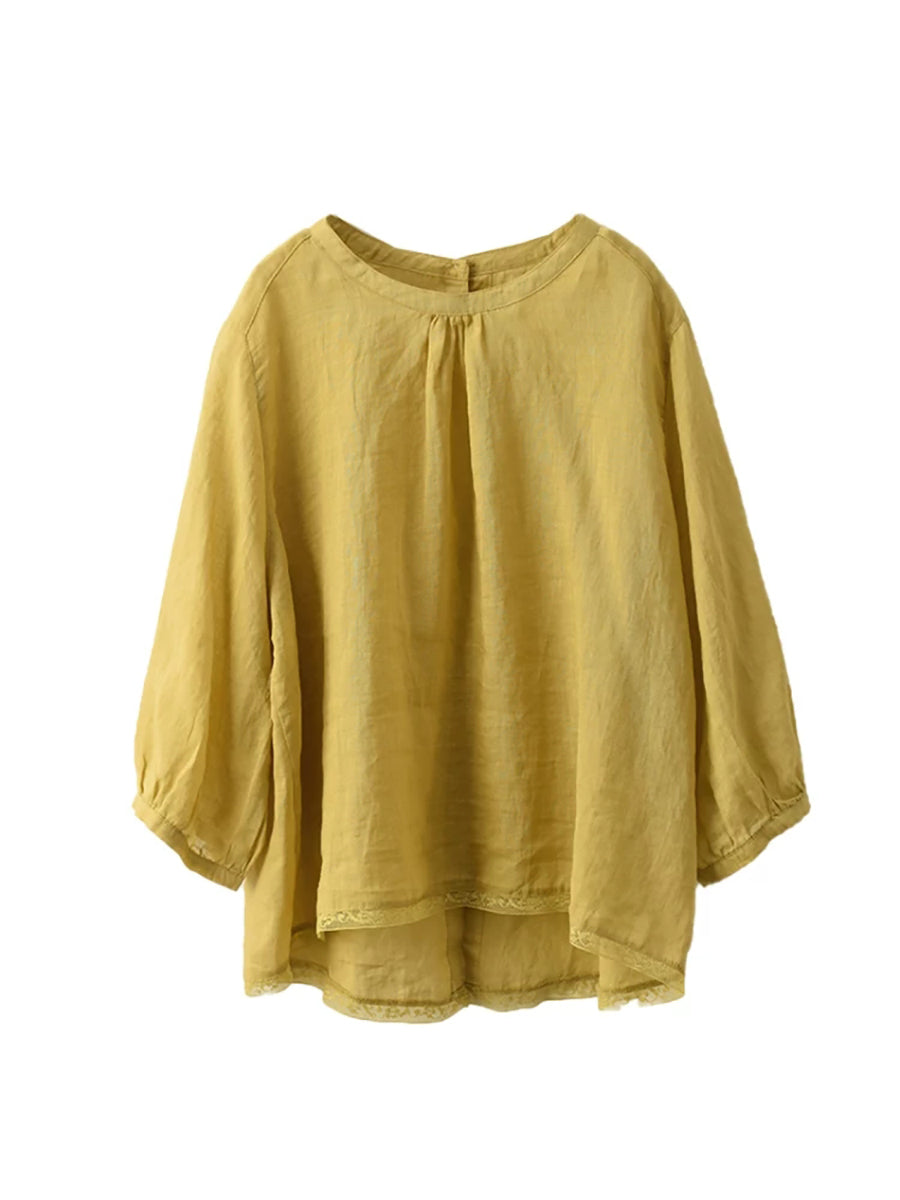 Women Summer Pure Color O-Neck 100%Ramie Blouse