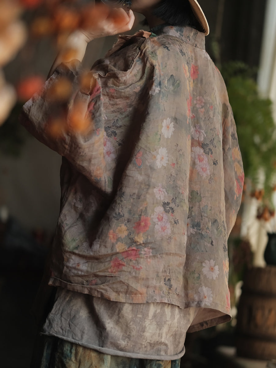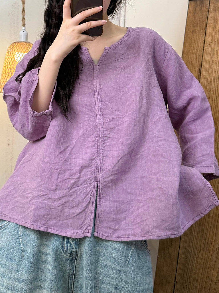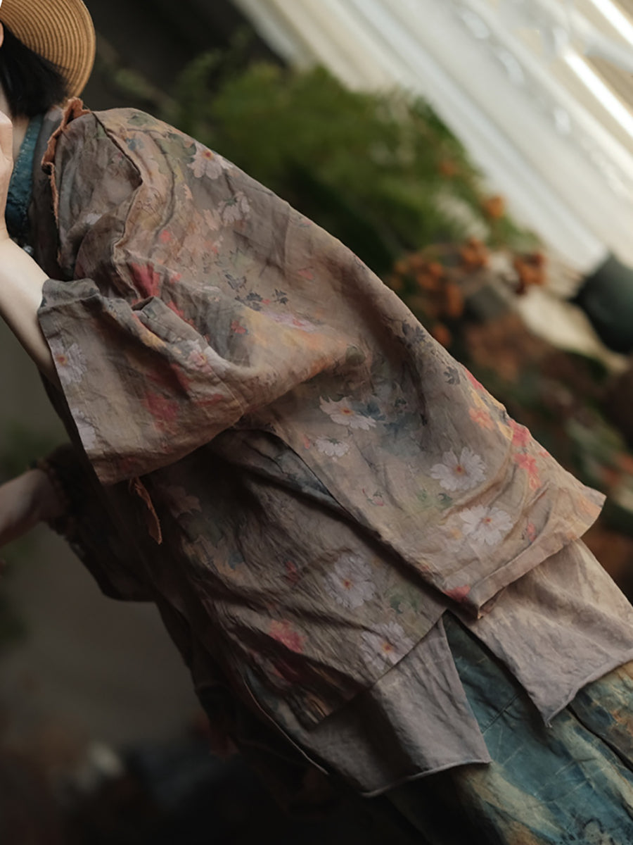 Women Summer Retro Flower Colorblock V-Neck Linen Shirt