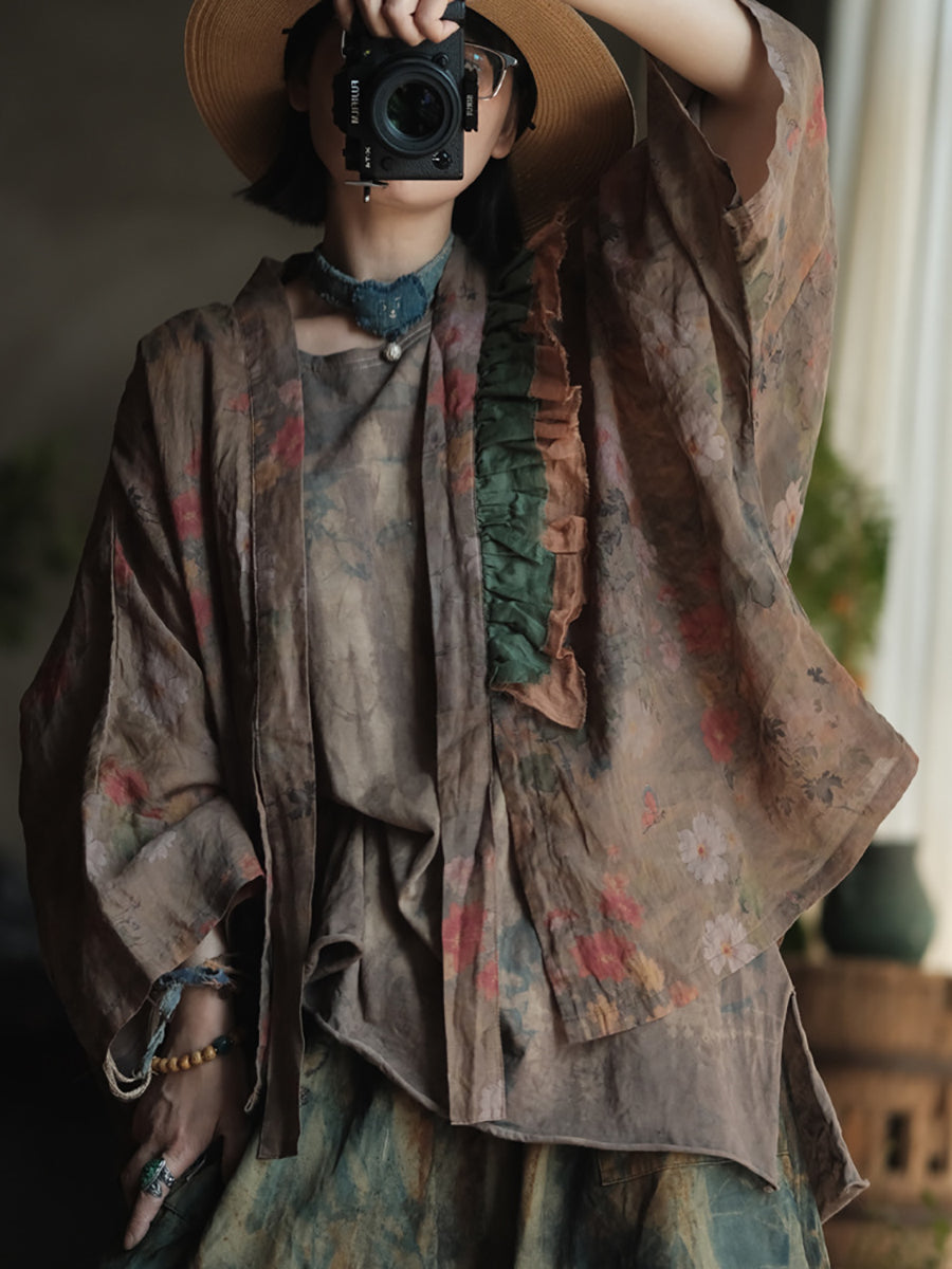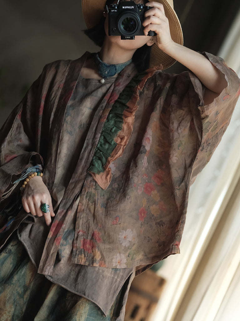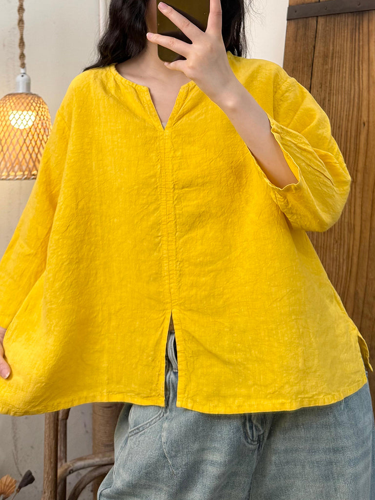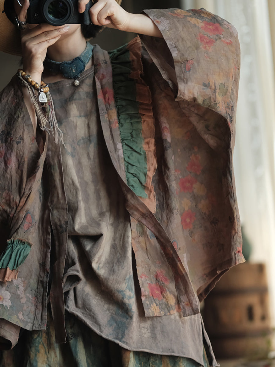 Women Summer Retro Flower Colorblock V-Neck Linen Shirt