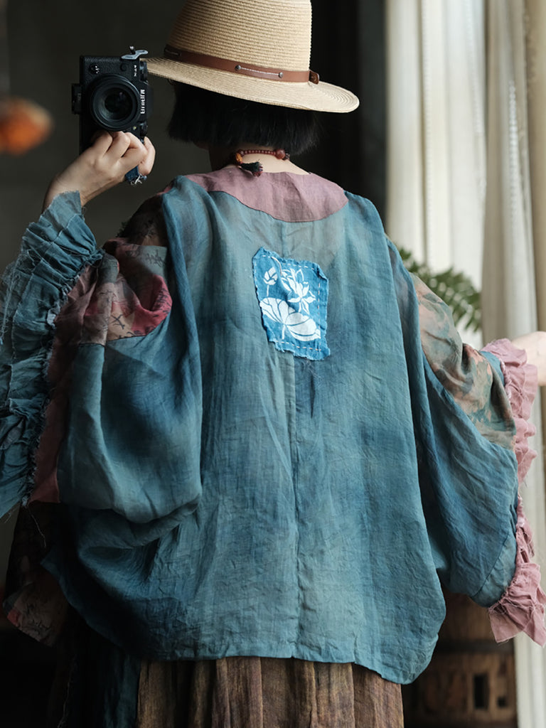 Women Summer Retro Flower Spliced Linen Shirt Coat