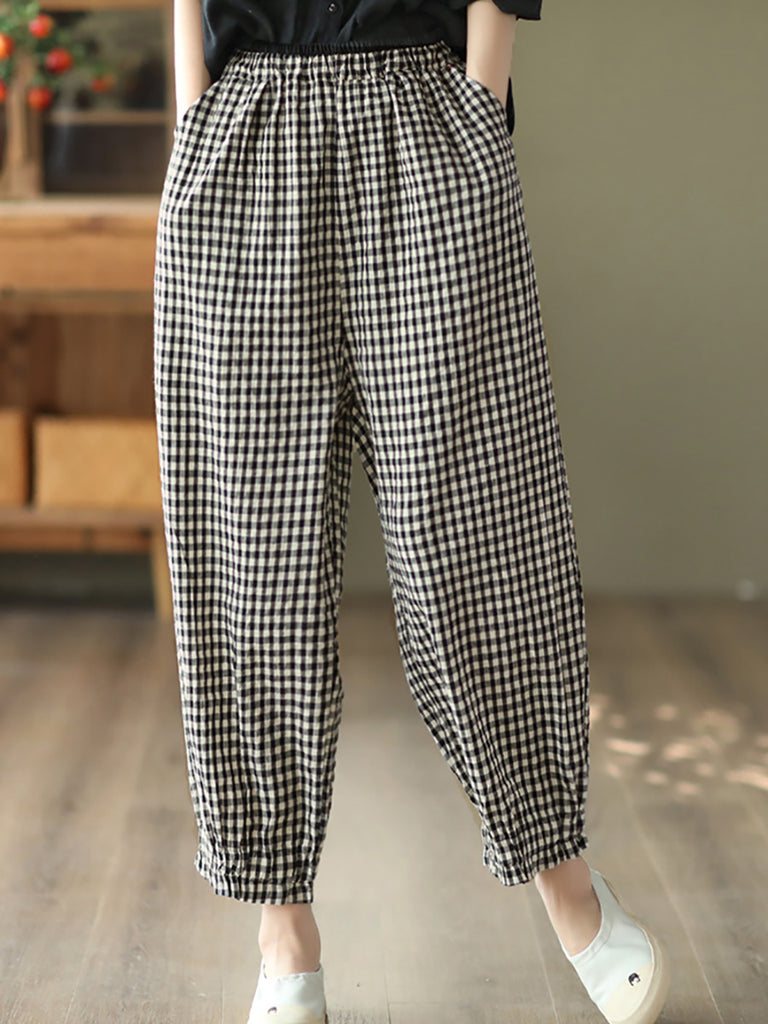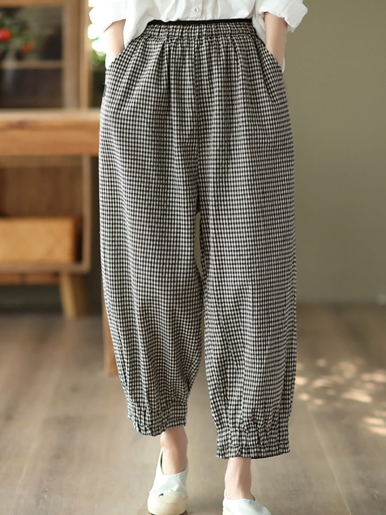 Plus Size Women Summer Retro Plaid 100%Cotton Harem Pants