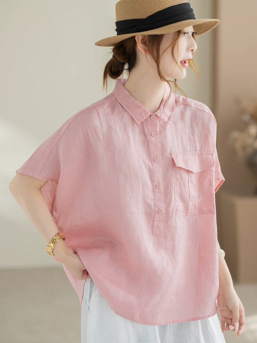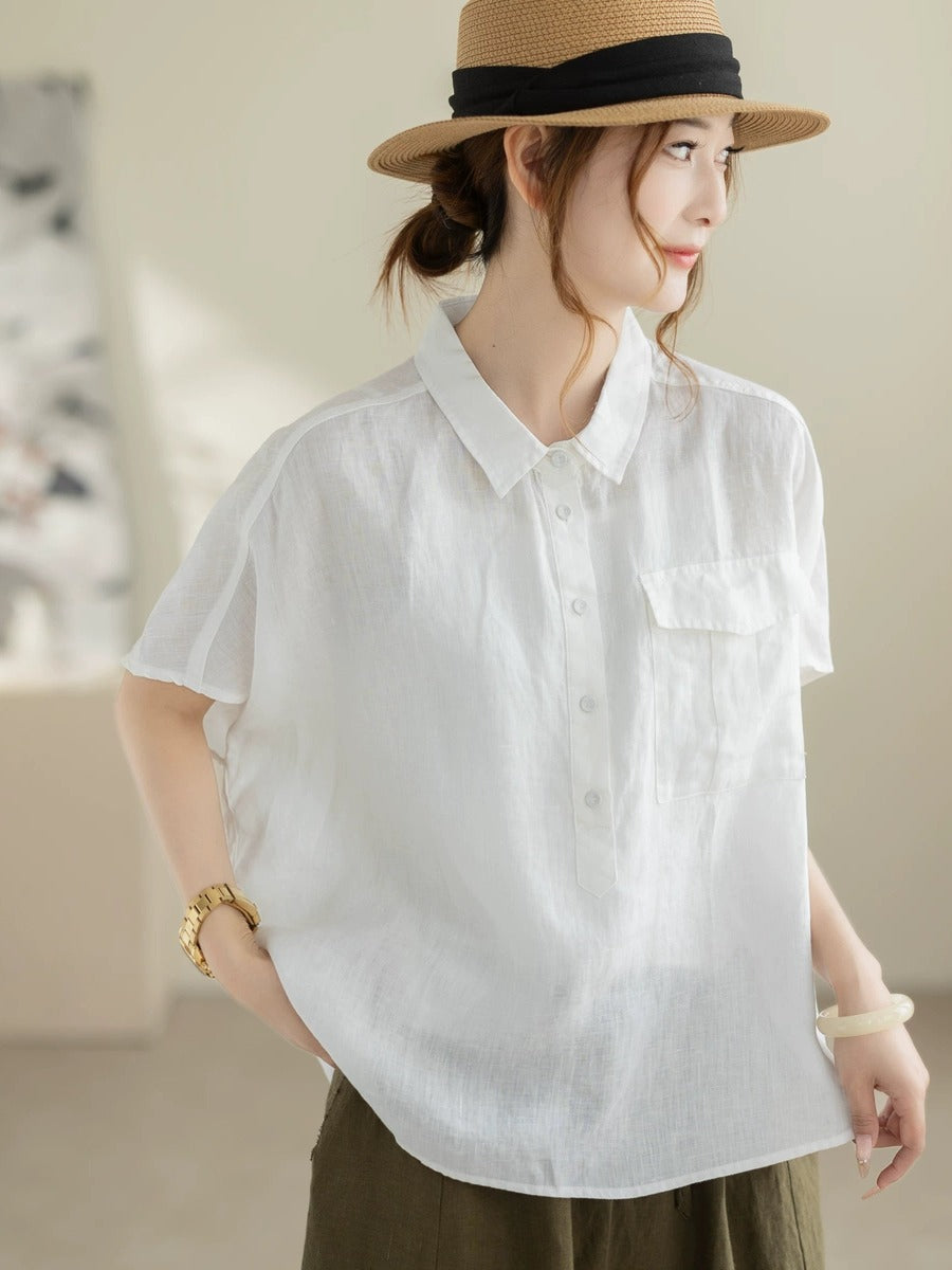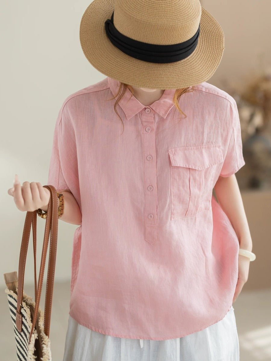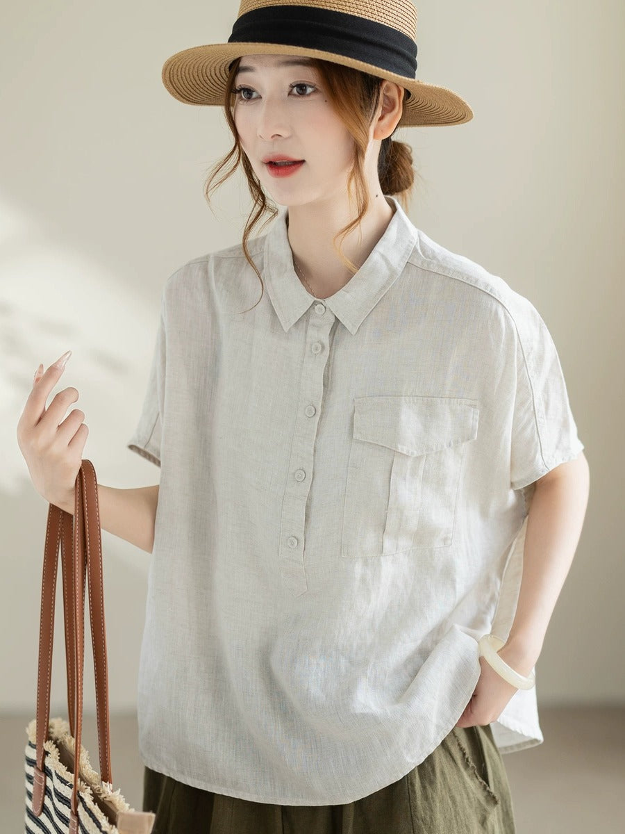 Women Summer Vintage 100% Linen Short Sleeve Shirt