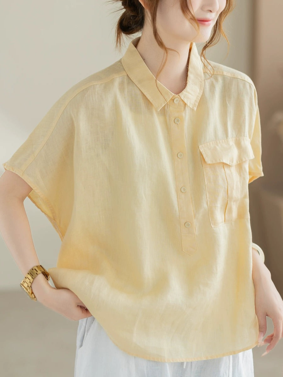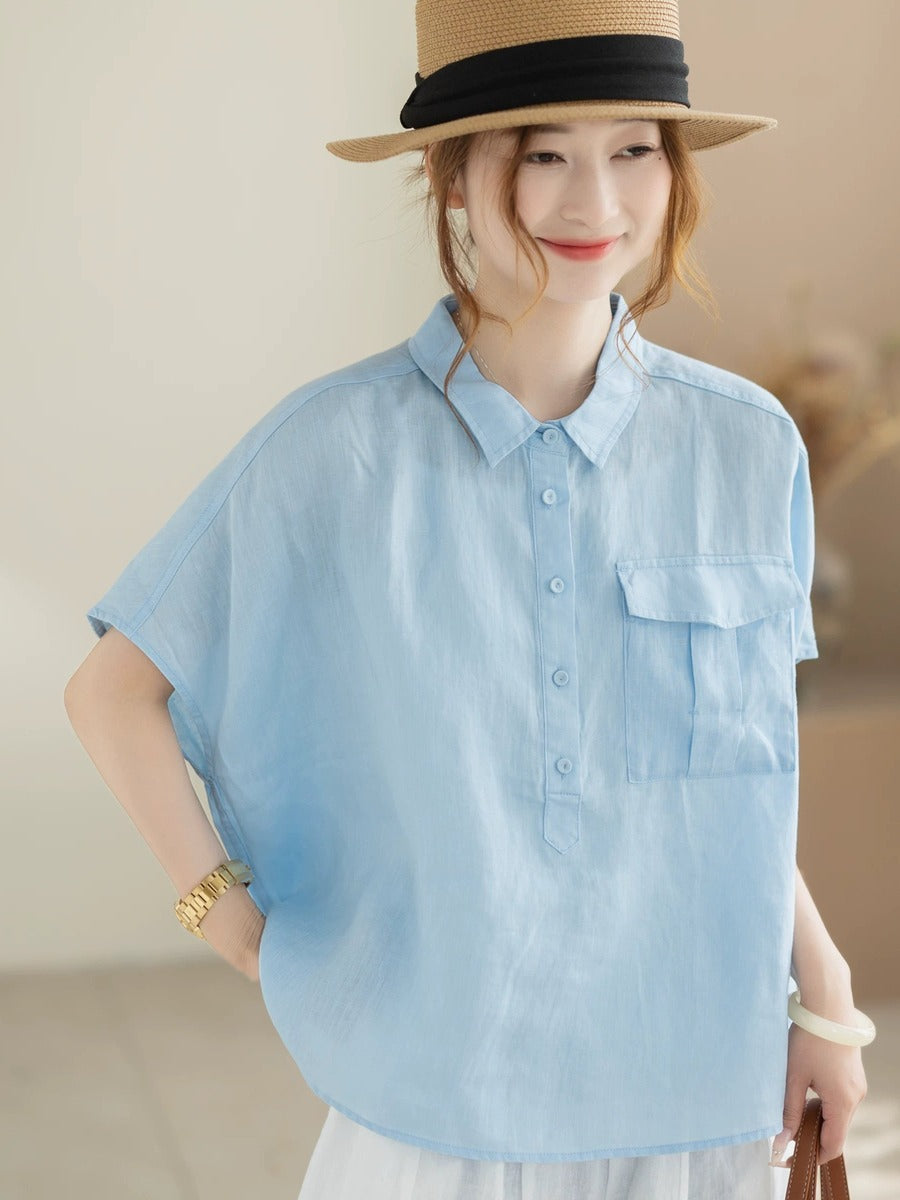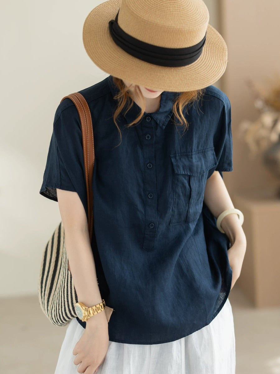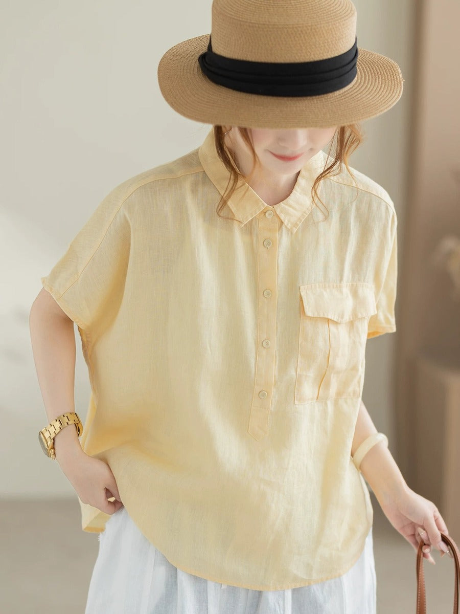 Women Summer Vintage 100% Linen Short Sleeve Shirt