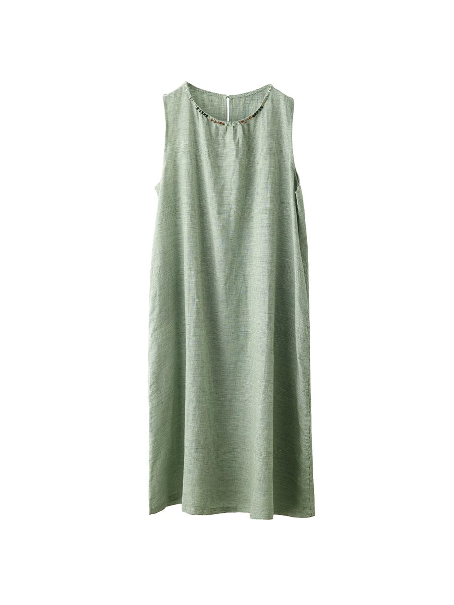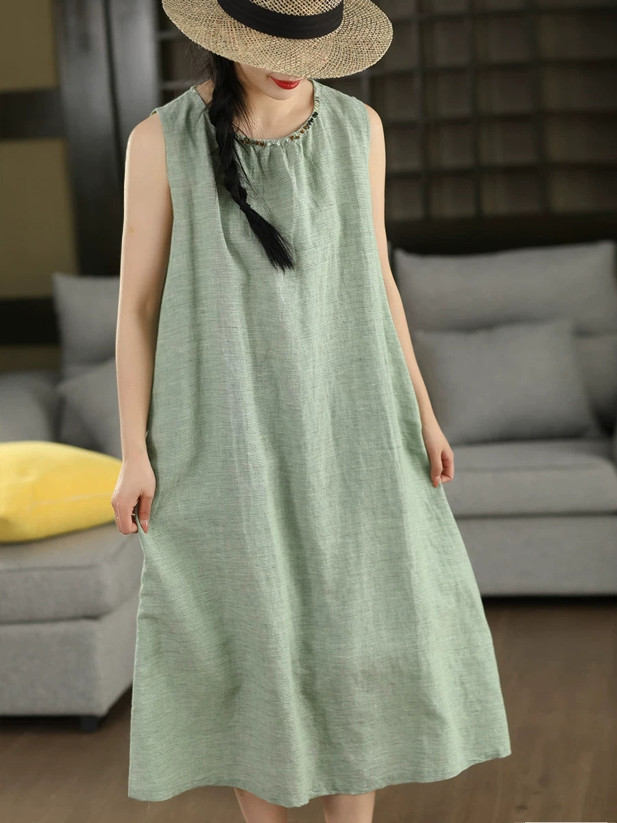 Women Summer Vintage Lattice 100%Linen Vest Dress