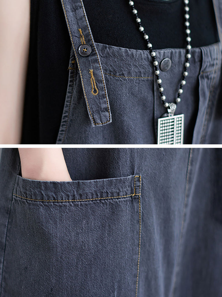 Women Summer Washed Pocket Frayed Button Denim Jumpsuits