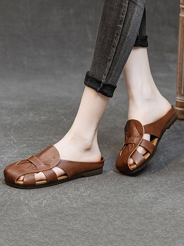 Women Vintage Genuine Leather Hollow Out Soft Slippers