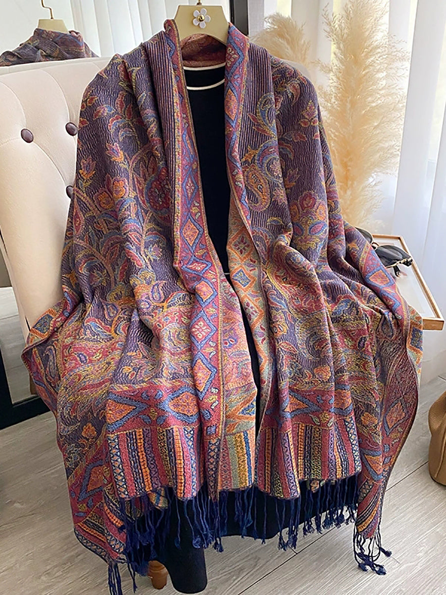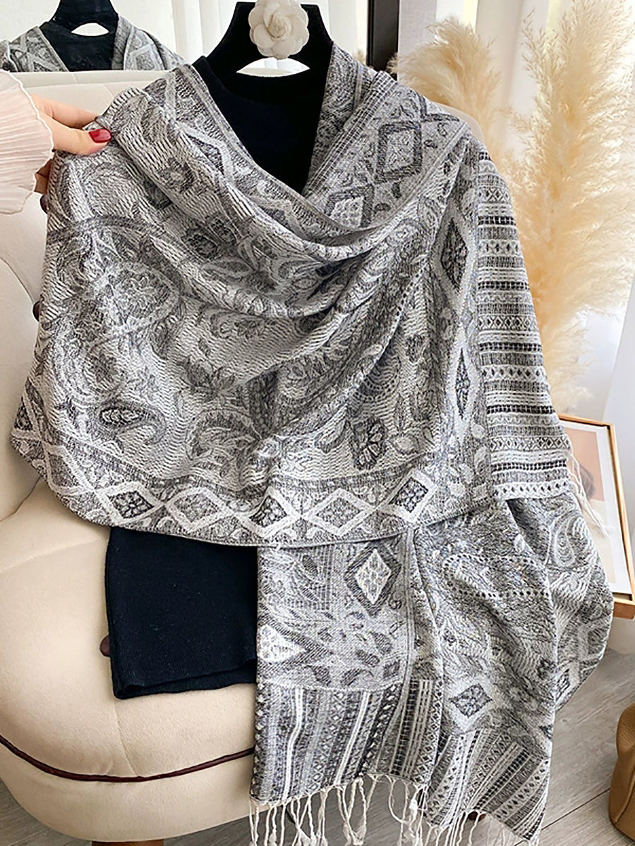 Women Winter Flower Jacquard Tassel Shawl Scarf