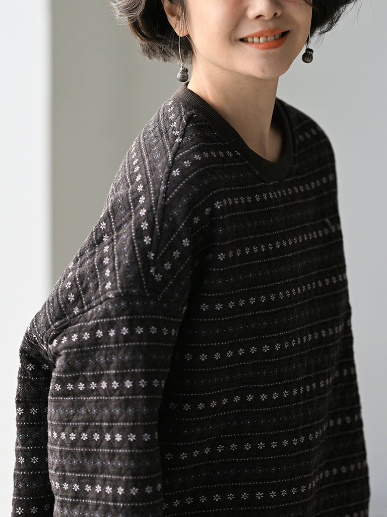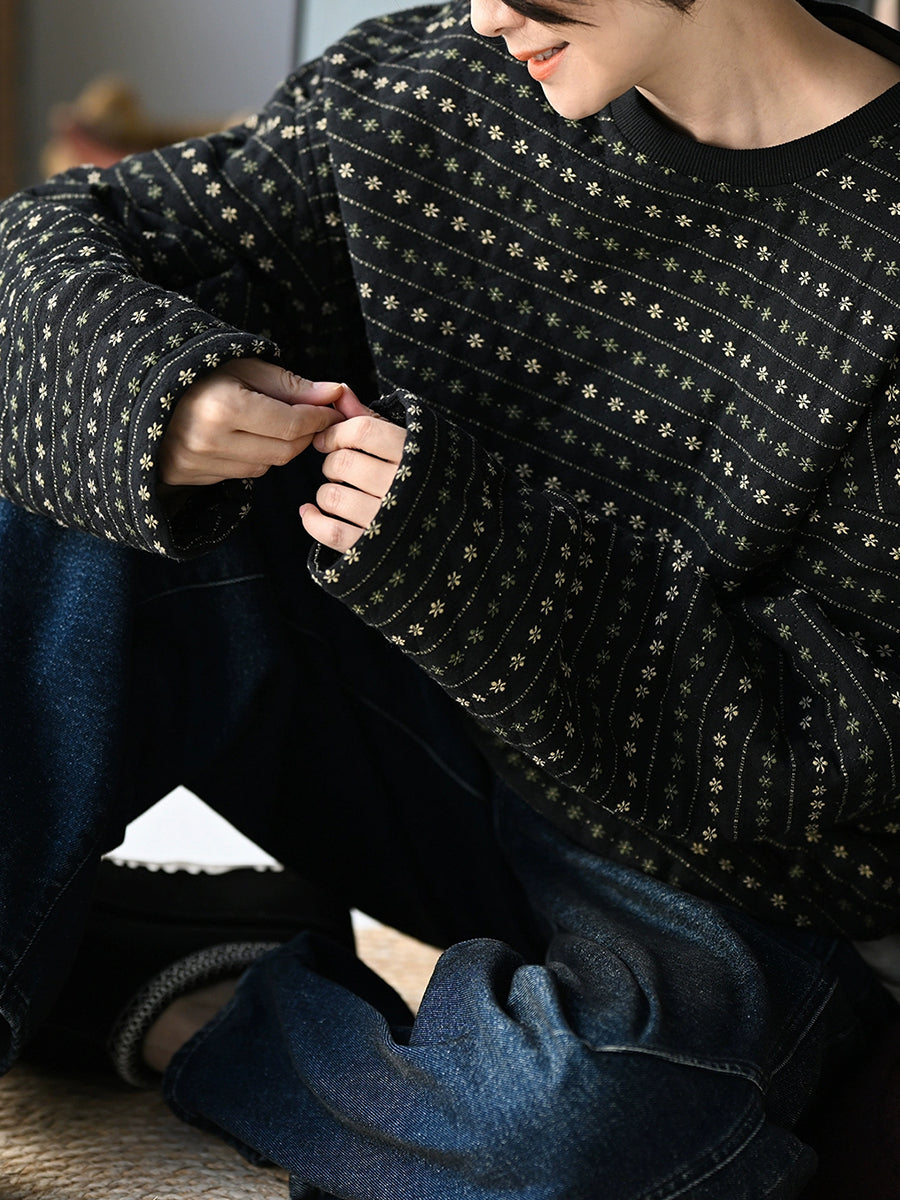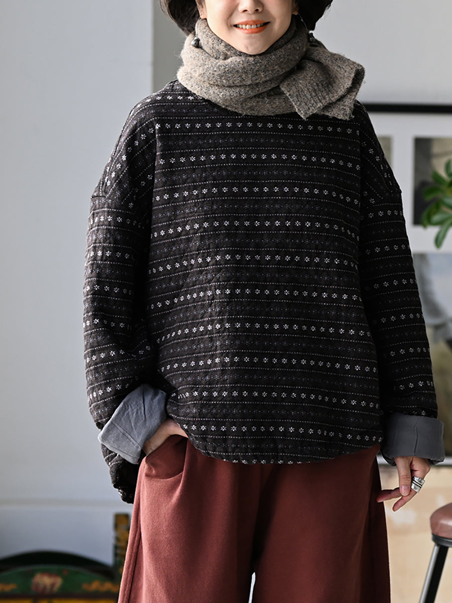 Women Winter Retro Floral Stripe O-Neck Padded Coat
