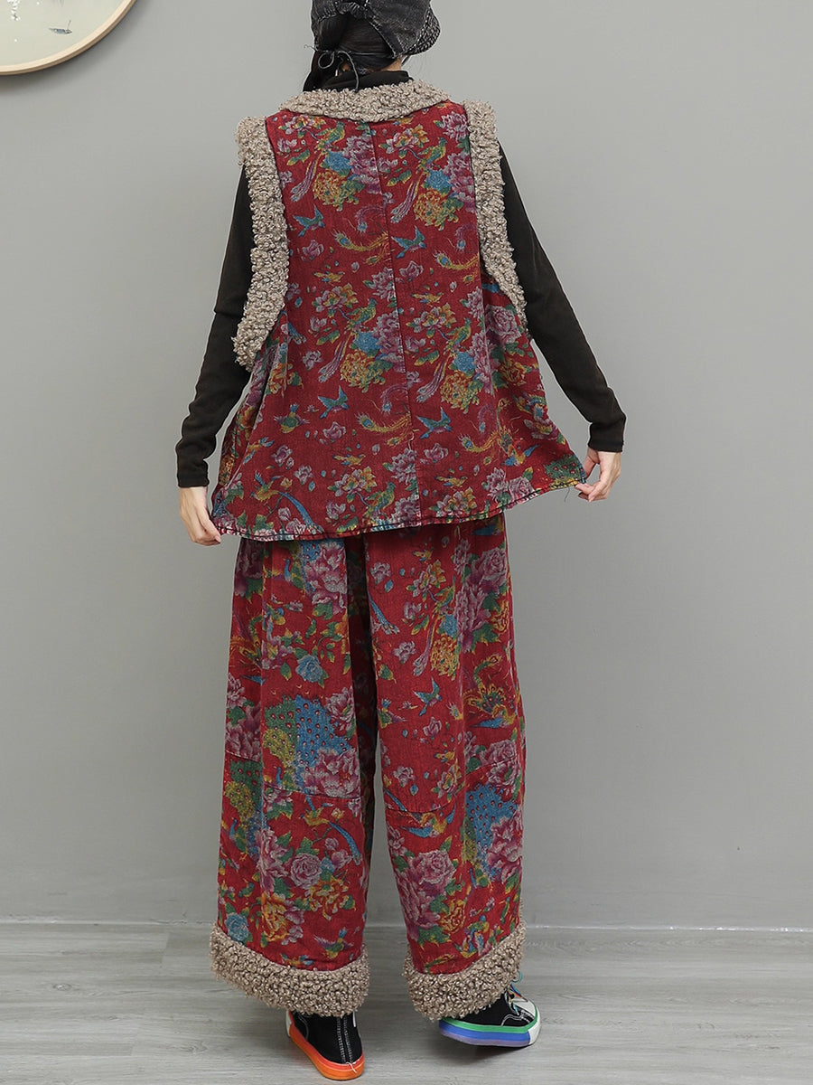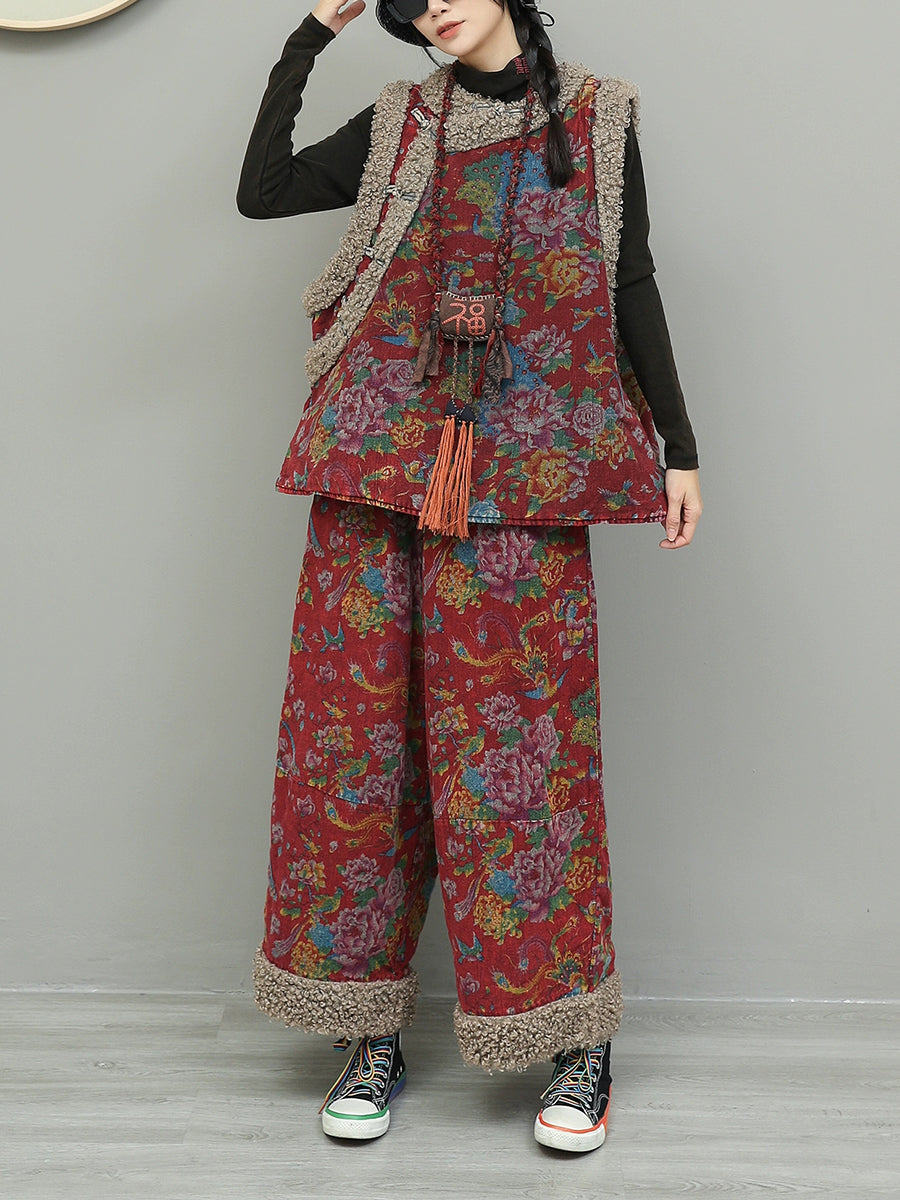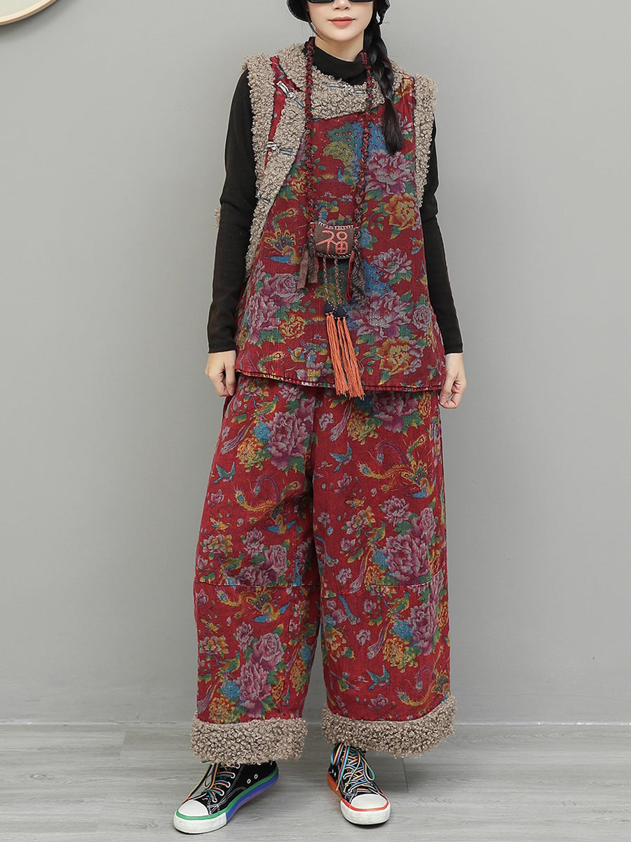 Women Winter Retro Flower Fleece Spliced O-Neck Padded Suits