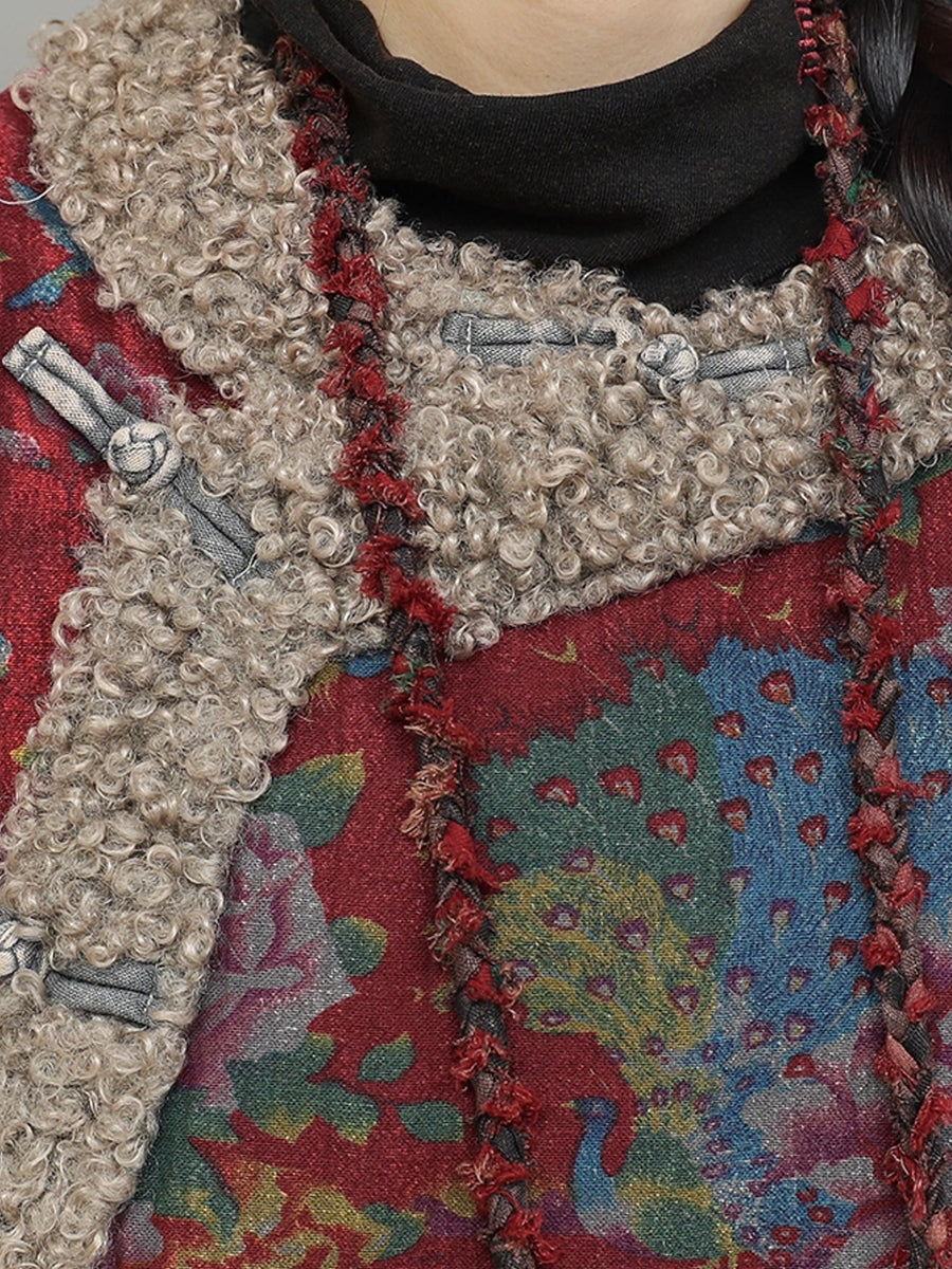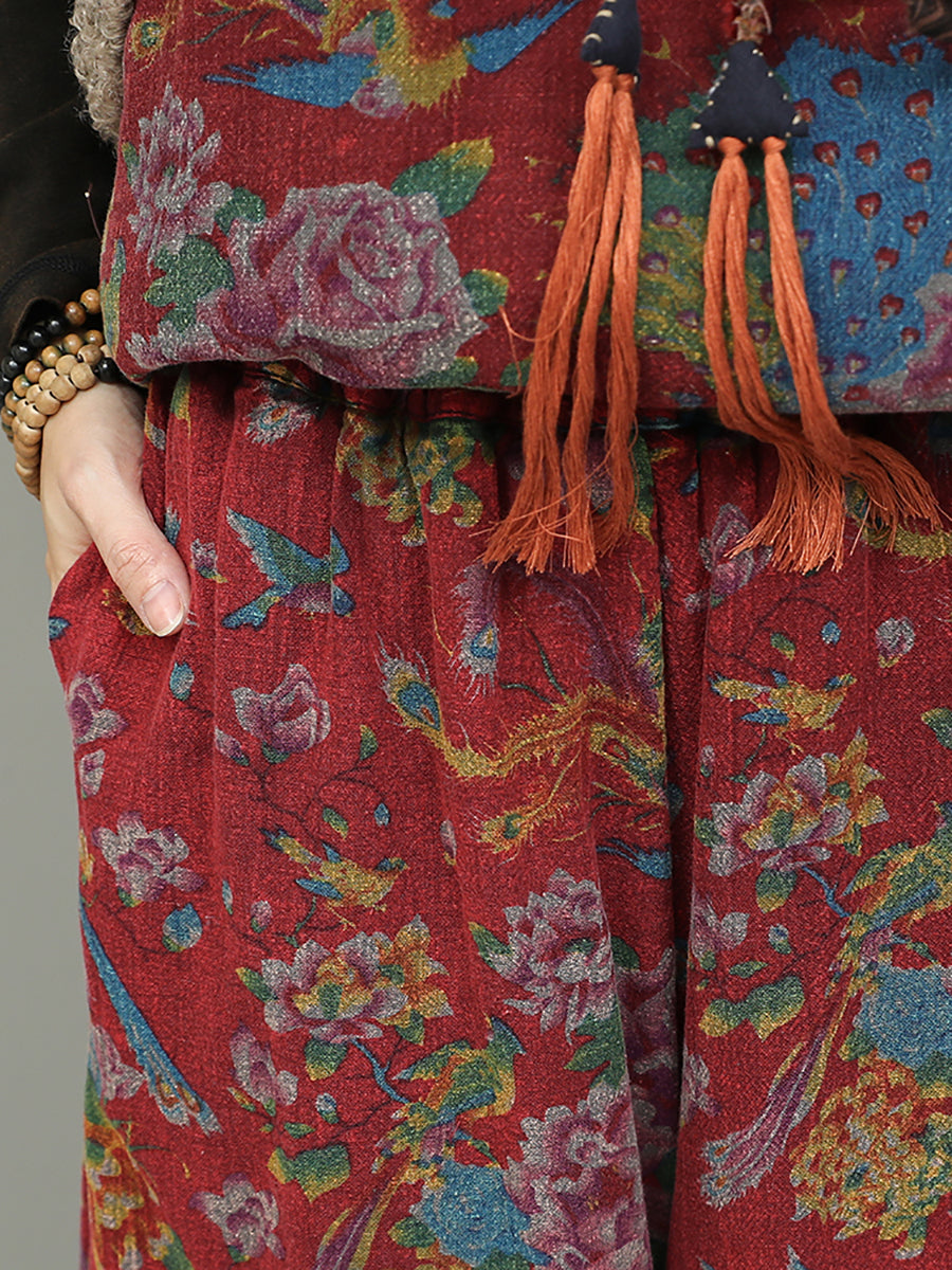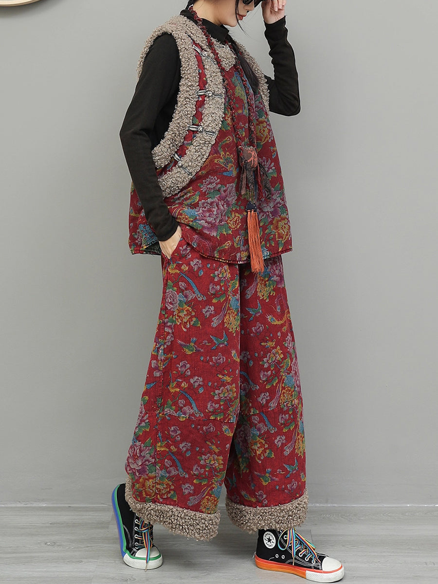 Women Winter Retro Flower Fleece Spliced O-Neck Padded Suits