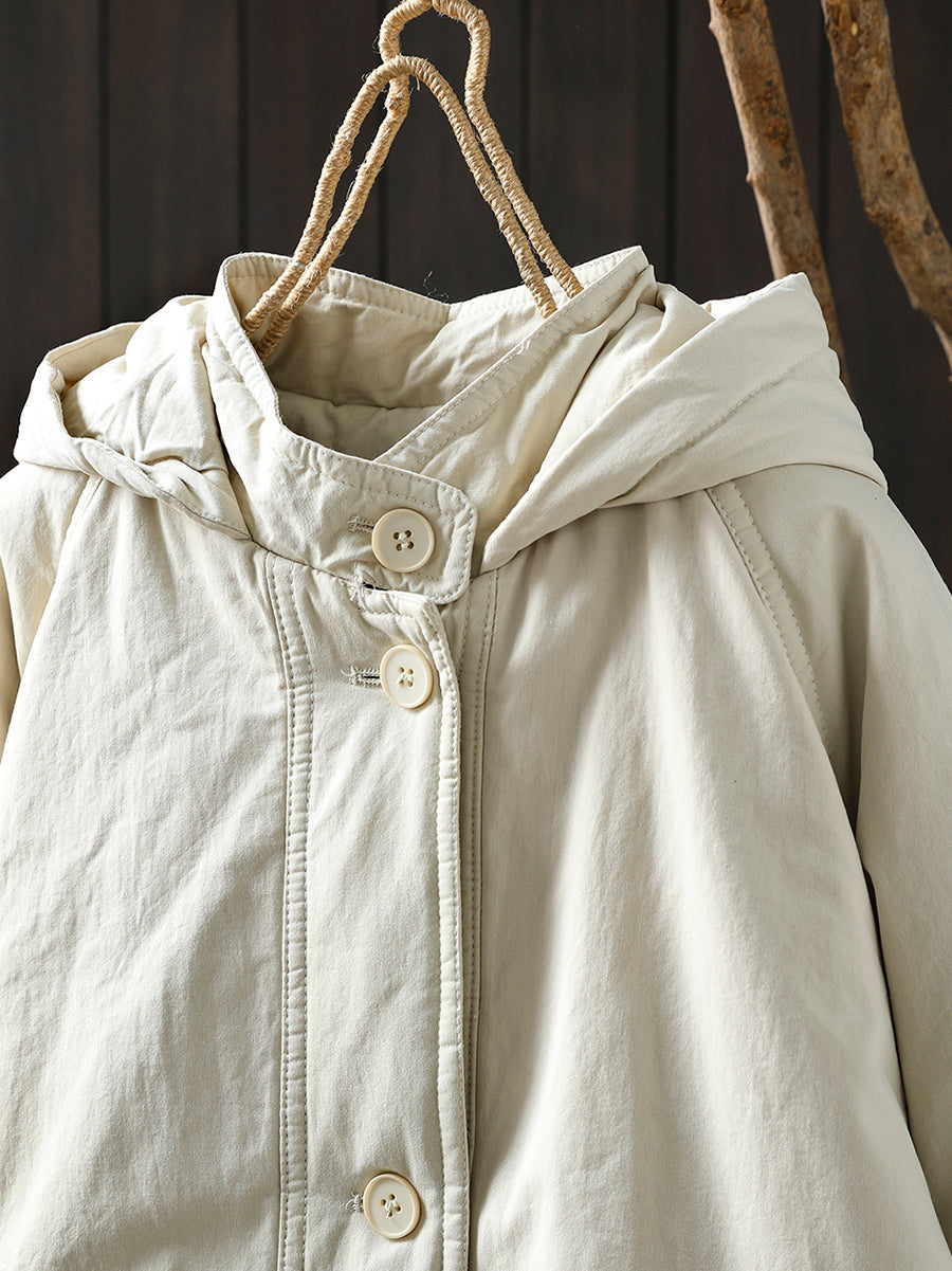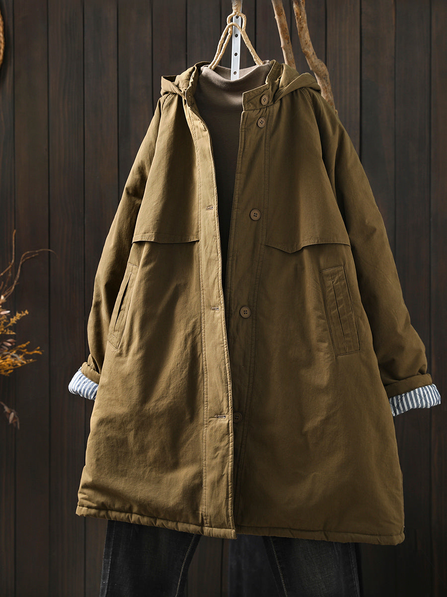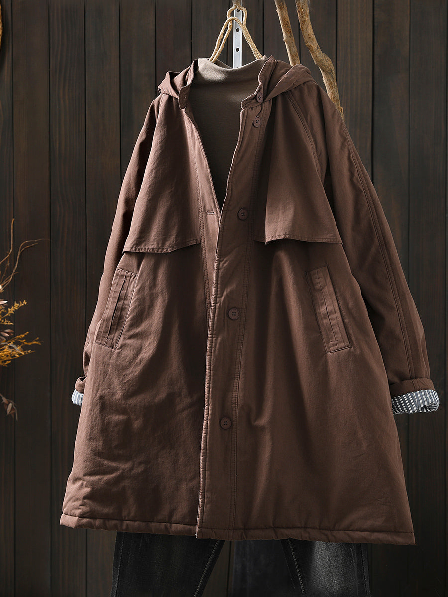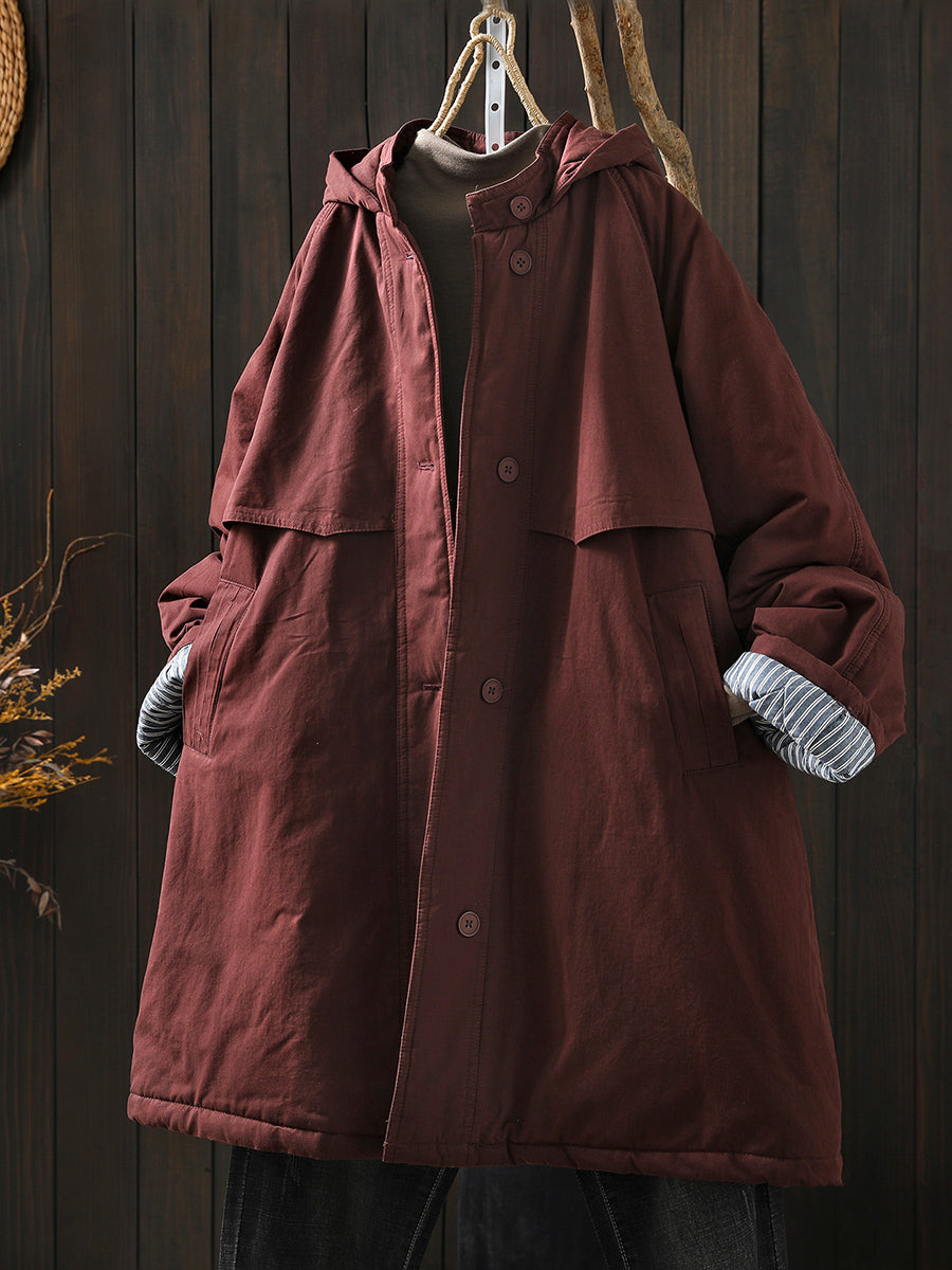 Women Winter Retro Pure Color Hooded Padded Coat