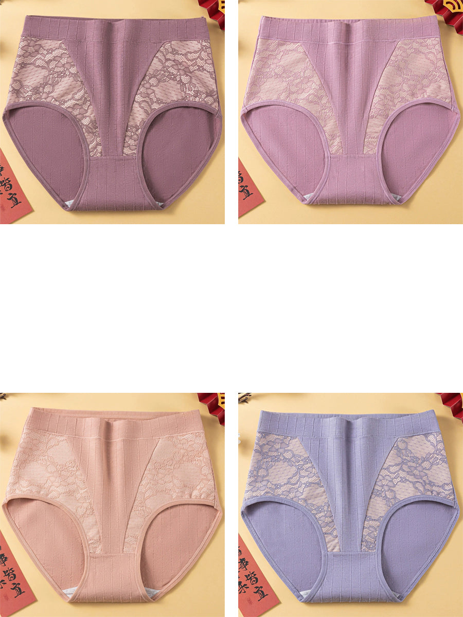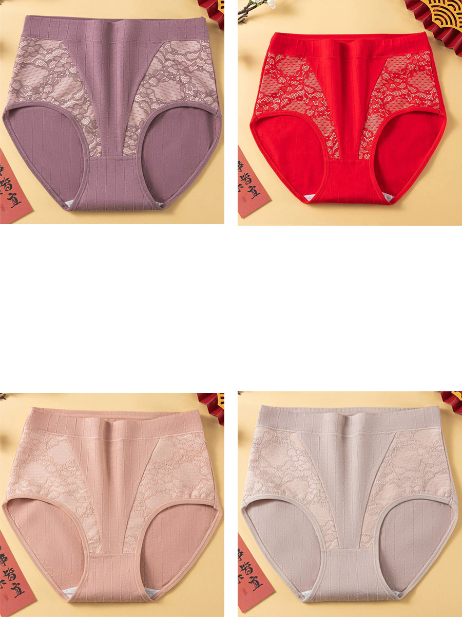 4件女士藝術花朵蕾絲高腰內褲