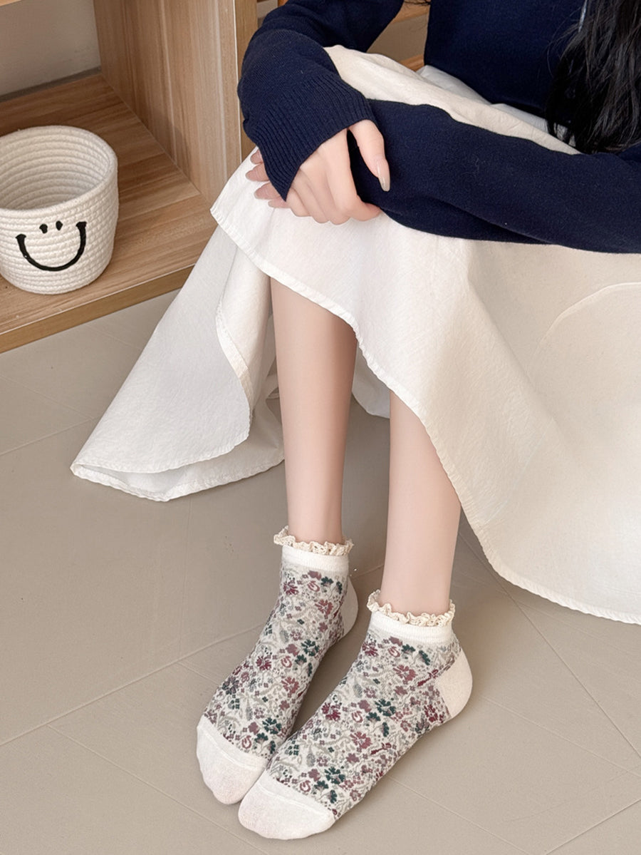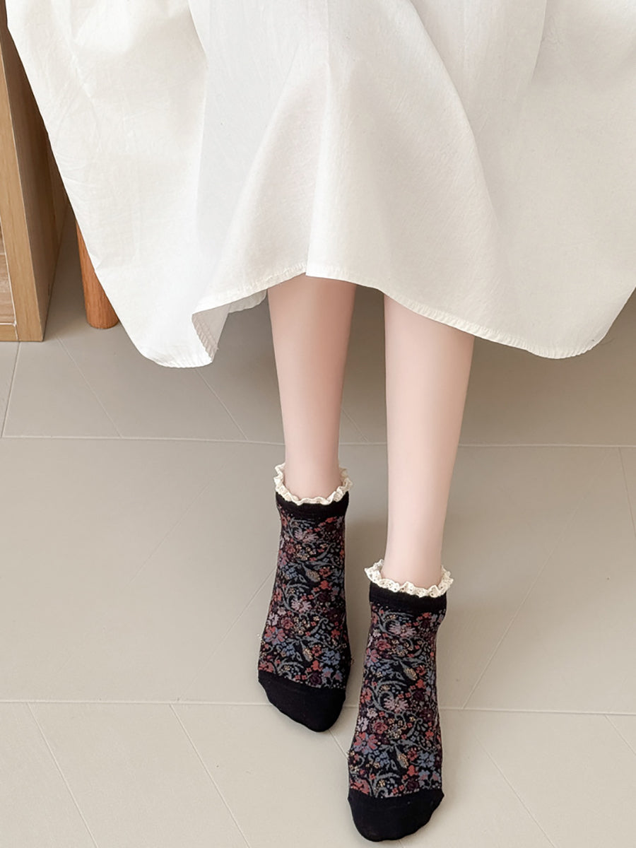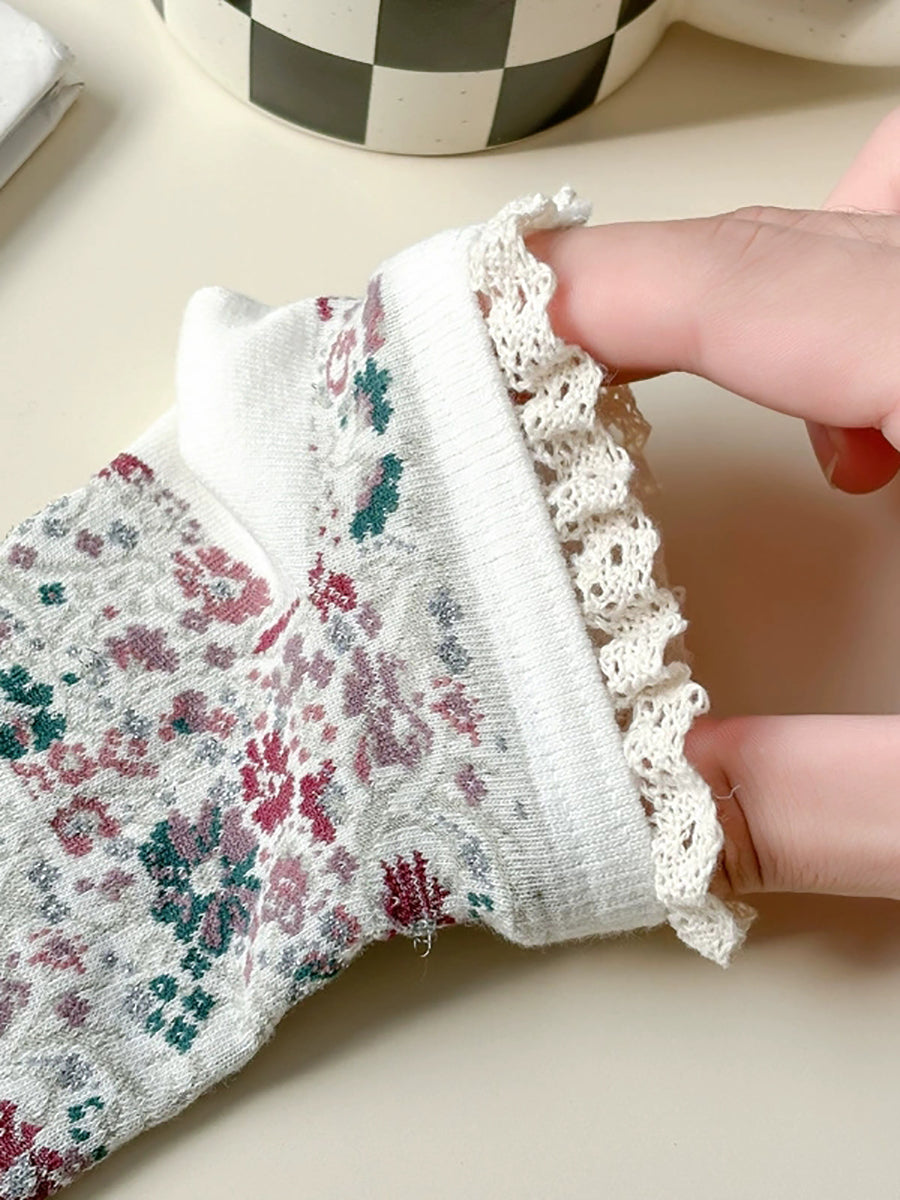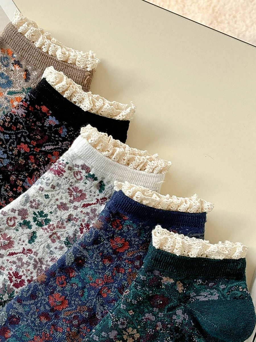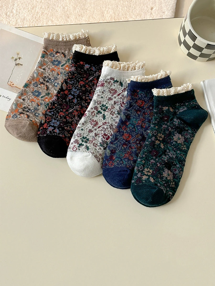 5雙女士藝術花卉蕾絲拼接襪子