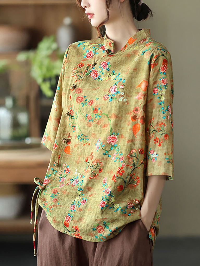 大尺寸 - 棉麻花卉不規則復古襯衫
