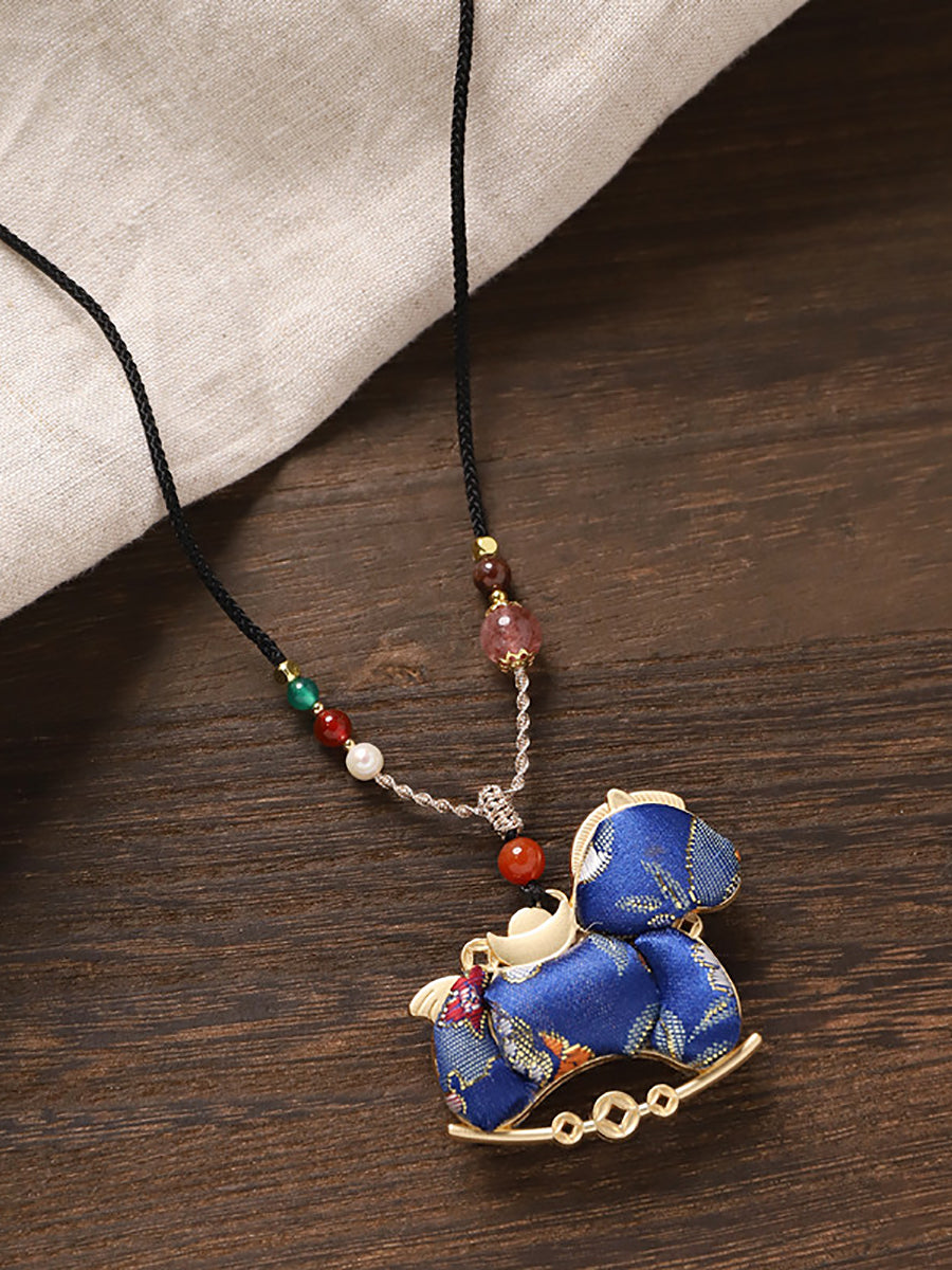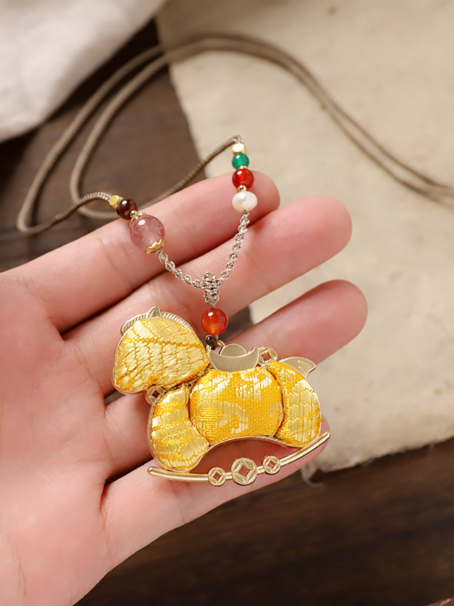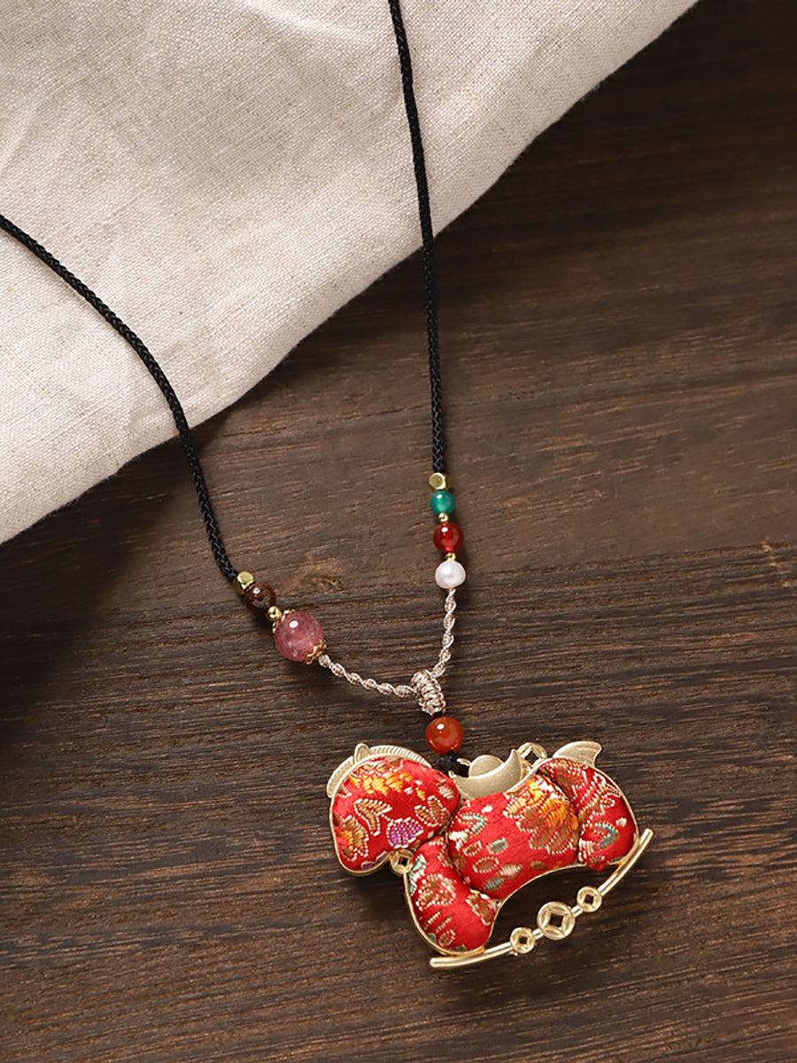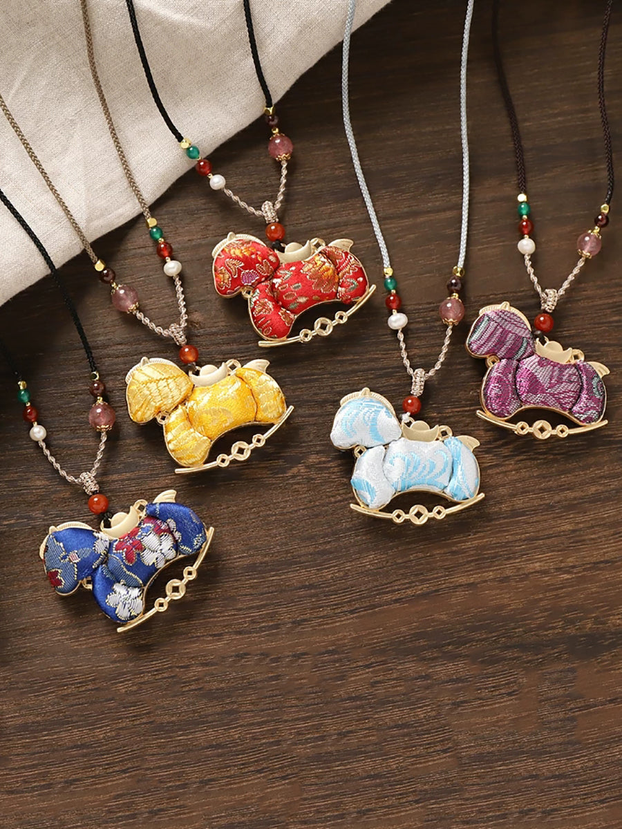 民族風雙面錦緞馬吊墜長項鍊