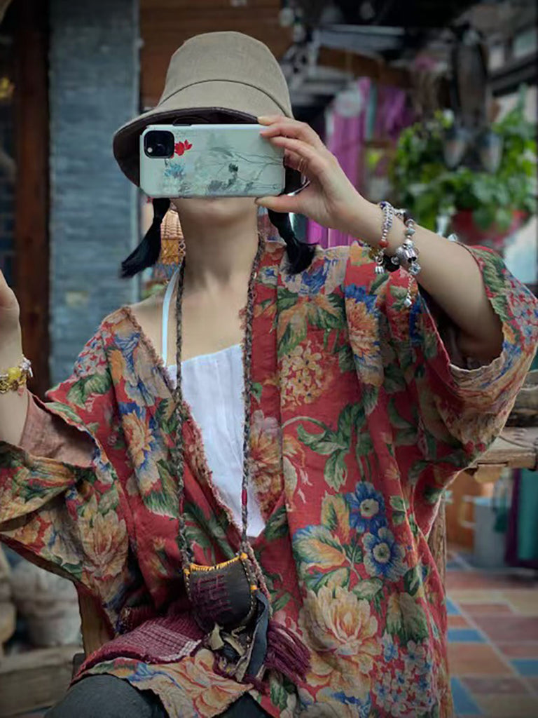 大尺碼花卉秋季女式寬鬆復古襯衫