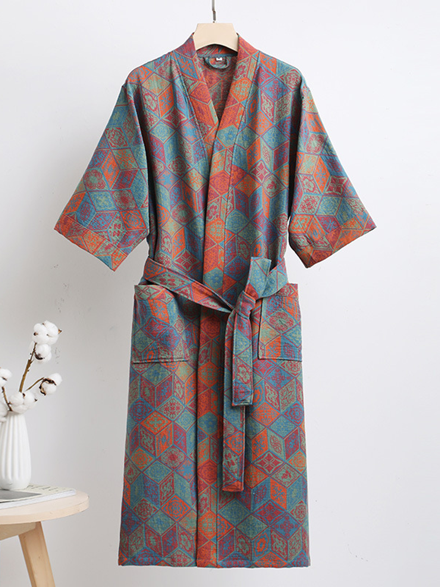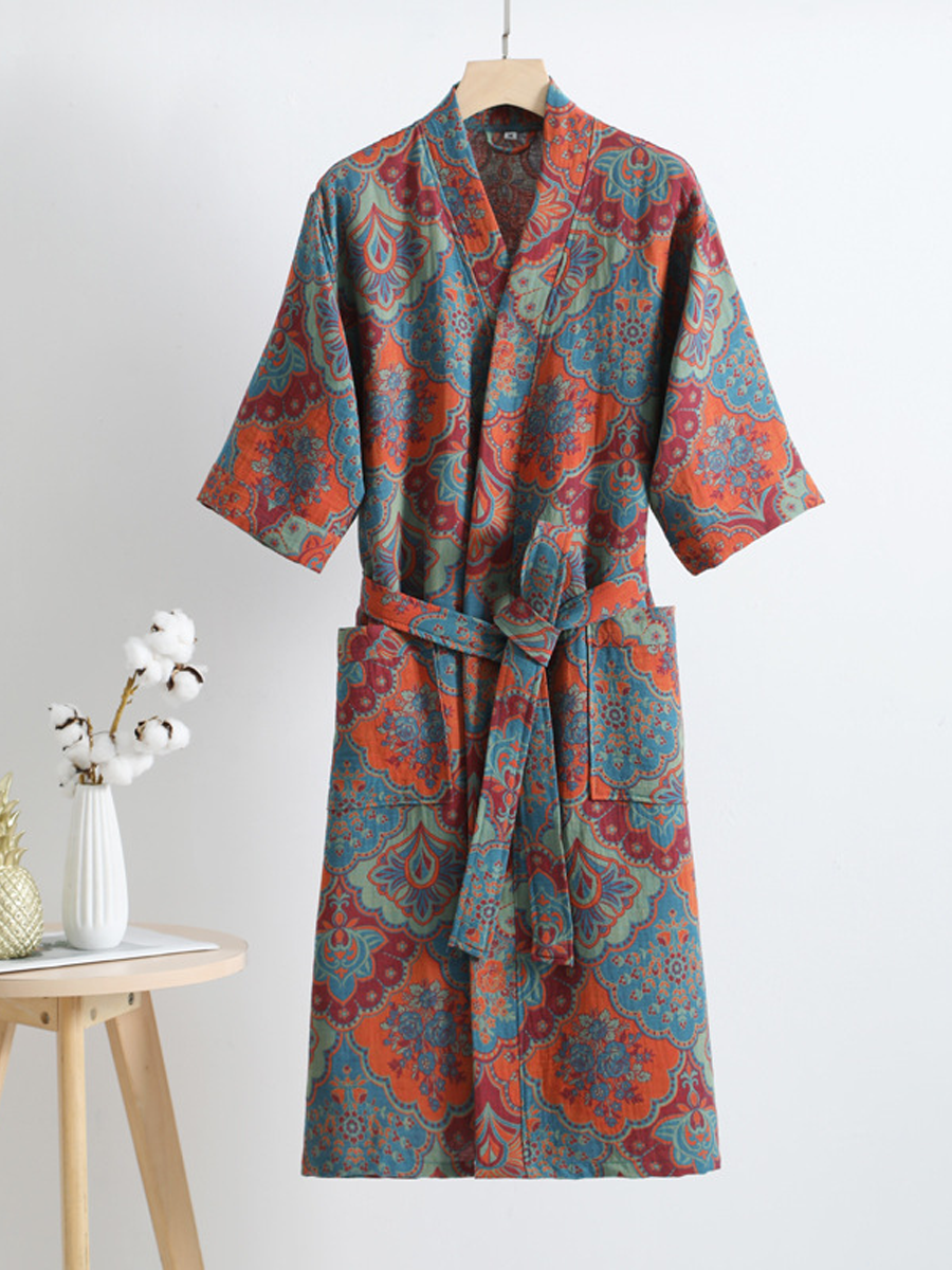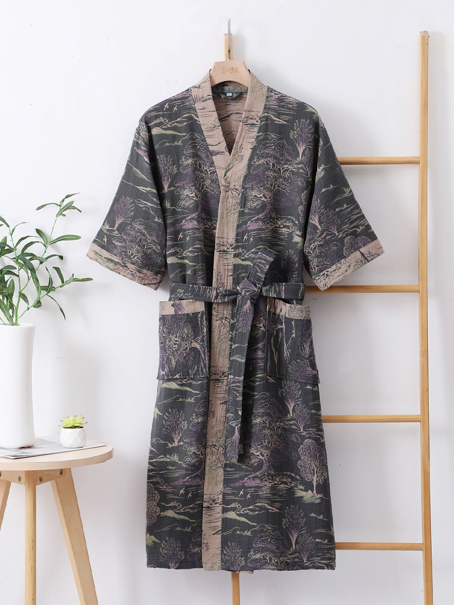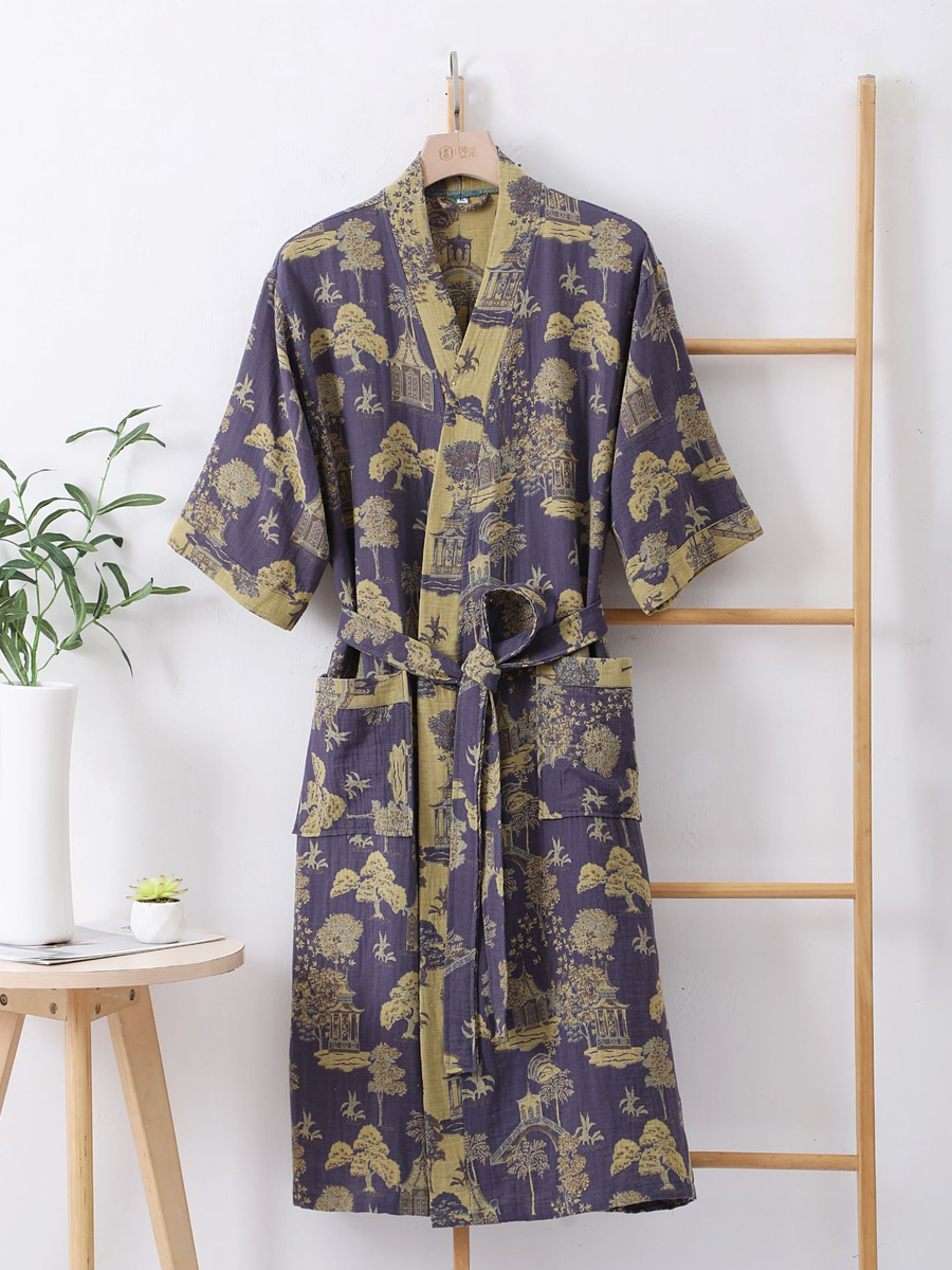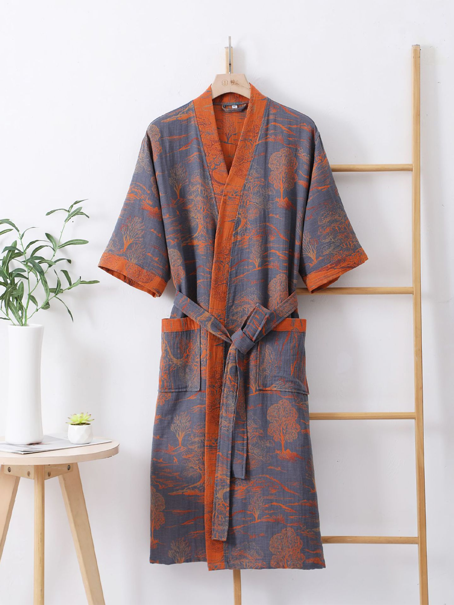 我們的棉紗浴袍採用中長款設計,長度及膝,由100%純棉紗布製成。浴袍觸感柔軟,飾以優雅的佩斯利花紋,透氣耐穿,是居家休閒或沐浴後穿著的理想之選,為您帶來時尚舒適的體驗。