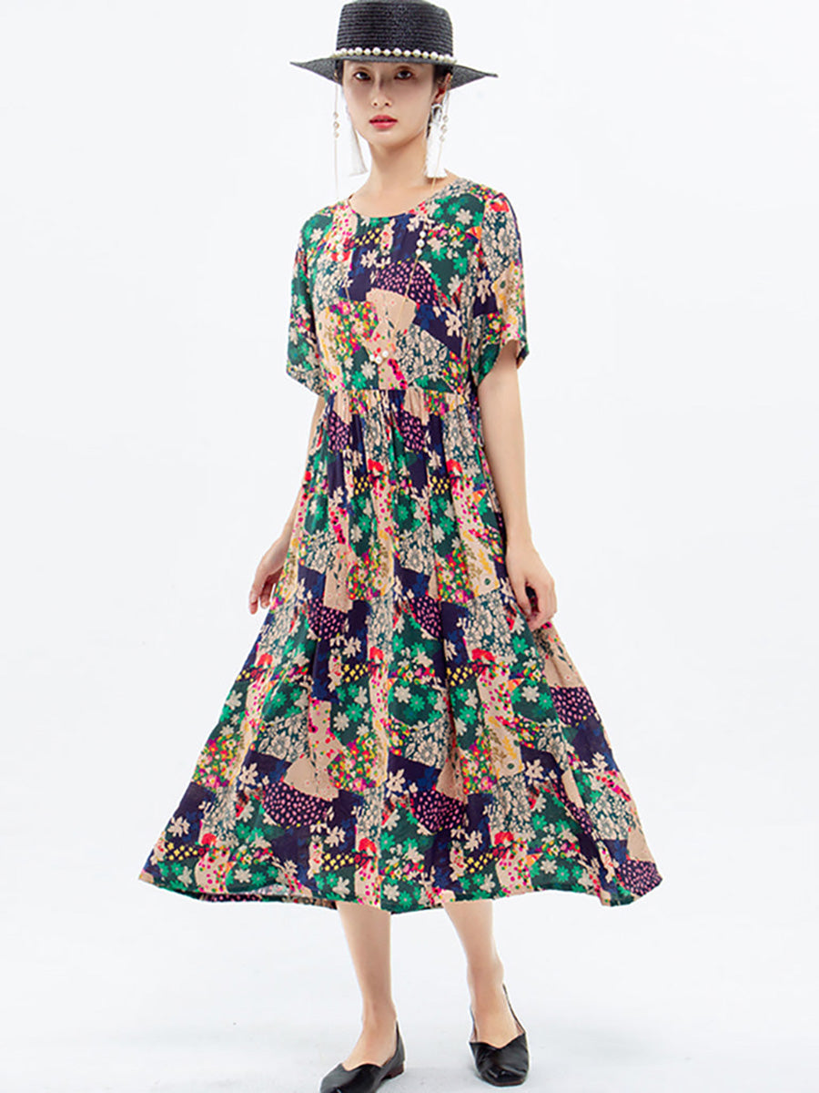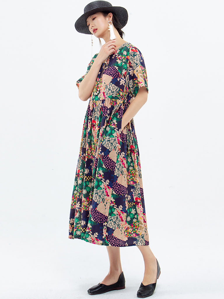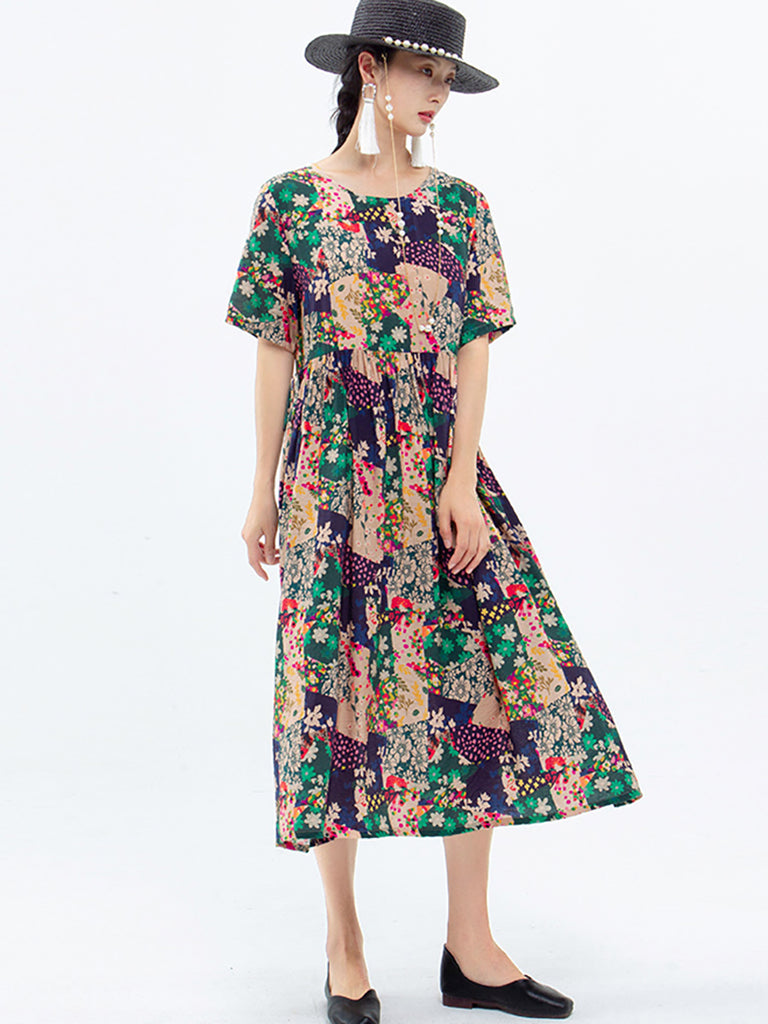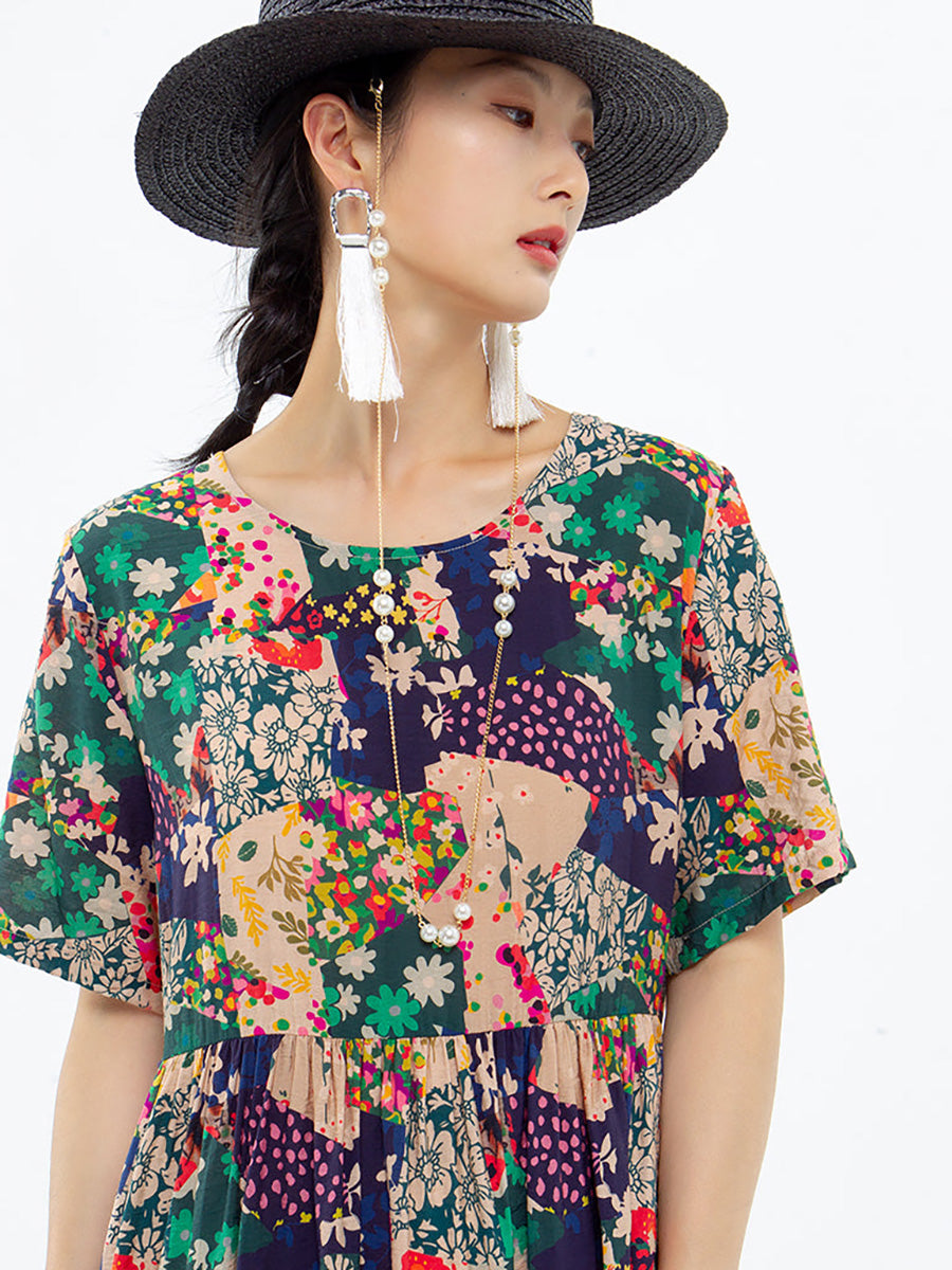大尺碼花卉印花短袖夏季寬鬆連身裙