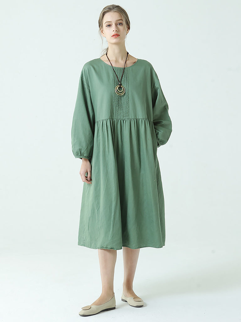 大尺碼亞麻棉質褶皺春季長袖連身裙