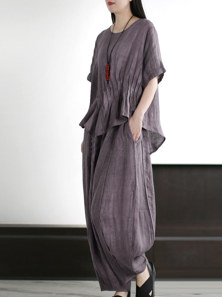 大尺碼女復古純色亞麻棉襯衫+褲子