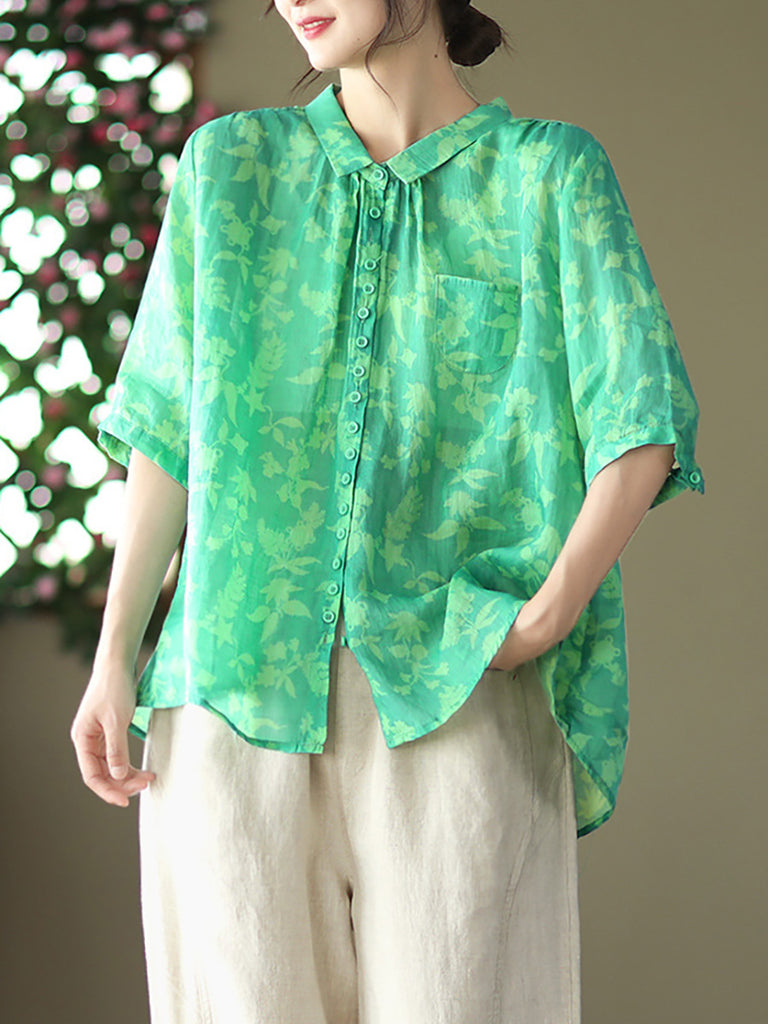大尺碼復古花卉苧麻休閒夏季女襯衫