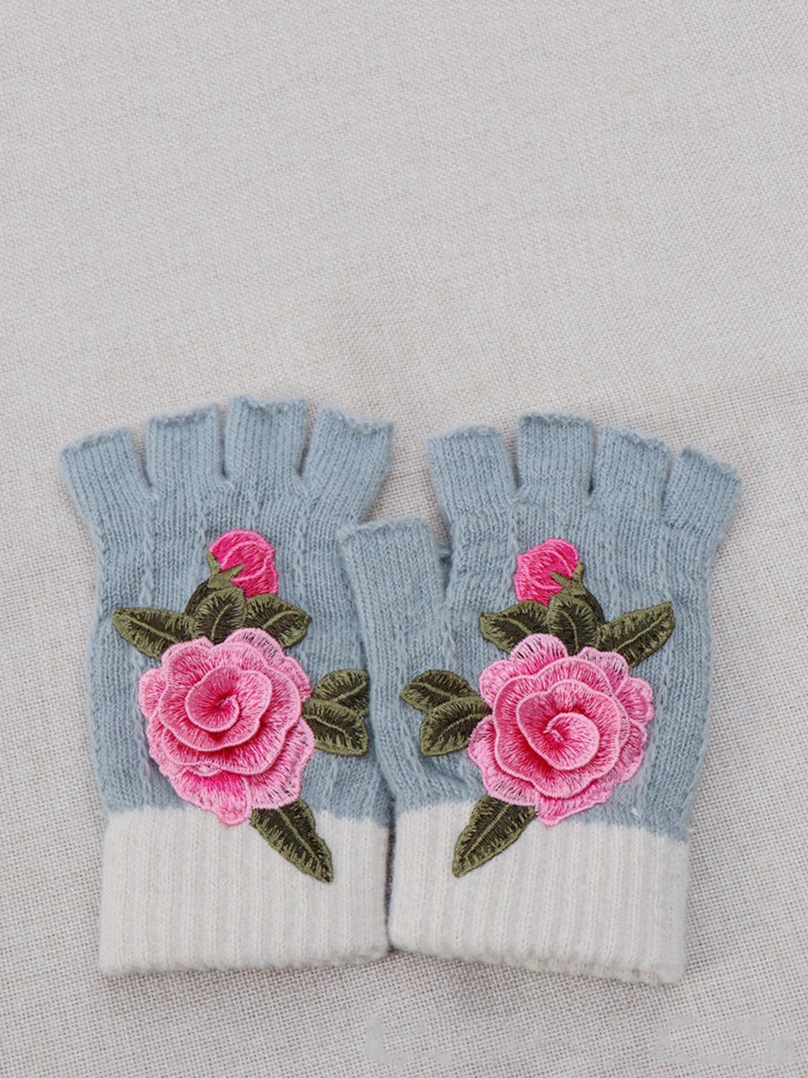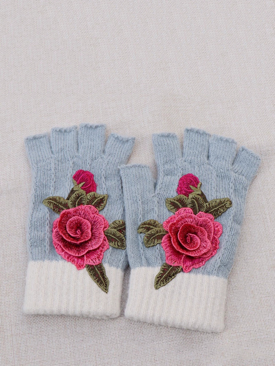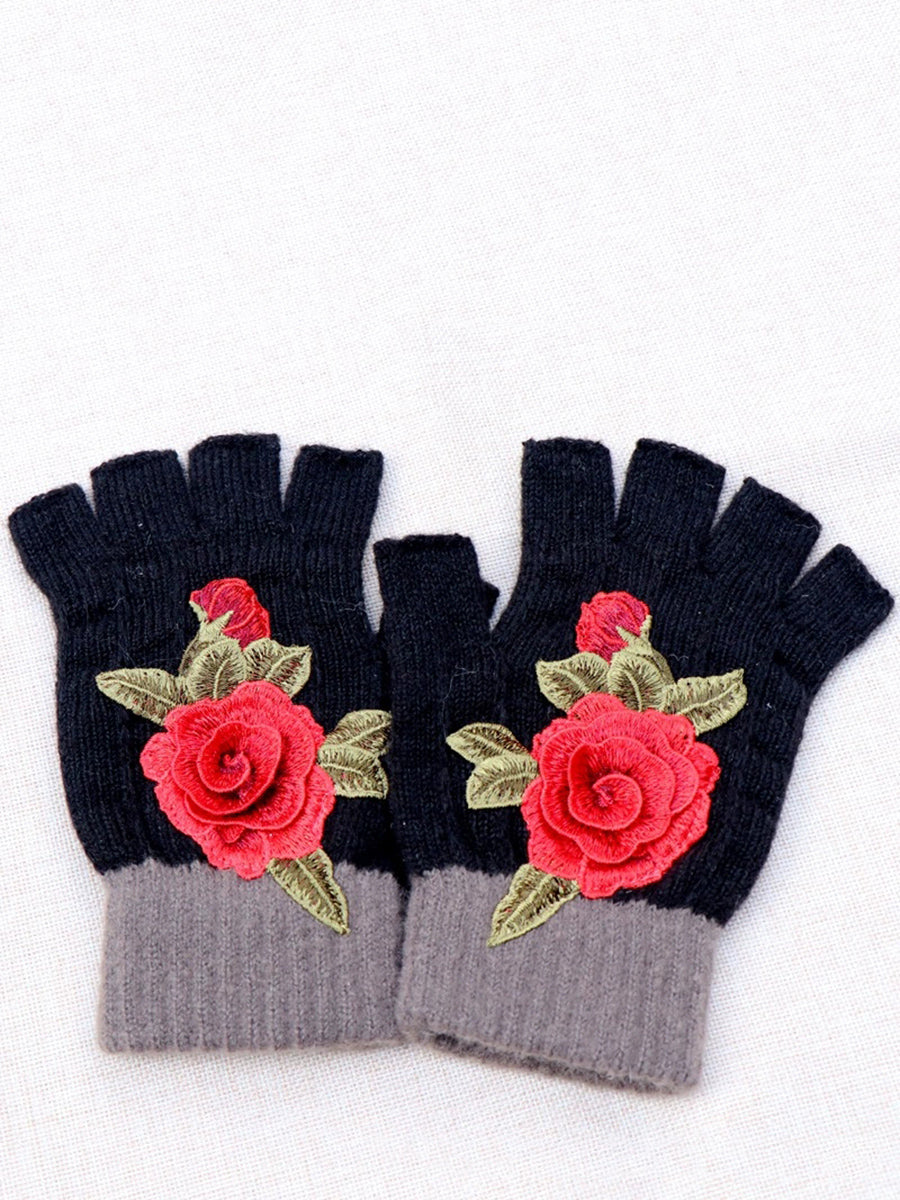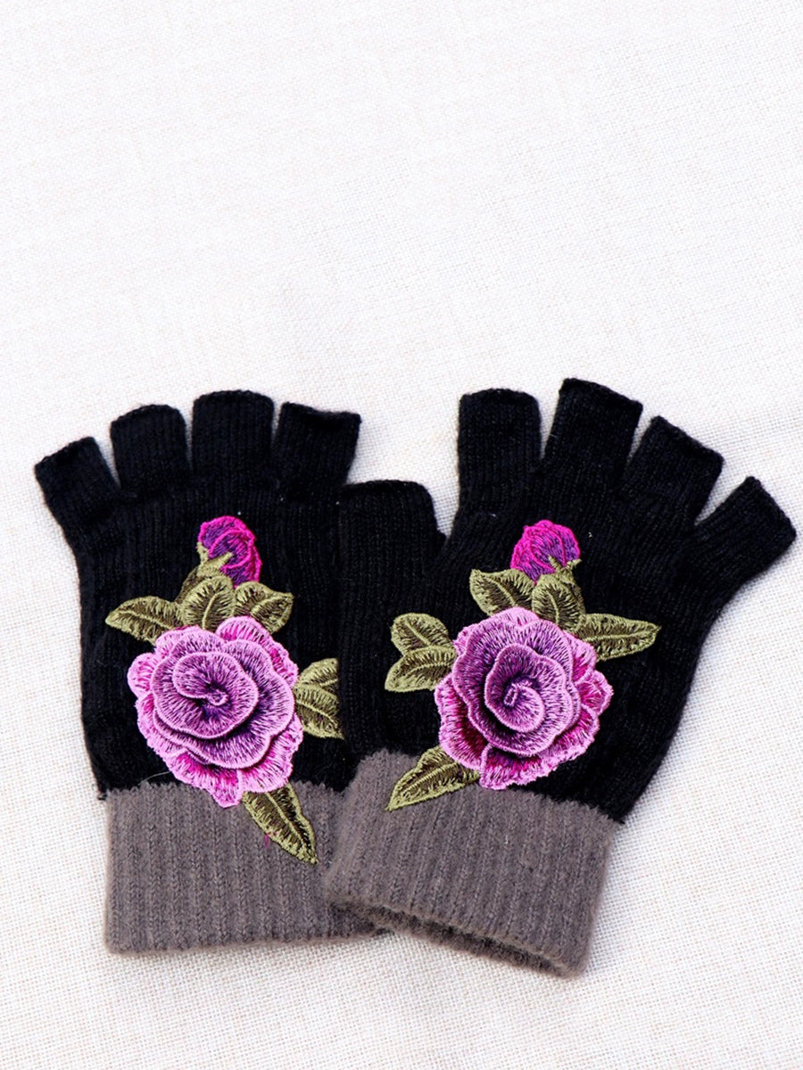 冬季藝術花卉刺繡拼接手套