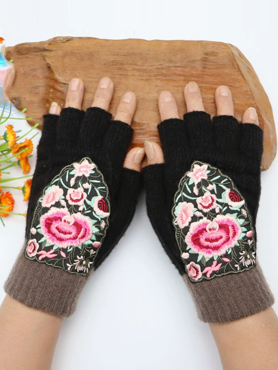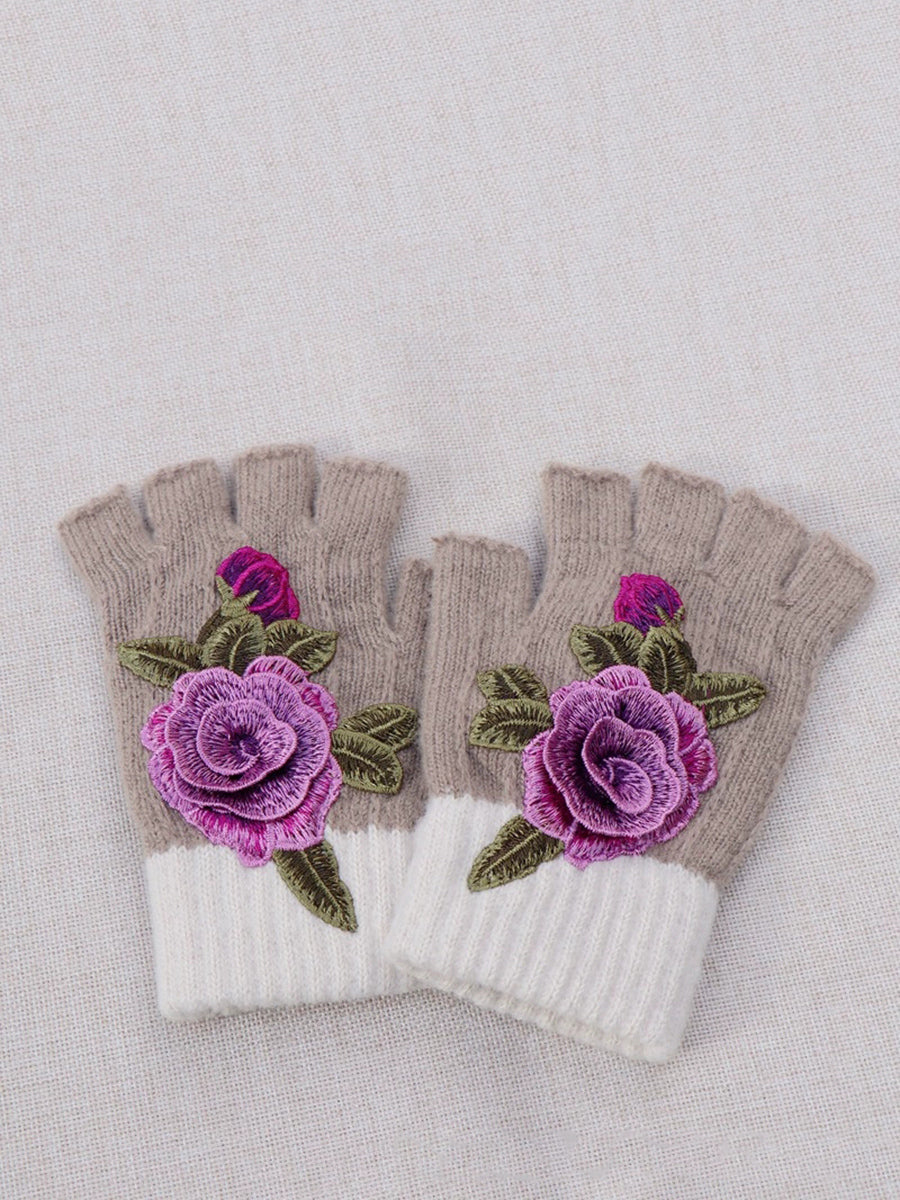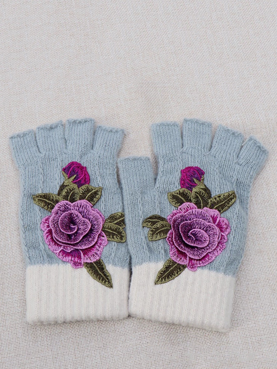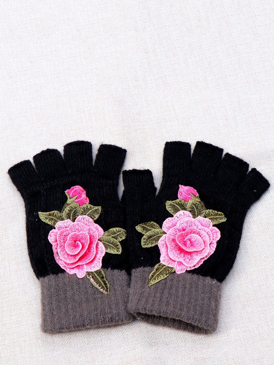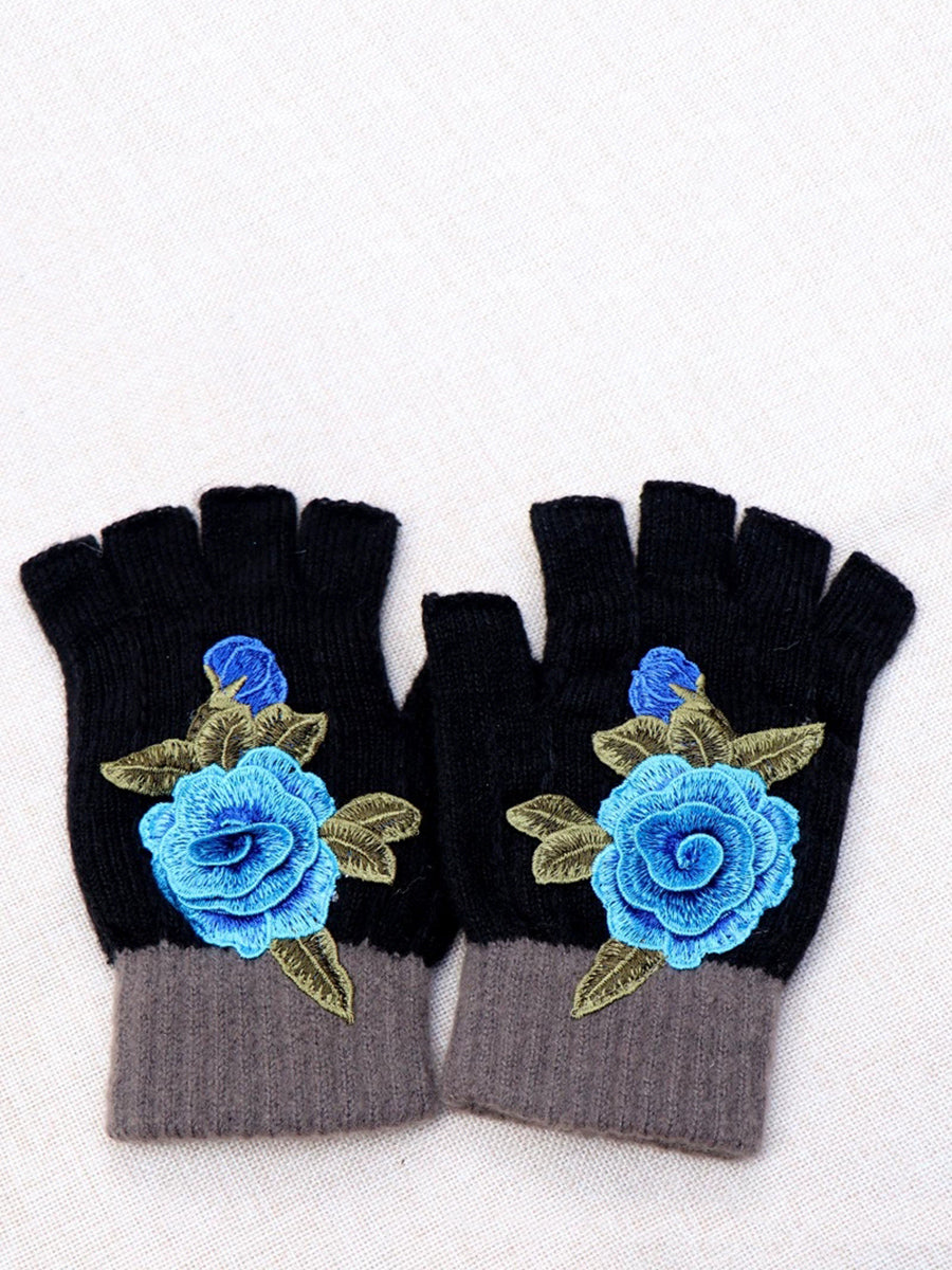 冬季藝術花卉刺繡拼接手套