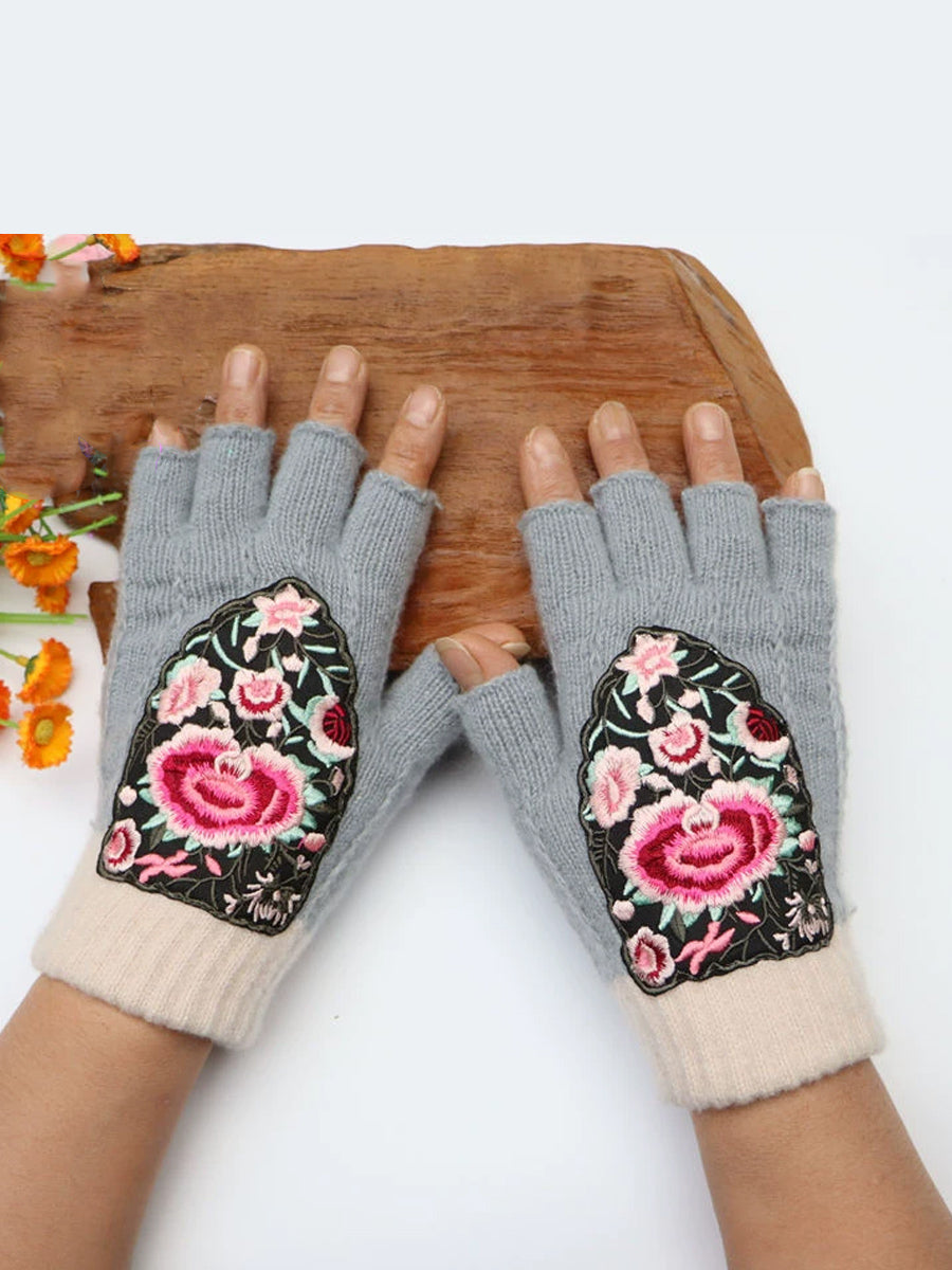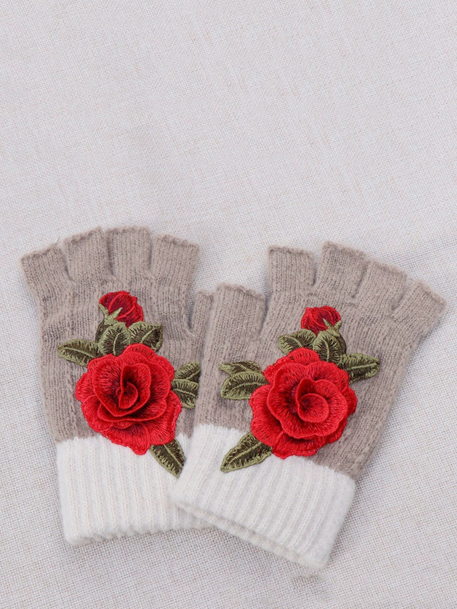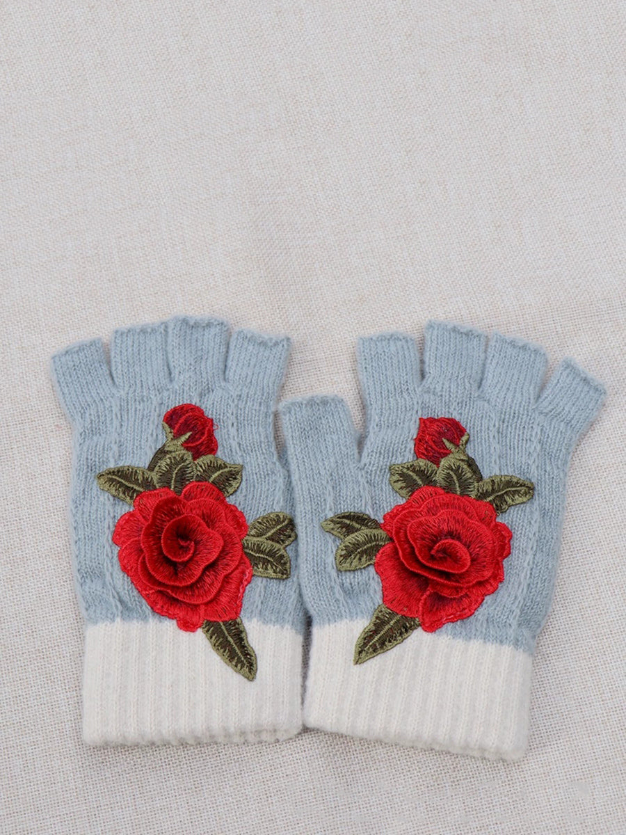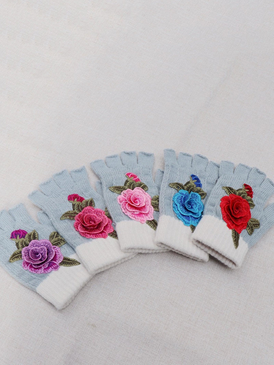 冬季藝術花卉刺繡拼接手套