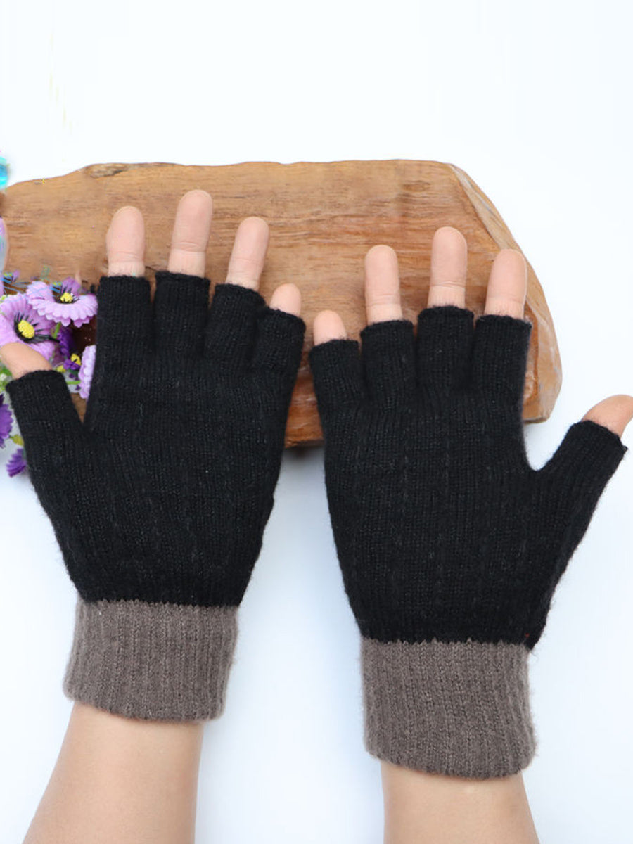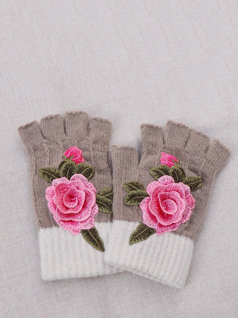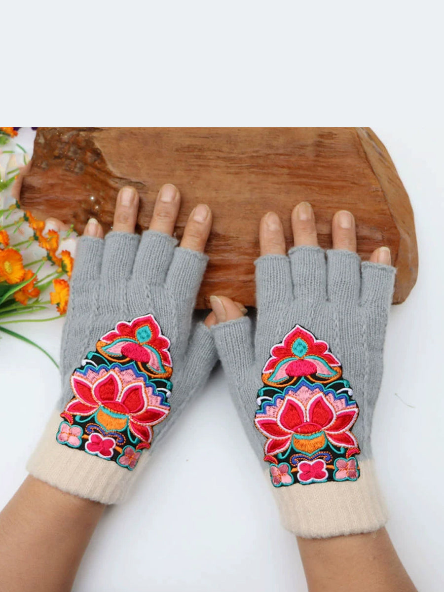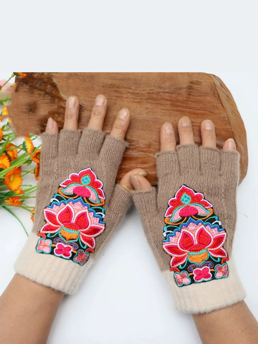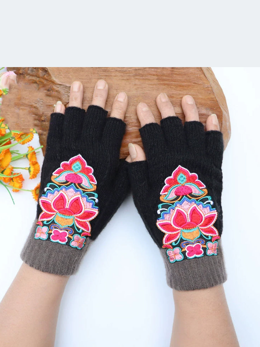 冬季藝術花卉刺繡拼接手套