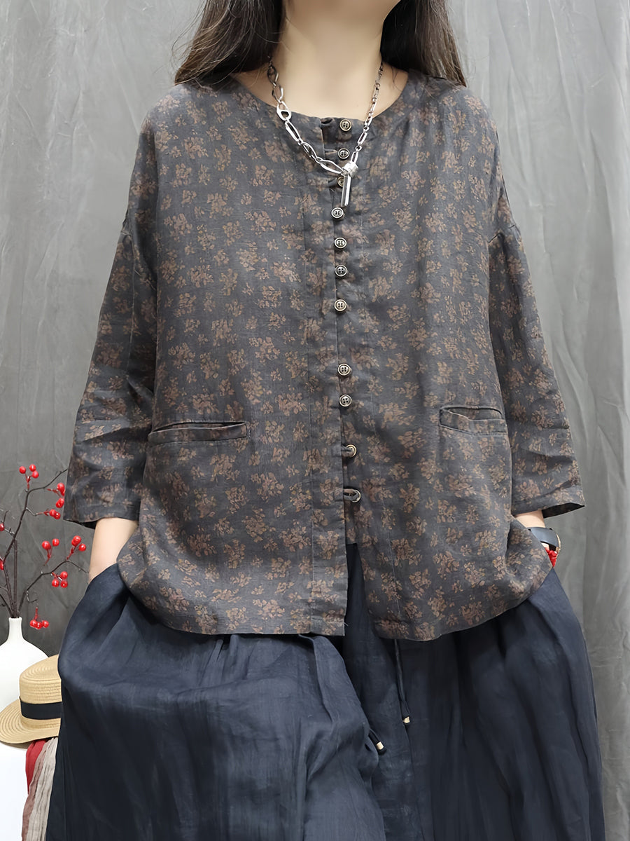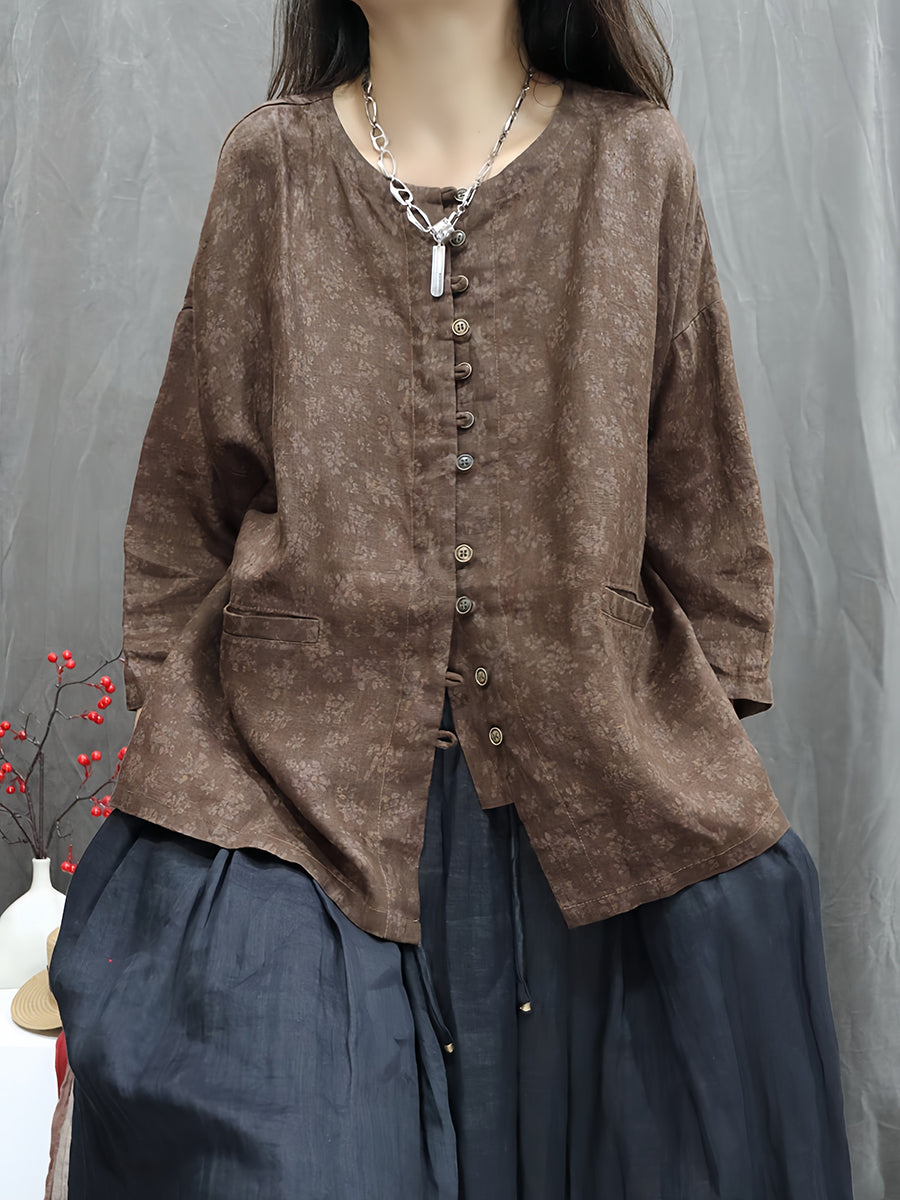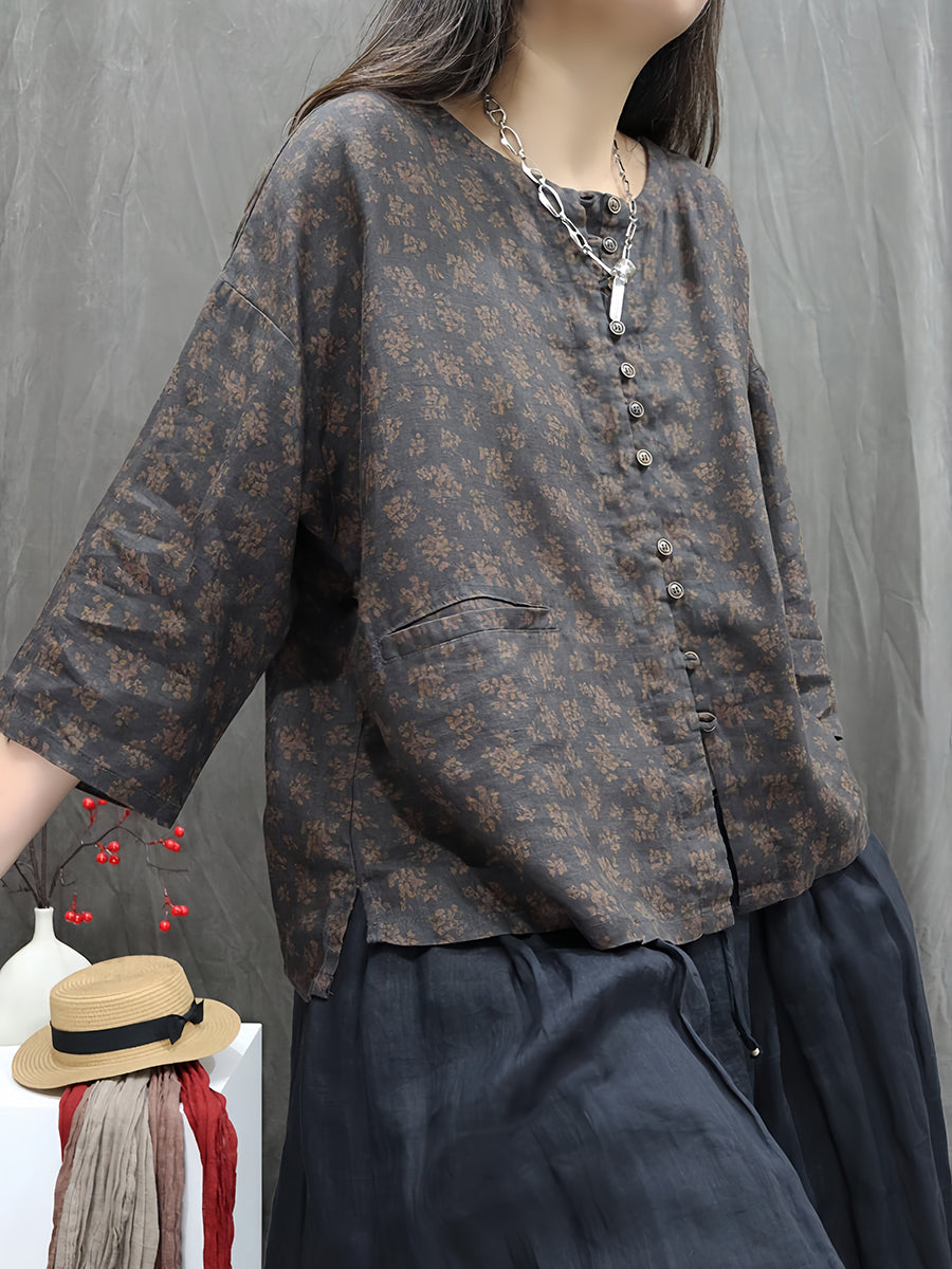 女士藝術風春季花卉圖案100%亞麻圓領襯衫