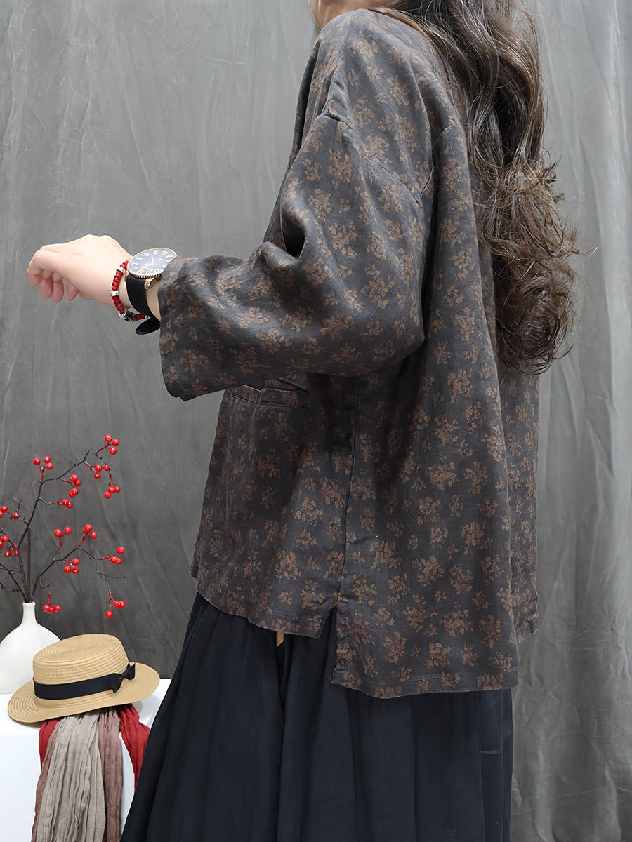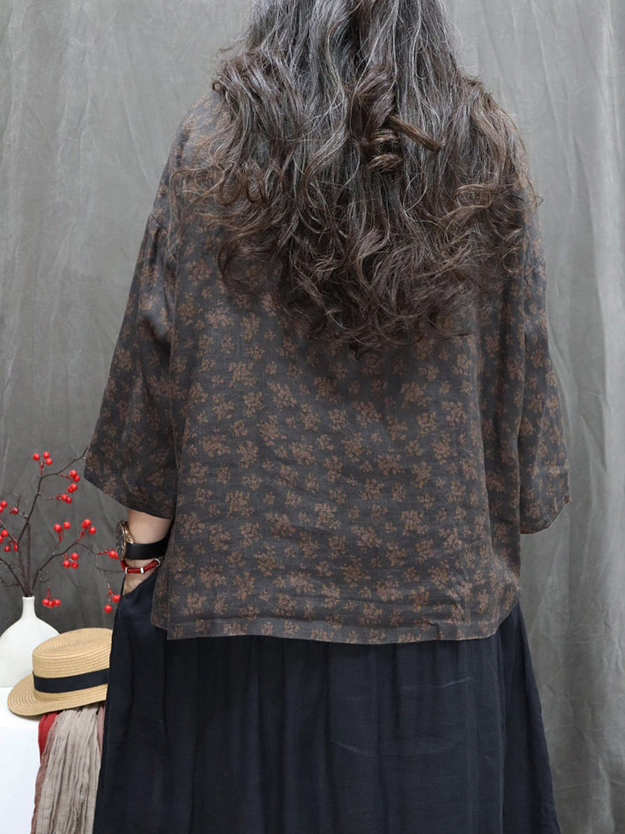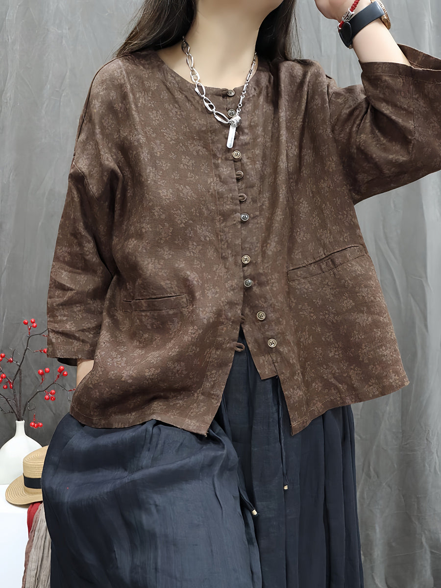 女士藝術風春季花卉圖案100%亞麻圓領襯衫
