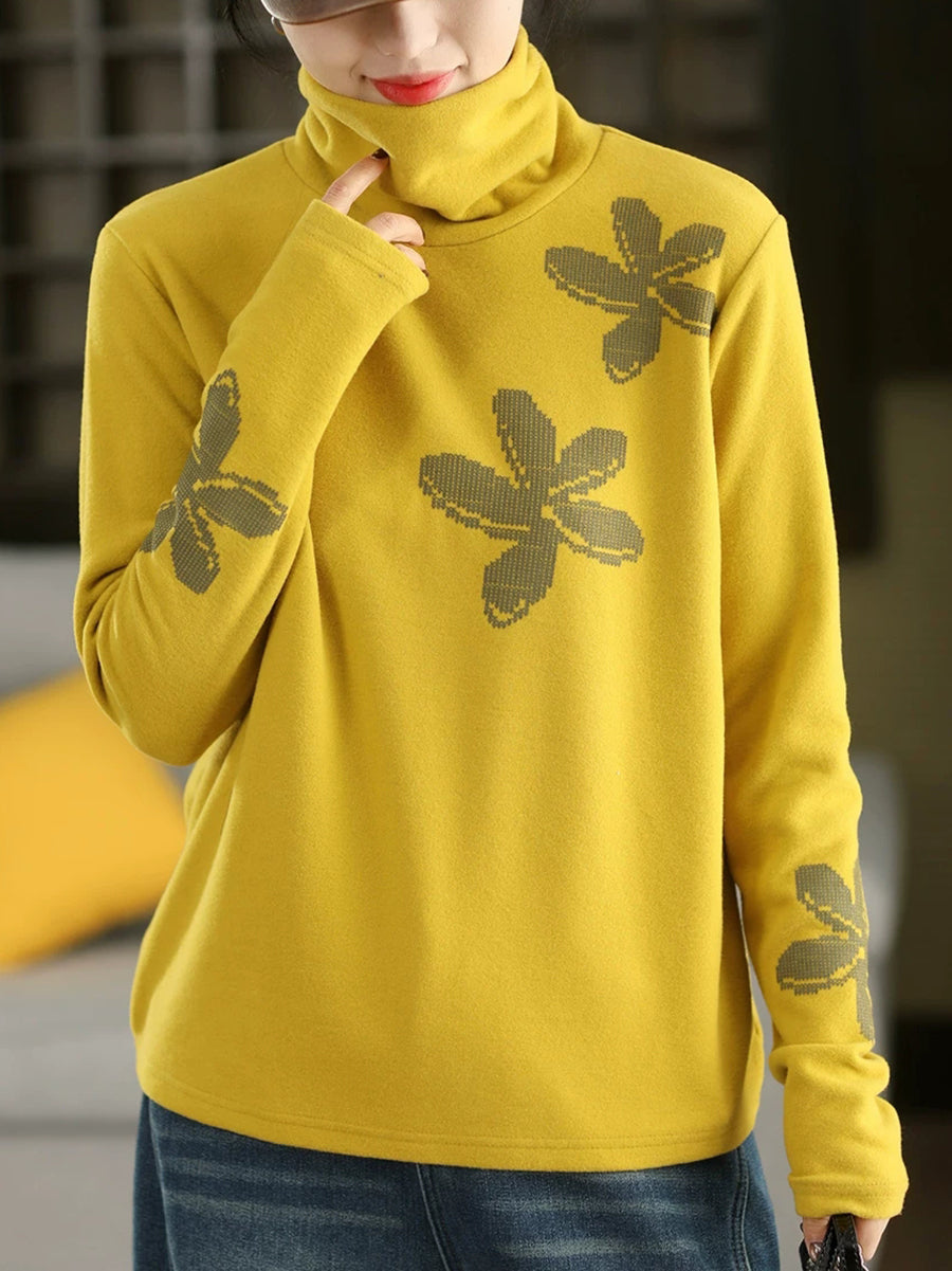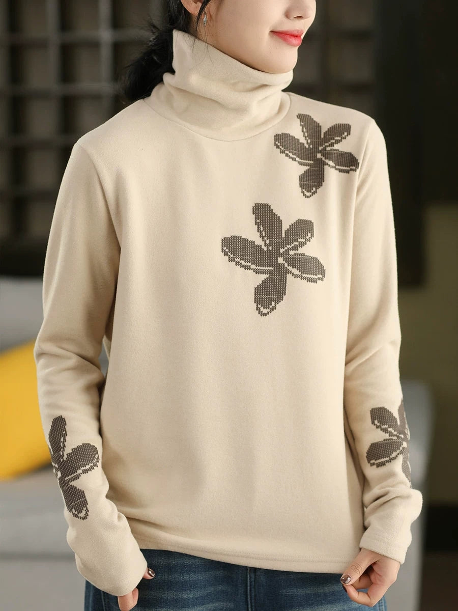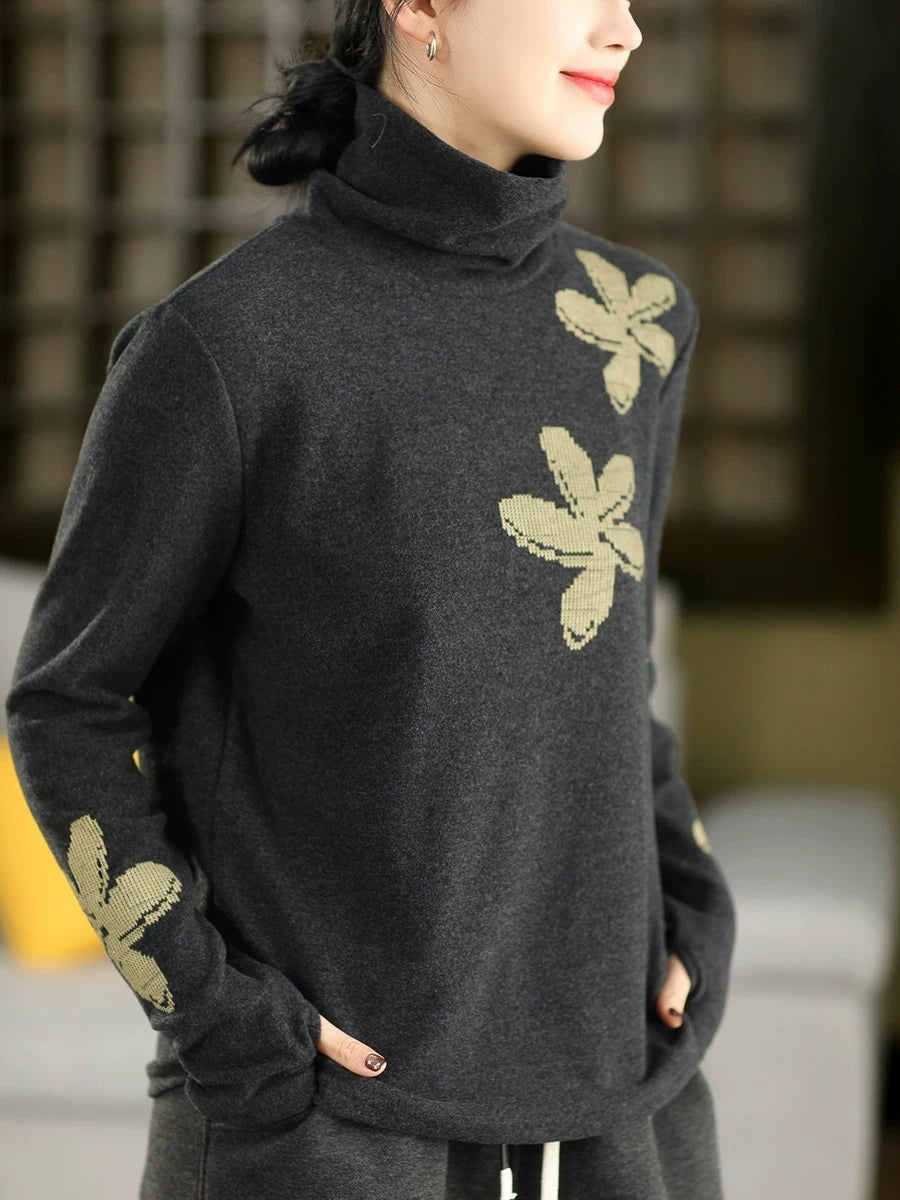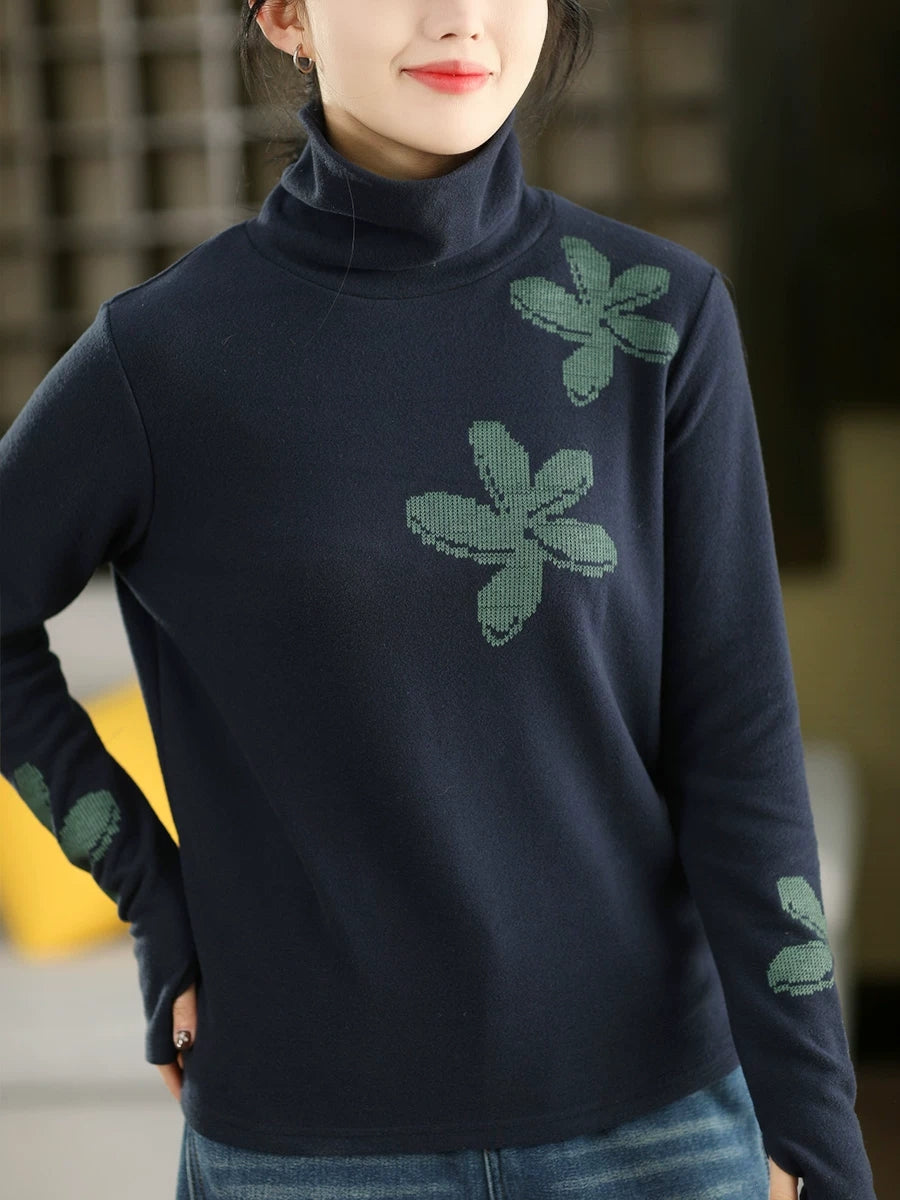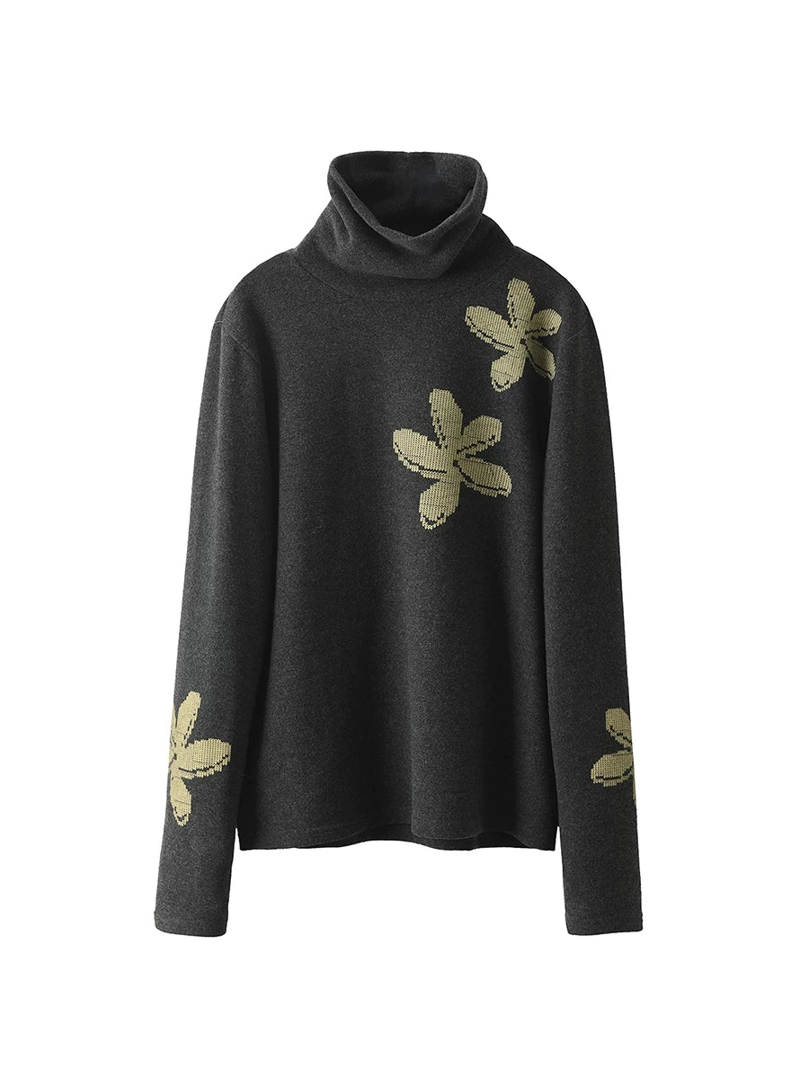 女士秋季藝術風花朵高領毛衣