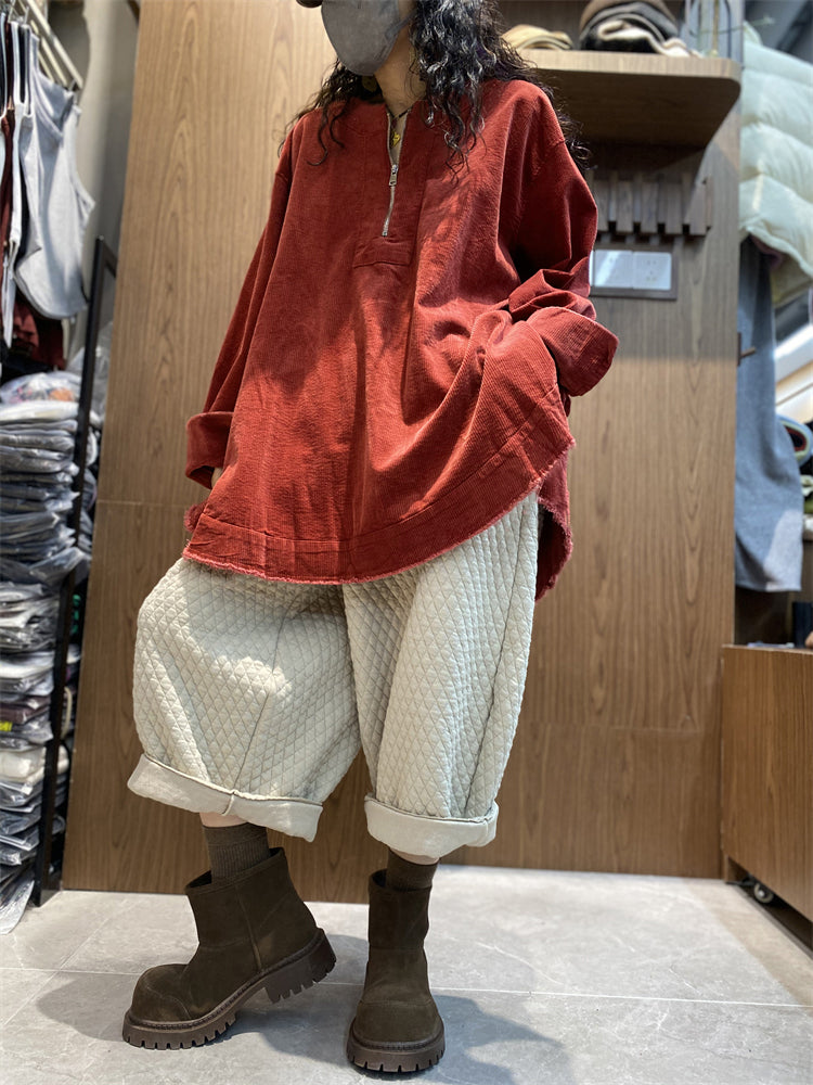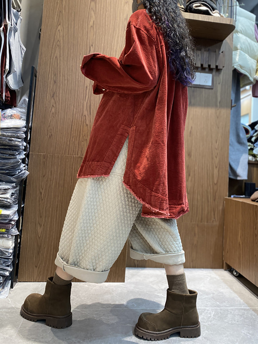 這款襯衫由苧麻製成,具有純色圖案、翻折領和寬大、規則的袖子。其藝術風格使其非常適合春秋季節穿著。
