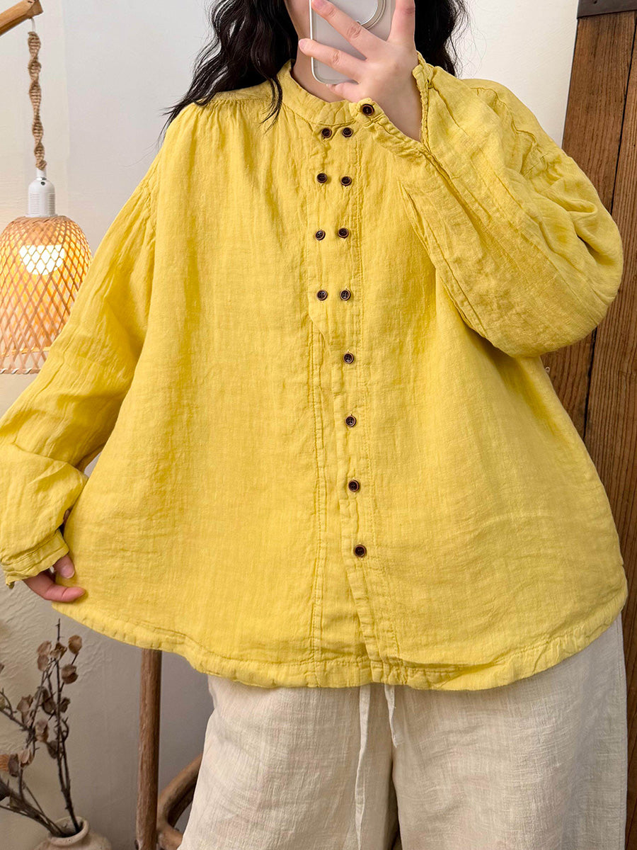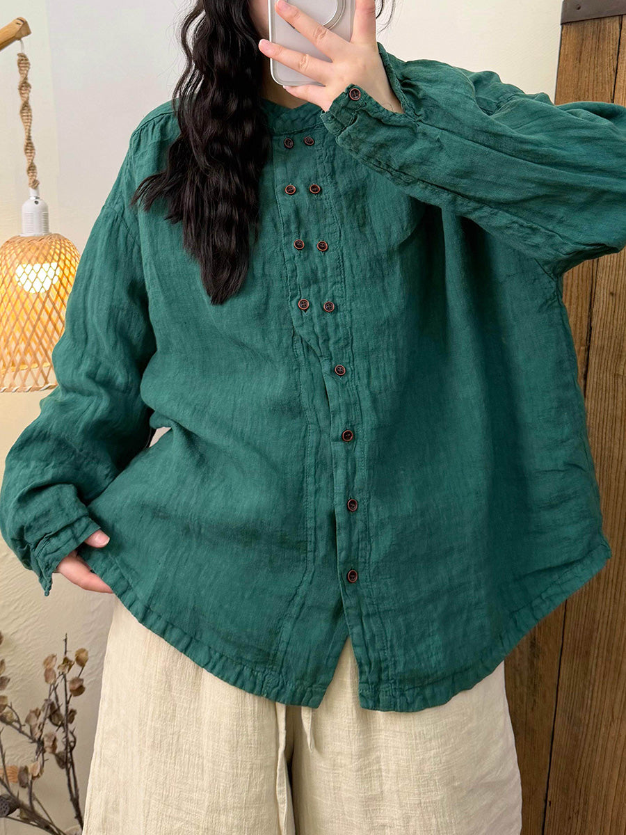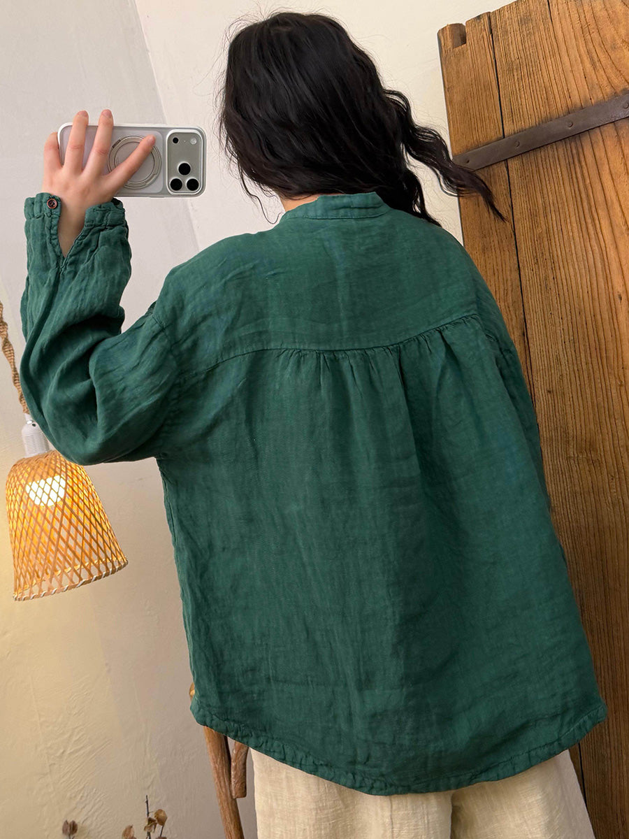 女士秋季復古純色亞麻立領襯衫